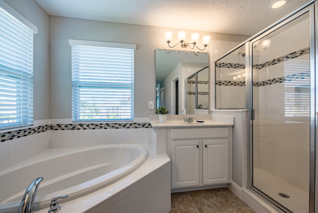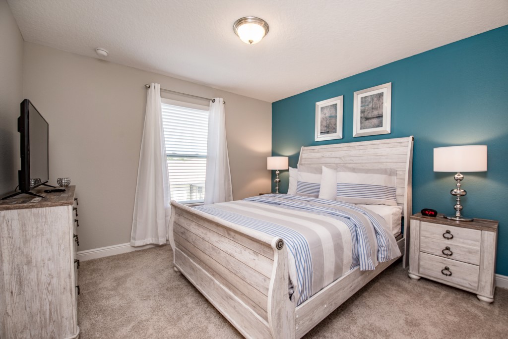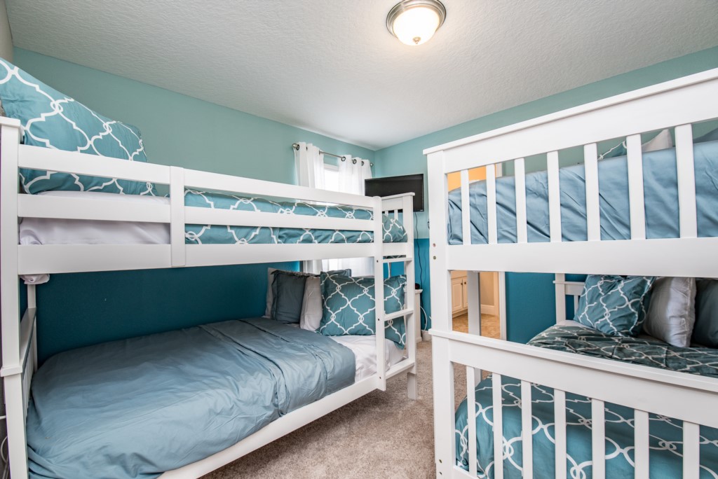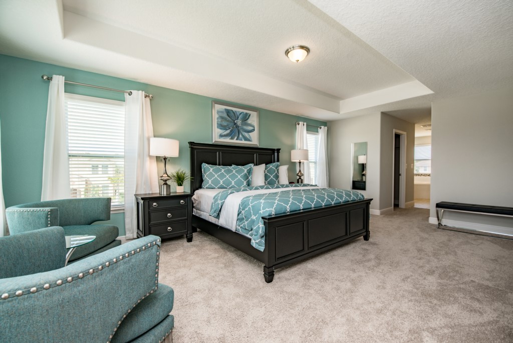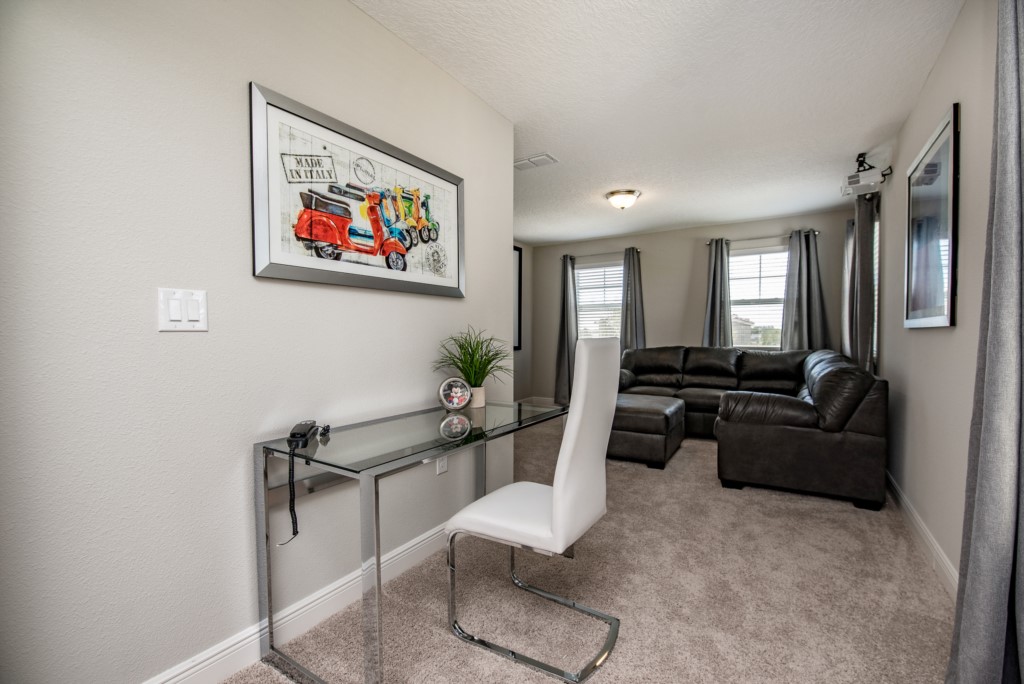 Our luxury villa offers a full living area downstairs and a separate loft area upstairs both with large flat panel tvs to enjoy a movie night and gaming on a relaxing day in from the parks. No detail has been spared as the owners have ensured that your every need is addressed from a fully stocked kitchen to the choice of refreshing paint colors. You can have a Disney area villa rental for less and get a lot less. But here in our villa rental you will have upgraded, plush mattresses for a perfect nights sleep with quality bed linens and so much more. This Solterra Resort villa rental is luxury, fun for the family, and relaxing for the adults!