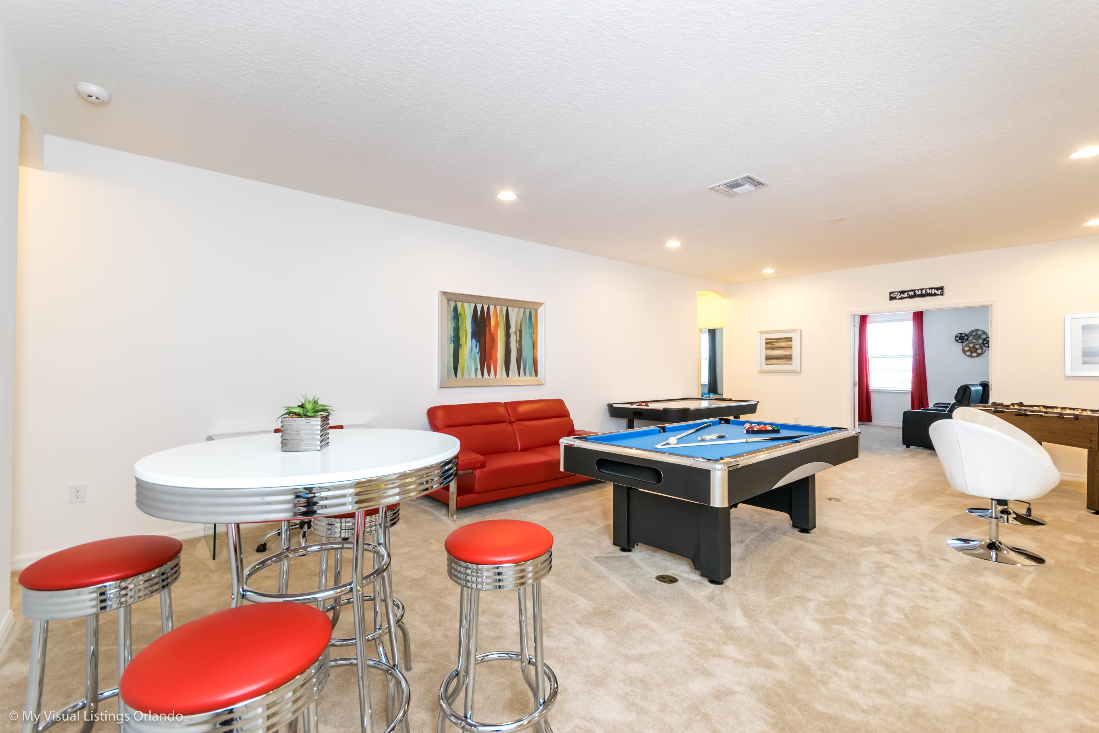 Upstairs, the loft area provides a second social gathering area, with comfortable seating, games area and flat screen TV.