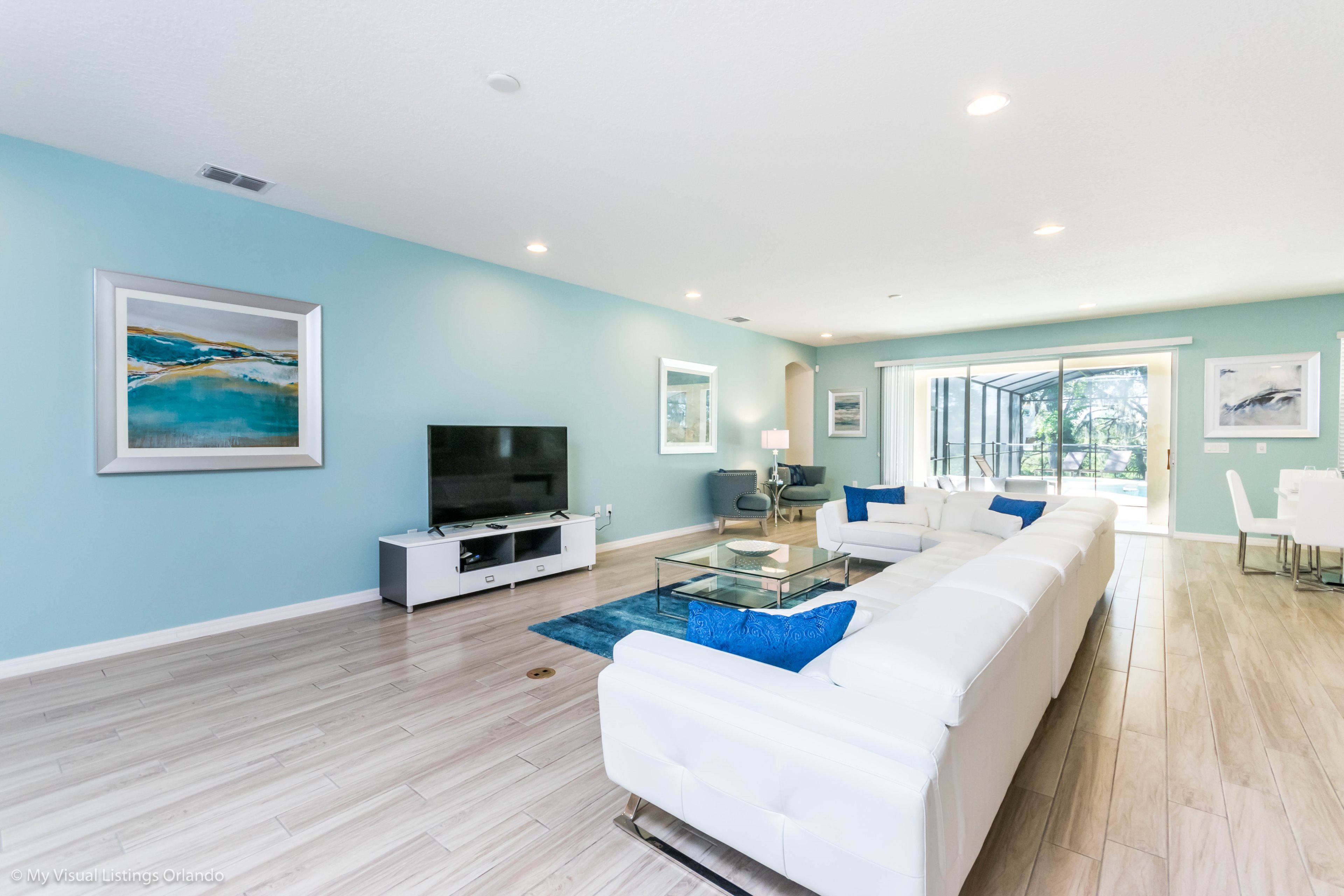 With views over the pool deck, the family living area includes comfortable seating, sectional sofa and a large flat screen TV.