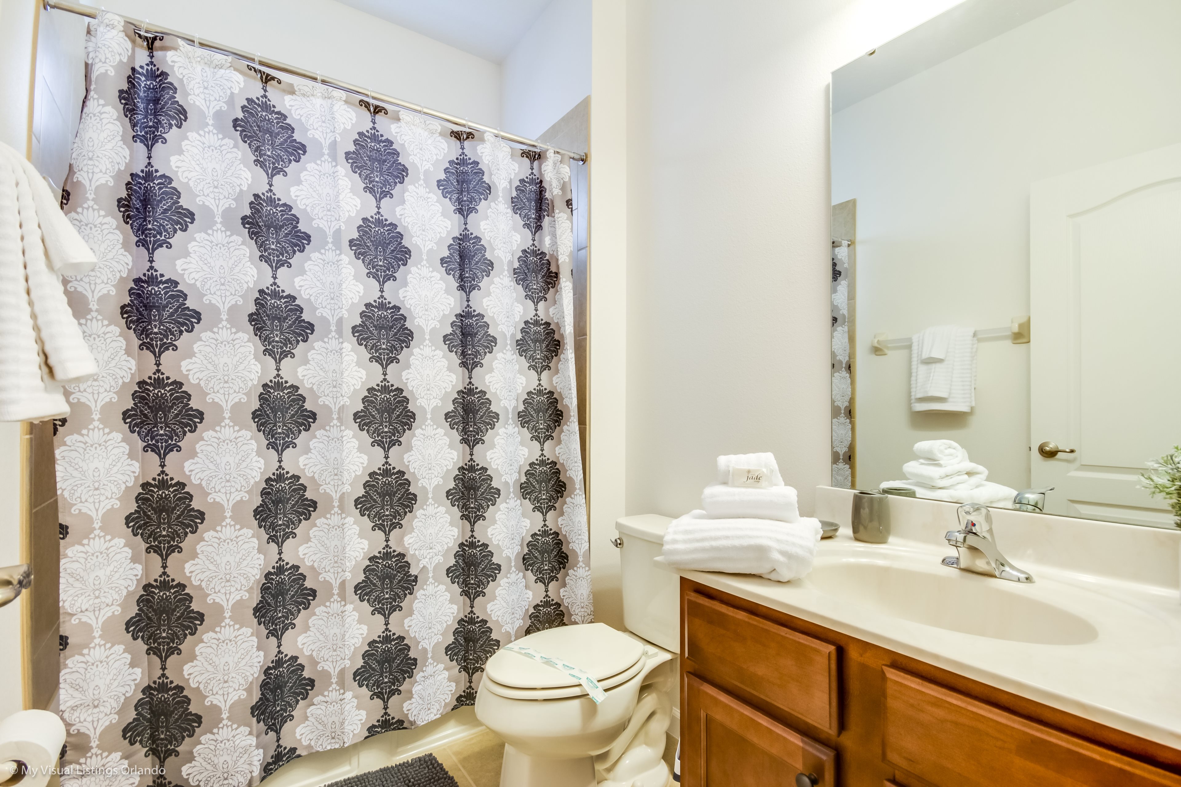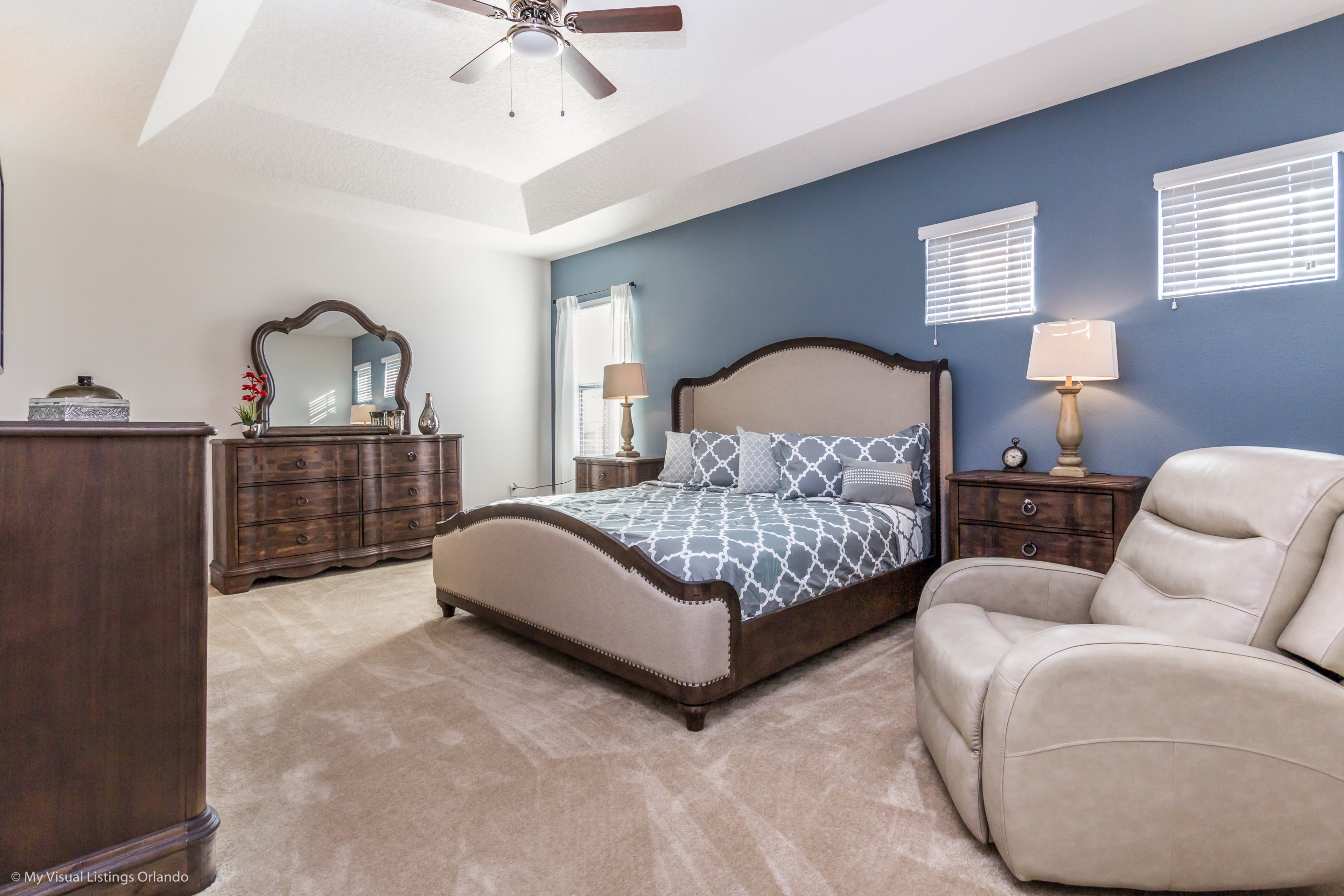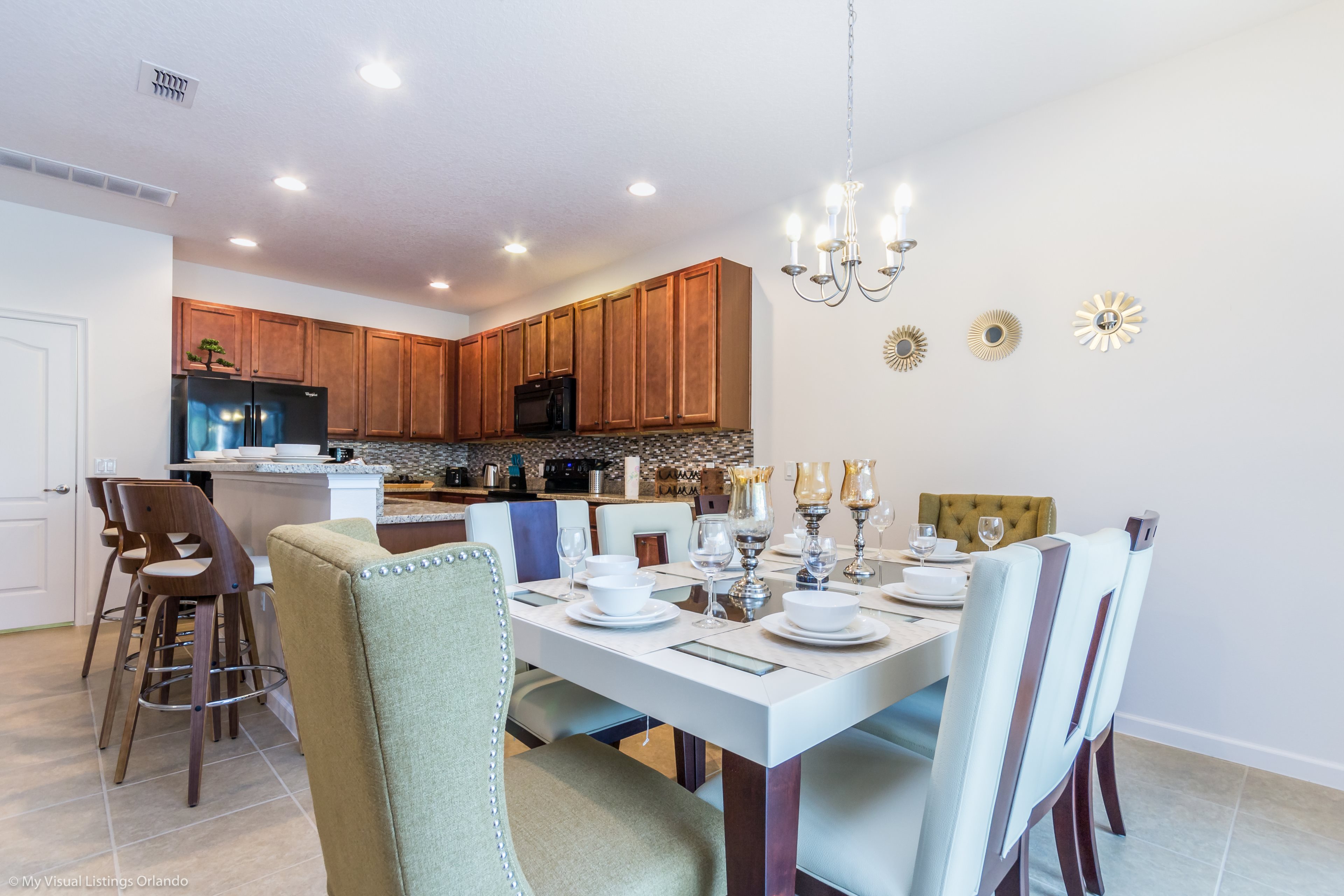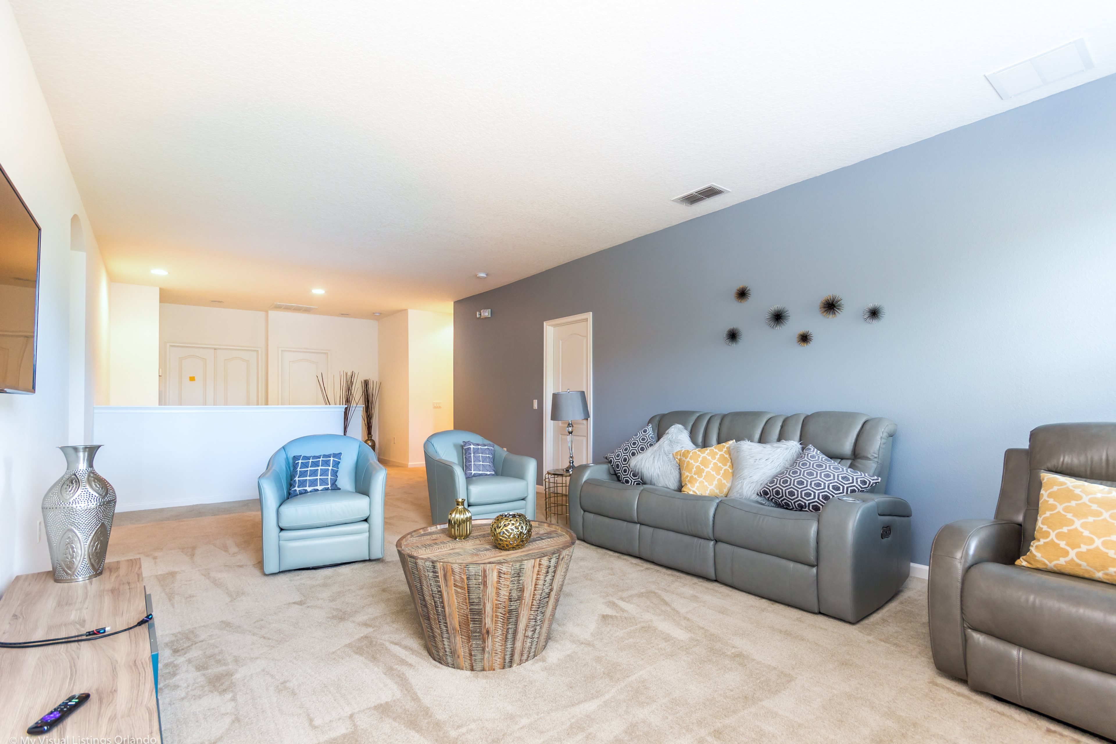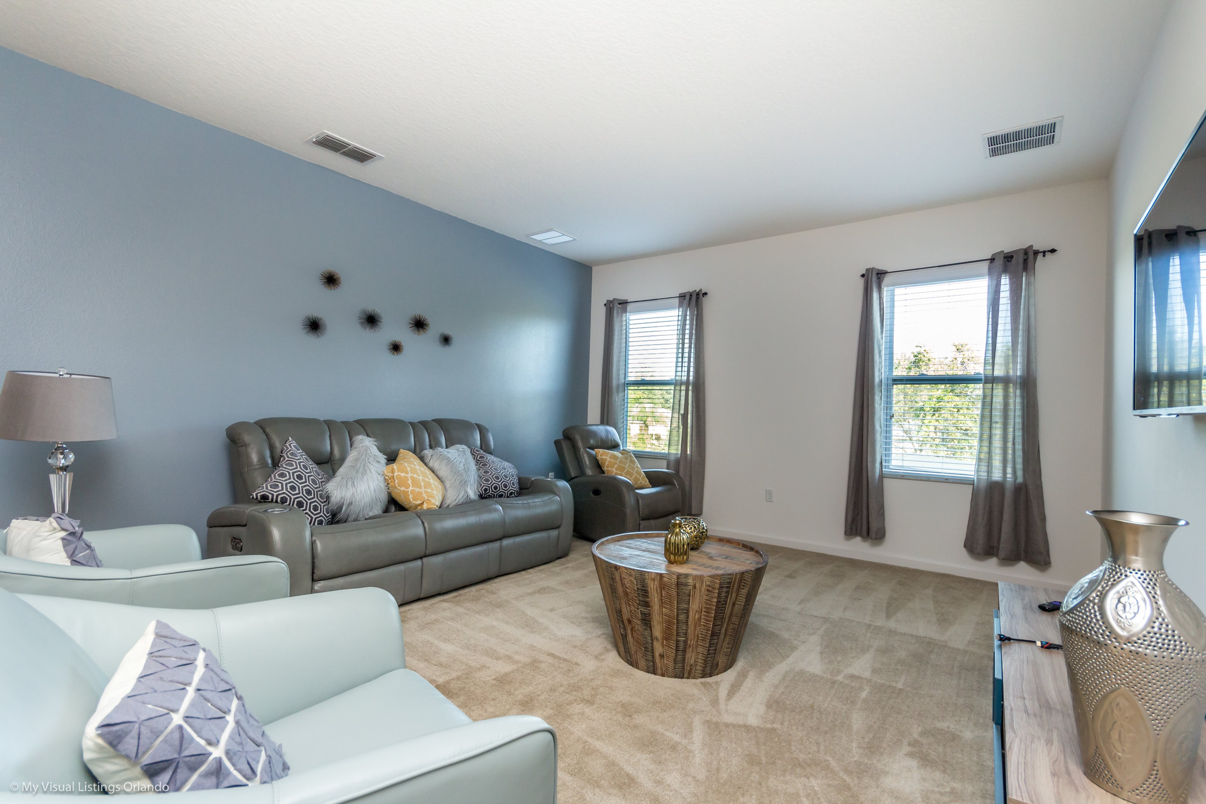 Our luxury villa offers a full living area downstairs and a separate loft area upstairs both with large flat panel tvs to enjoy a movie night and gaming on a relaxing day in from the parks. No detail has been spared as the owners have ensured that your every need is addressed from a fully stocked kitchen to the choice of refreshing paint colors. You can have a Disney area villa rental for less and get a lot less. But here in our villa rental you will have upgraded, plush mattresses for a perfect nights sleep with quality bed linens and so much more. This Solterra Resort villa rental is luxury, fun for the family, and relaxing for the adults!