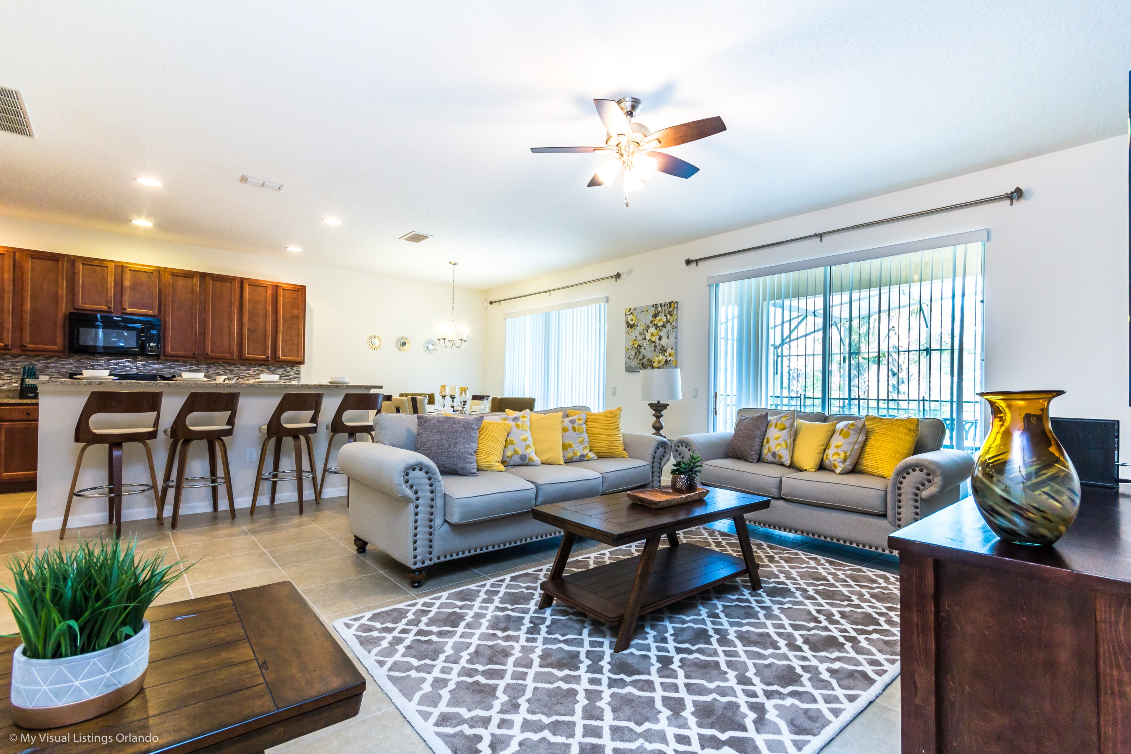 This gorgeous brand new 6 bedroom, 5 bath vacation home rental in the beautiful Solterra Resort, Davenport, Florida! There is enough space for the entire family in this open, spacious, 2 story Disney area vacation villa paradise. The location could not be any better. Only a few short minutes from Walt Disney World and Orlando's other famous attractions like Universal Studios, Seaworld, and Legoland, our Solterra Resort villa rental sits nestled off Interstate 4 and Hwy 27. Easy access to shops, restaurants, and world class golf. Solterra Resort is a secure gated community only moments from the magic but far enough to experience peace from the busy tourist district. Solterra Resort is 15 minutes to Disney with access to the Interstate only 3-5 minutes from the entrance.