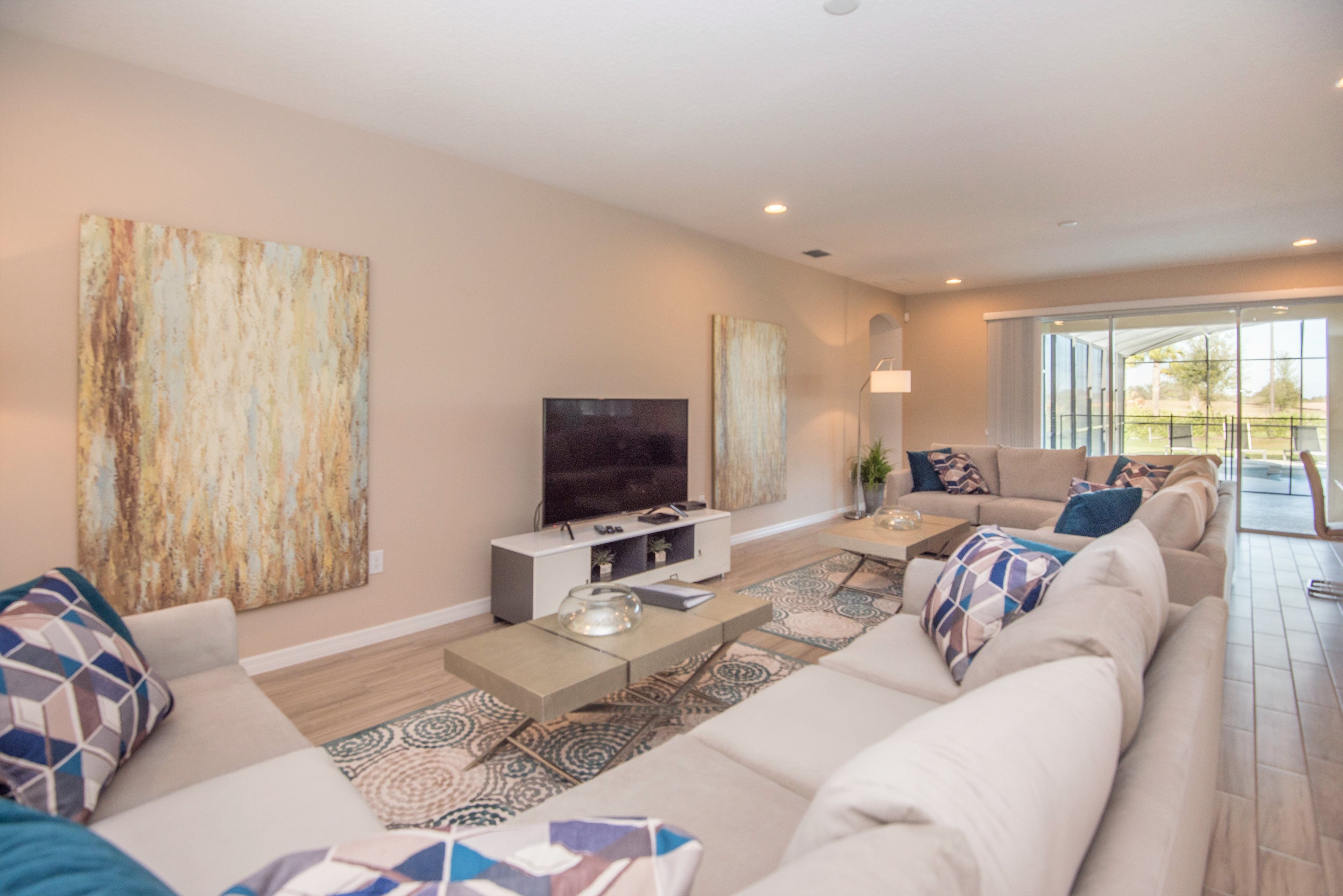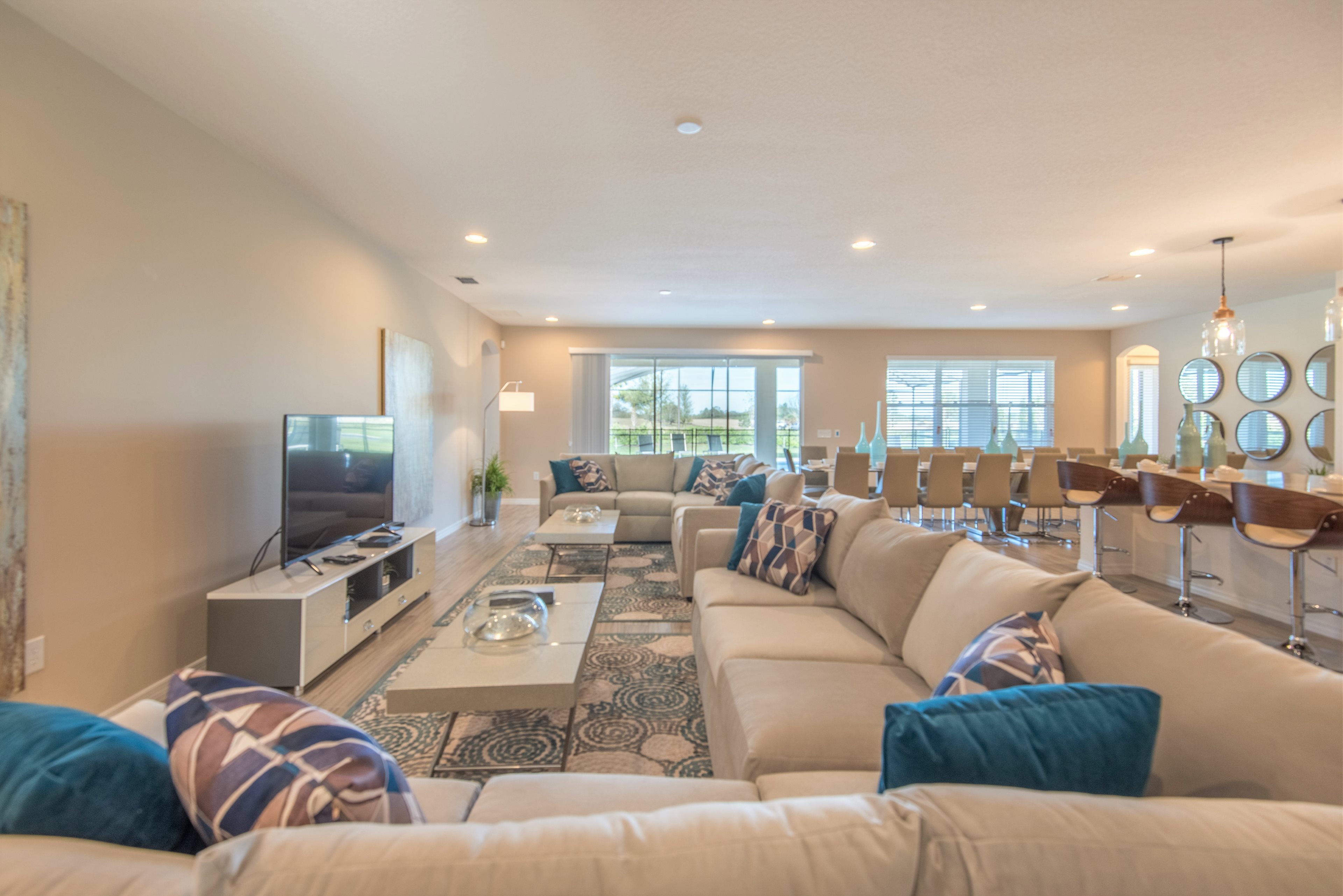 With views over the pool deck, the family living area includes comfortable seating, sectional sofa and a large flat screen TV.