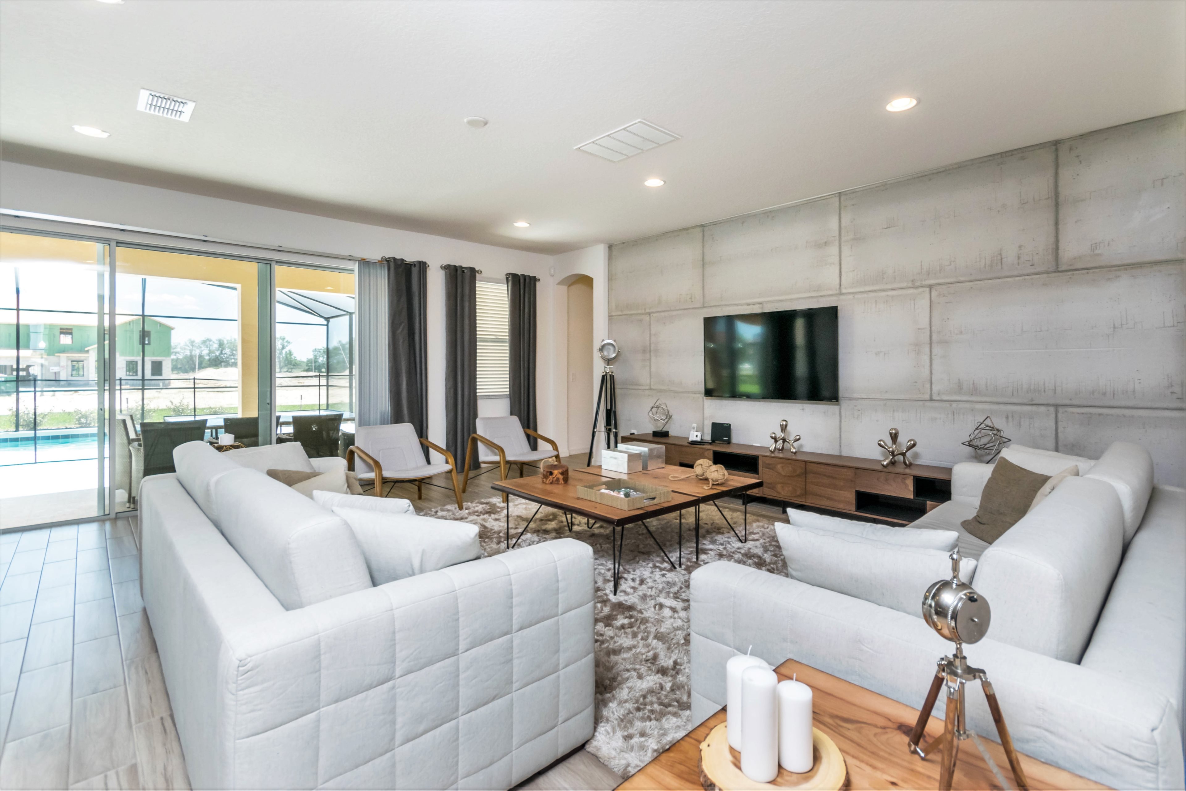 With views over the pool deck, the family living area includes comfortable seating, sectional sofa and a large flat screen TV.