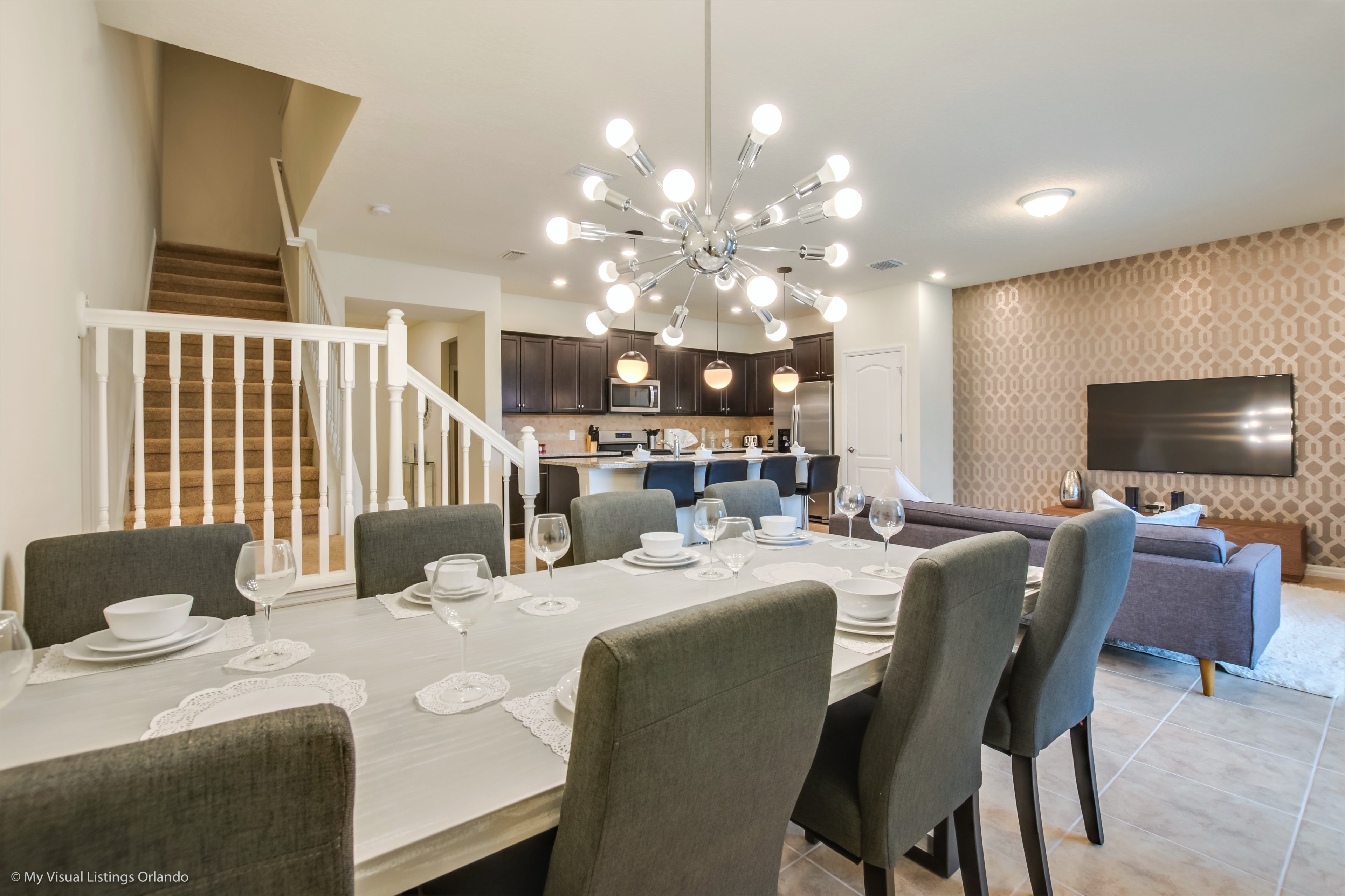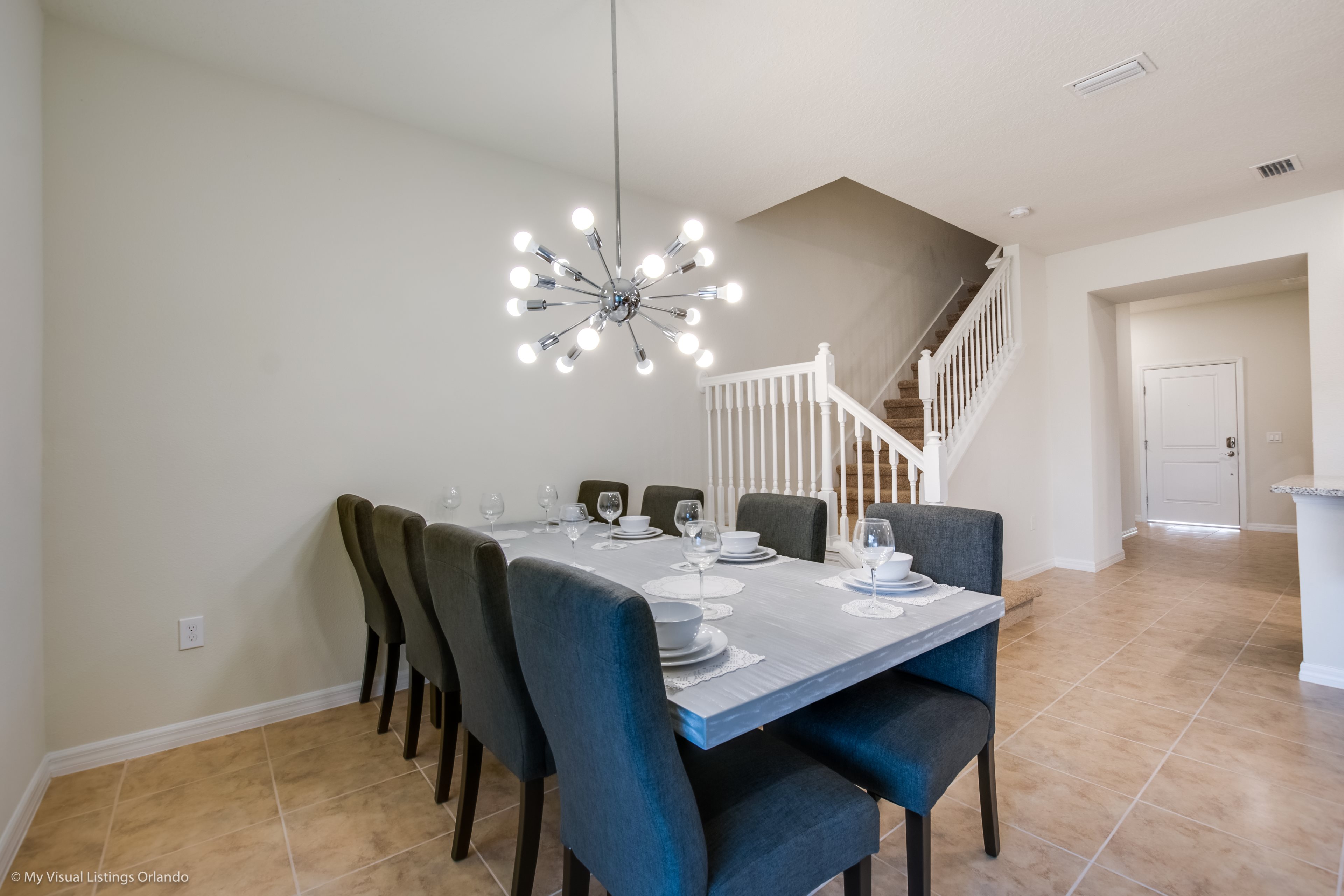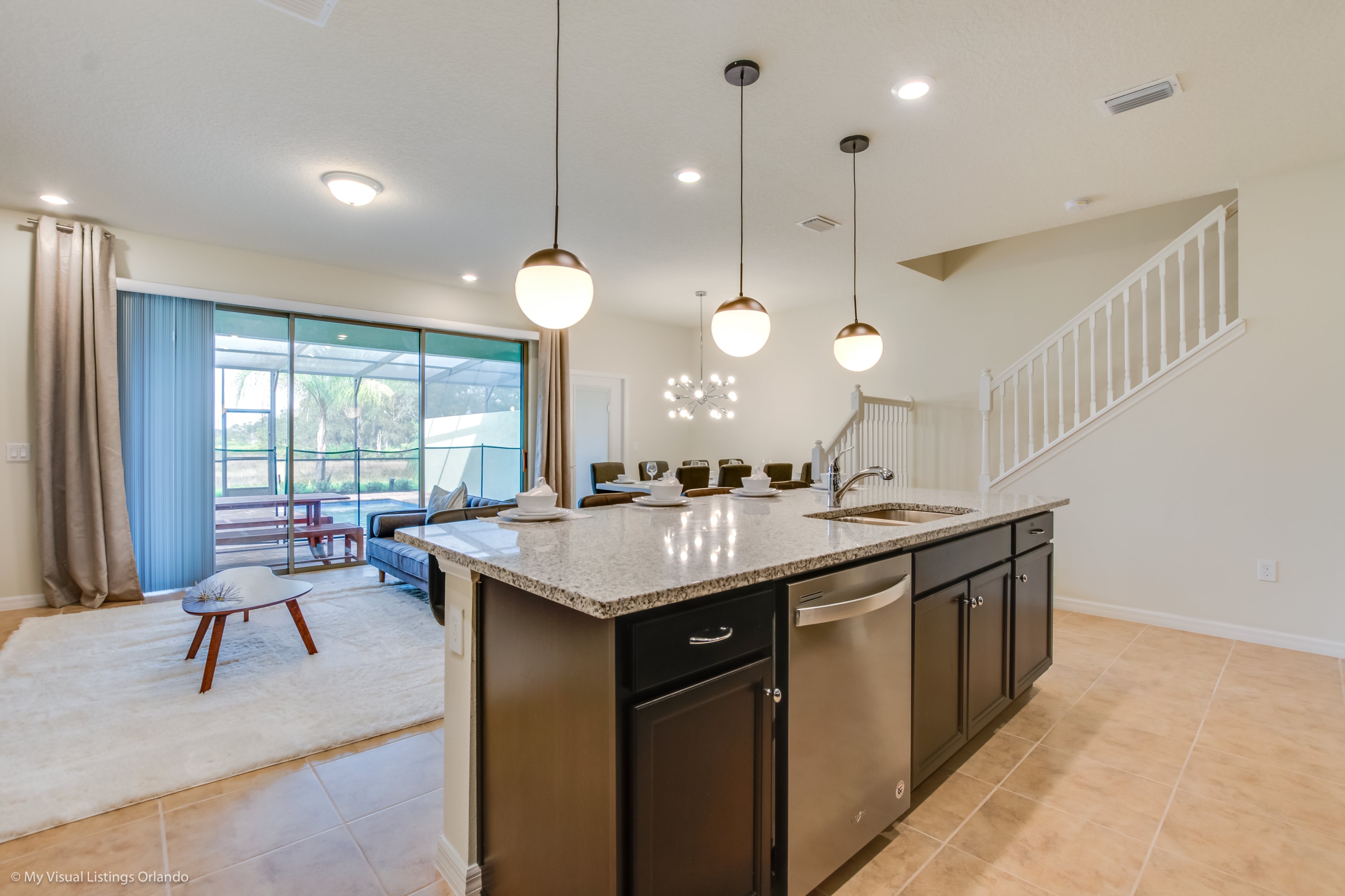 This BRAND NEW, 2 story, 5 bedroom, 5.5 bathroom vacation home-away-from-home with all the comforts and high-end touches of luxury. This townhome is perfect for families, two families to share, groups or golfing couples with wonderful tiled living areas, including a comfortable living room, study and formal and kitchen dining spaces. The beautiful white on black kitchen has all the gadgets and appliances you could need. An extended Kitchen bar allows for seating for 3 along with a breakfast table for up to 6. The kitchen is also equipped with a dishwasher, side-by-side fridge freezer, microwave and gas burner stove. It has all you need for in home dining with blender, toaster and coffee machine to compliment the various bakeware, flatware, utensils and dinnerware.