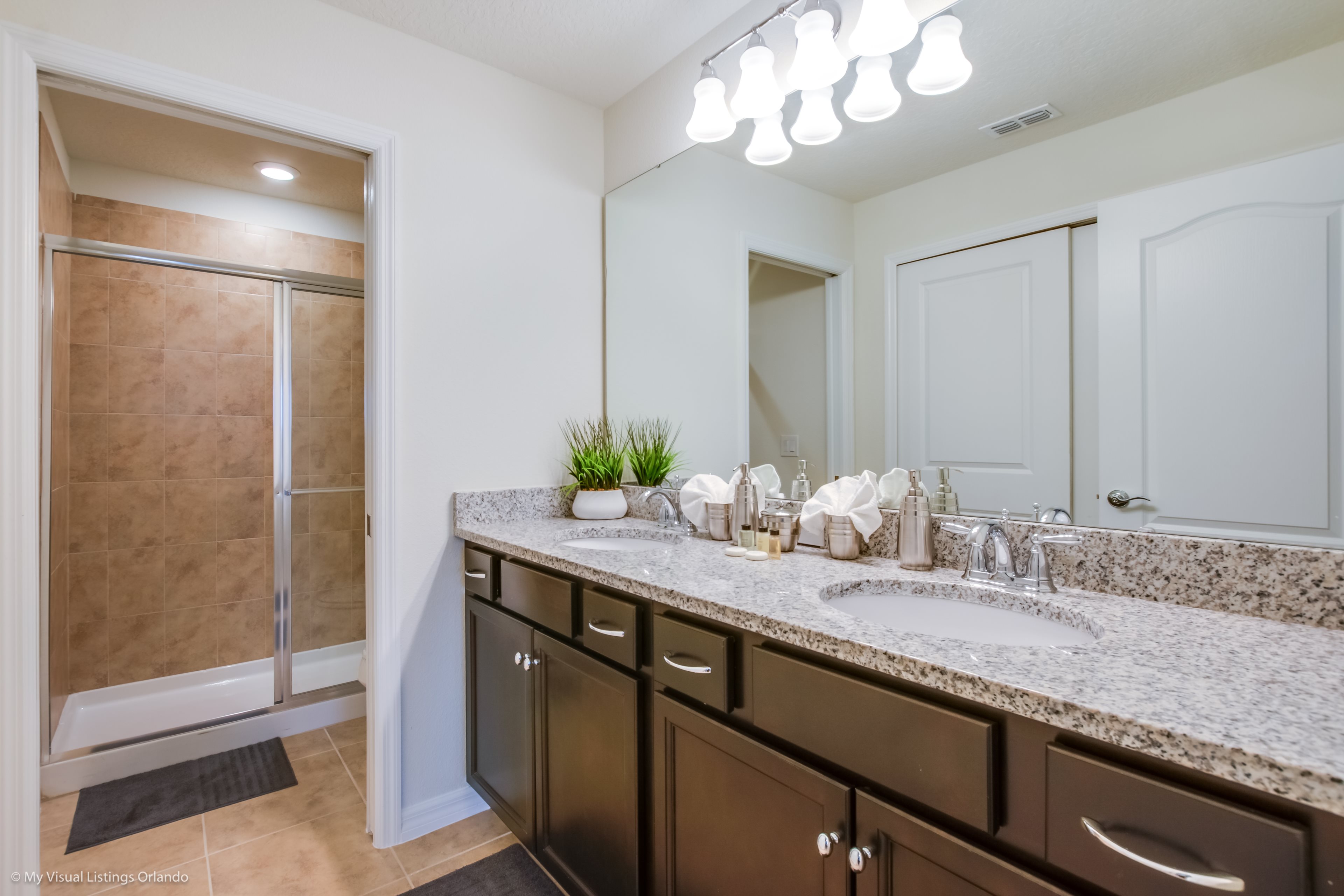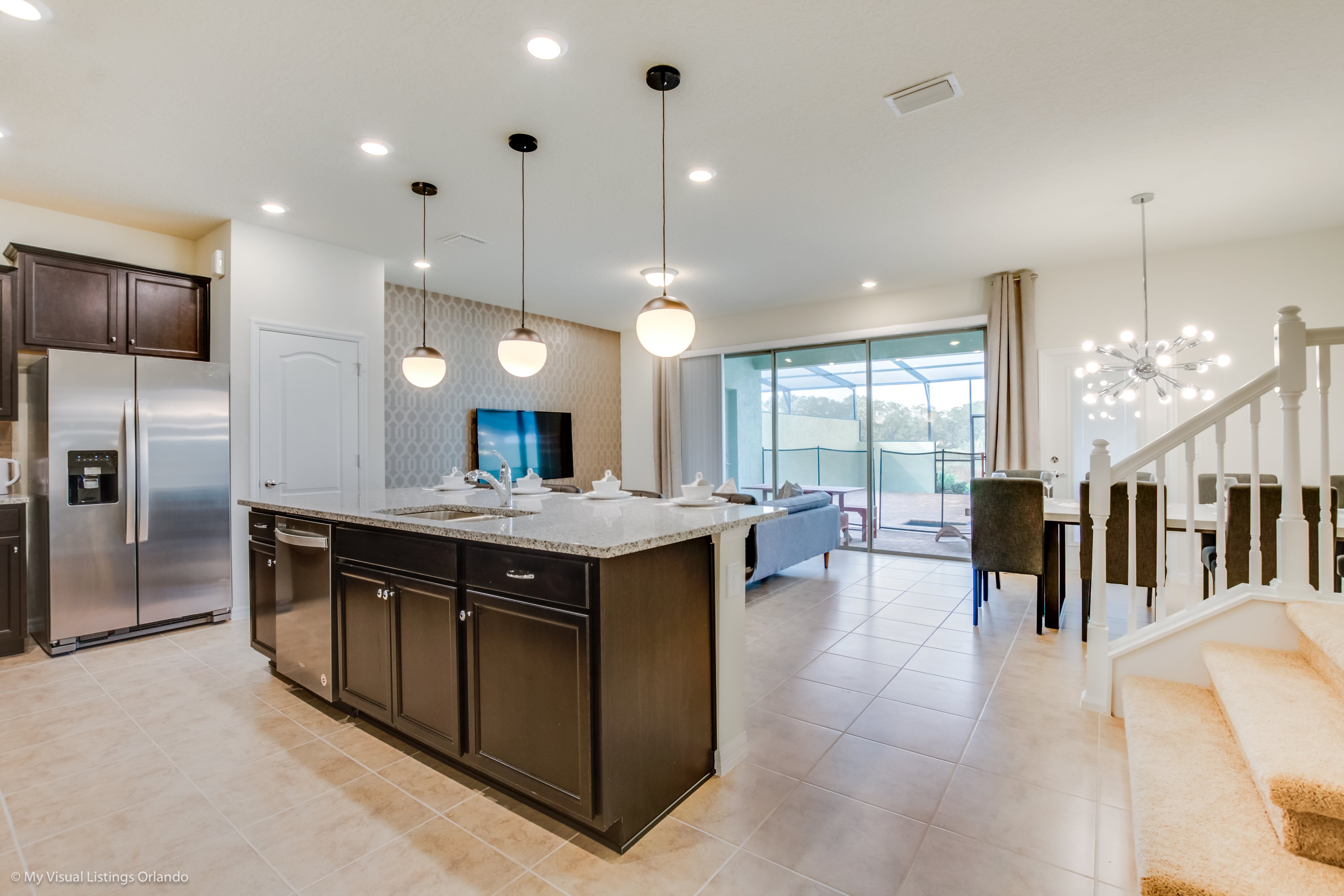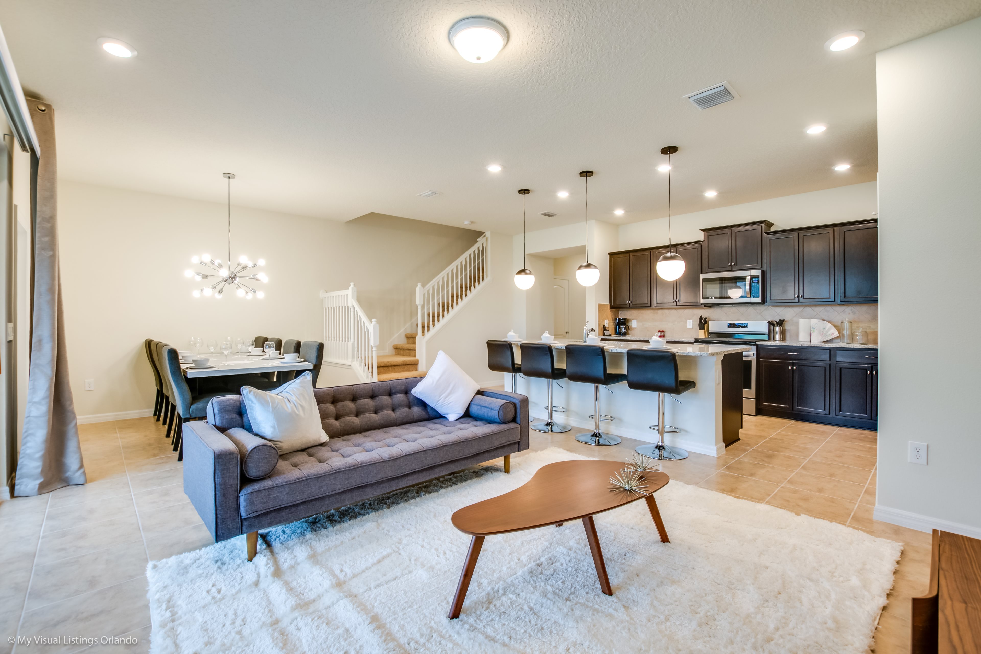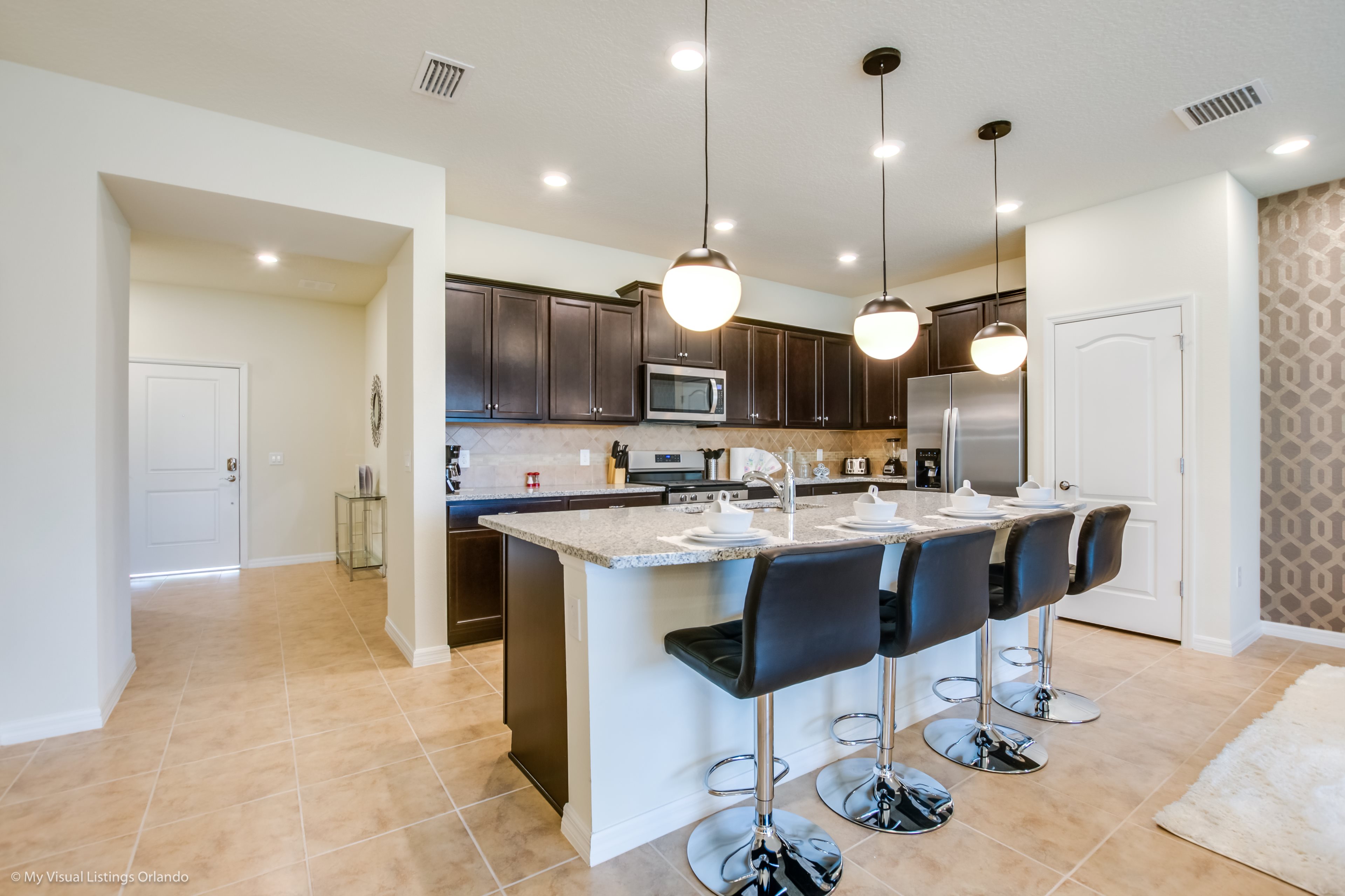 This BRAND NEW, 2 story, 5 bedroom, 5.5 bathroom vacation home-away-from-home with all the comforts and high-end touches of luxury. This townhome is perfect for families, two families to share, groups or golfing couples with wonderful tiled living areas, including a comfortable living room, study and formal and kitchen dining spaces. The beautiful white on black kitchen has all the gadgets and appliances you could need. An extended Kitchen bar allows for seating for 3 along with a breakfast table for up to 6. The kitchen is also equipped with a dishwasher, side-by-side fridge freezer, microwave and gas burner stove. It has all you need for in home dining with blender, toaster and coffee machine to compliment the various bakeware, flatware, utensils and dinnerware.