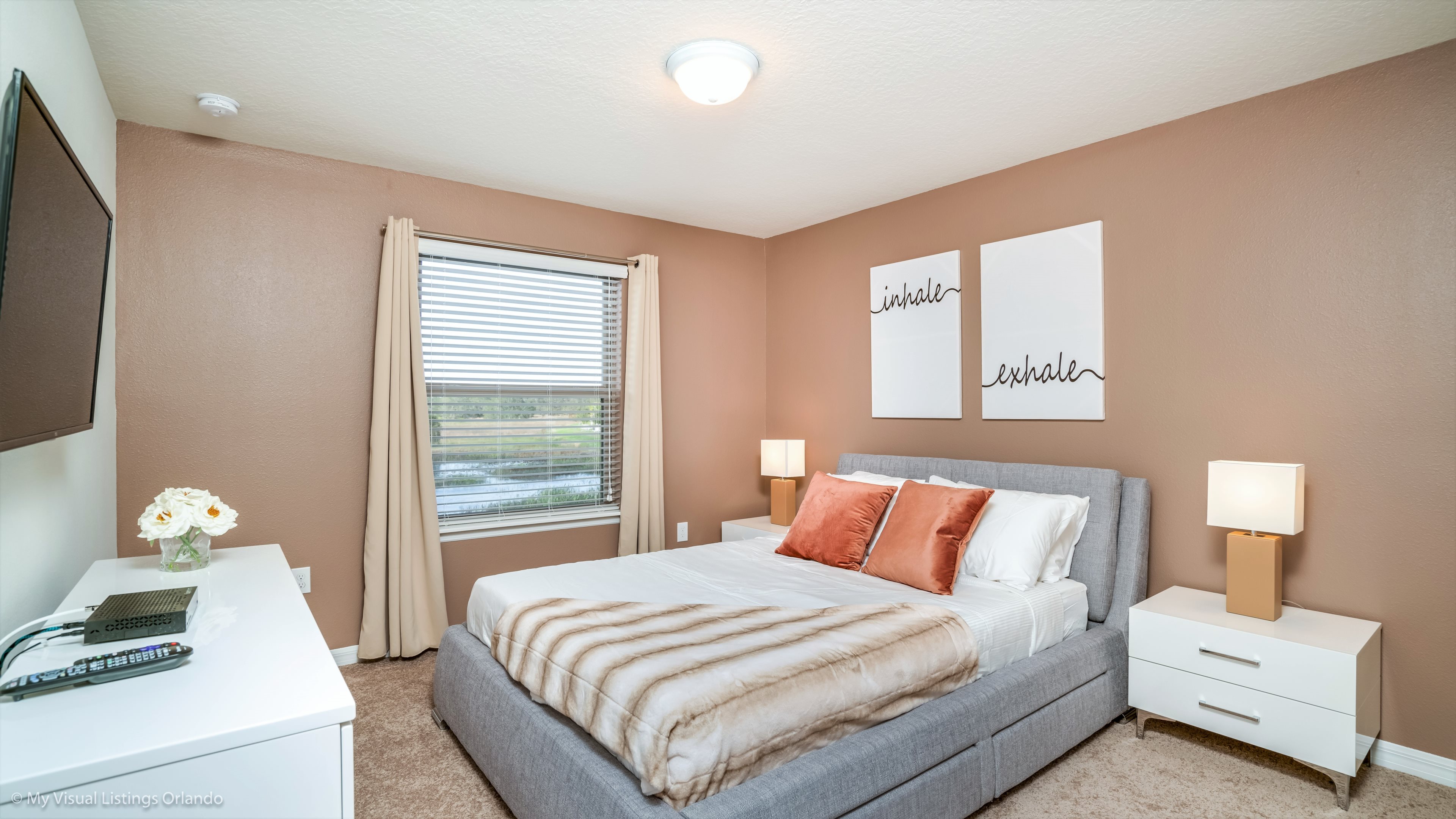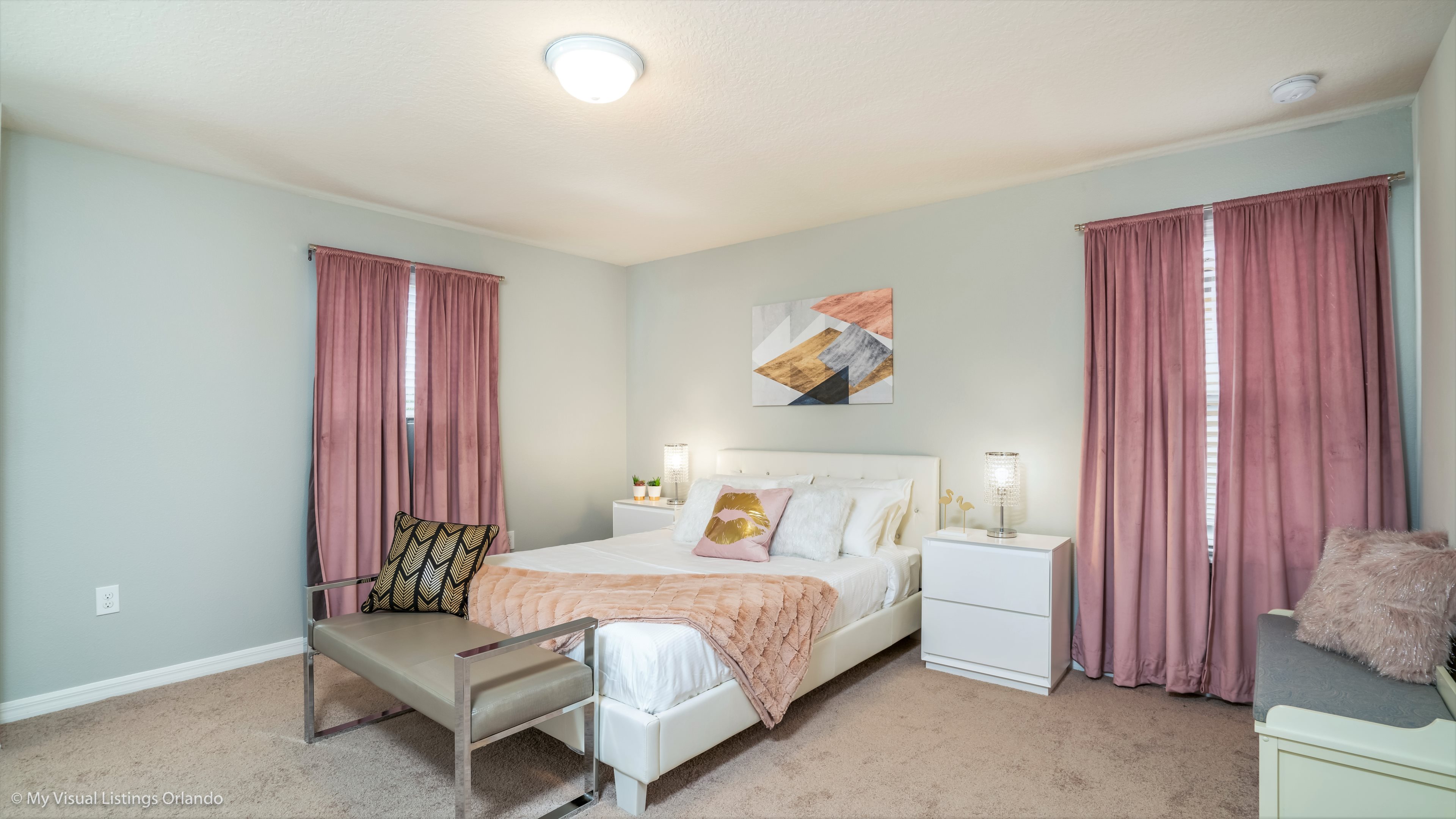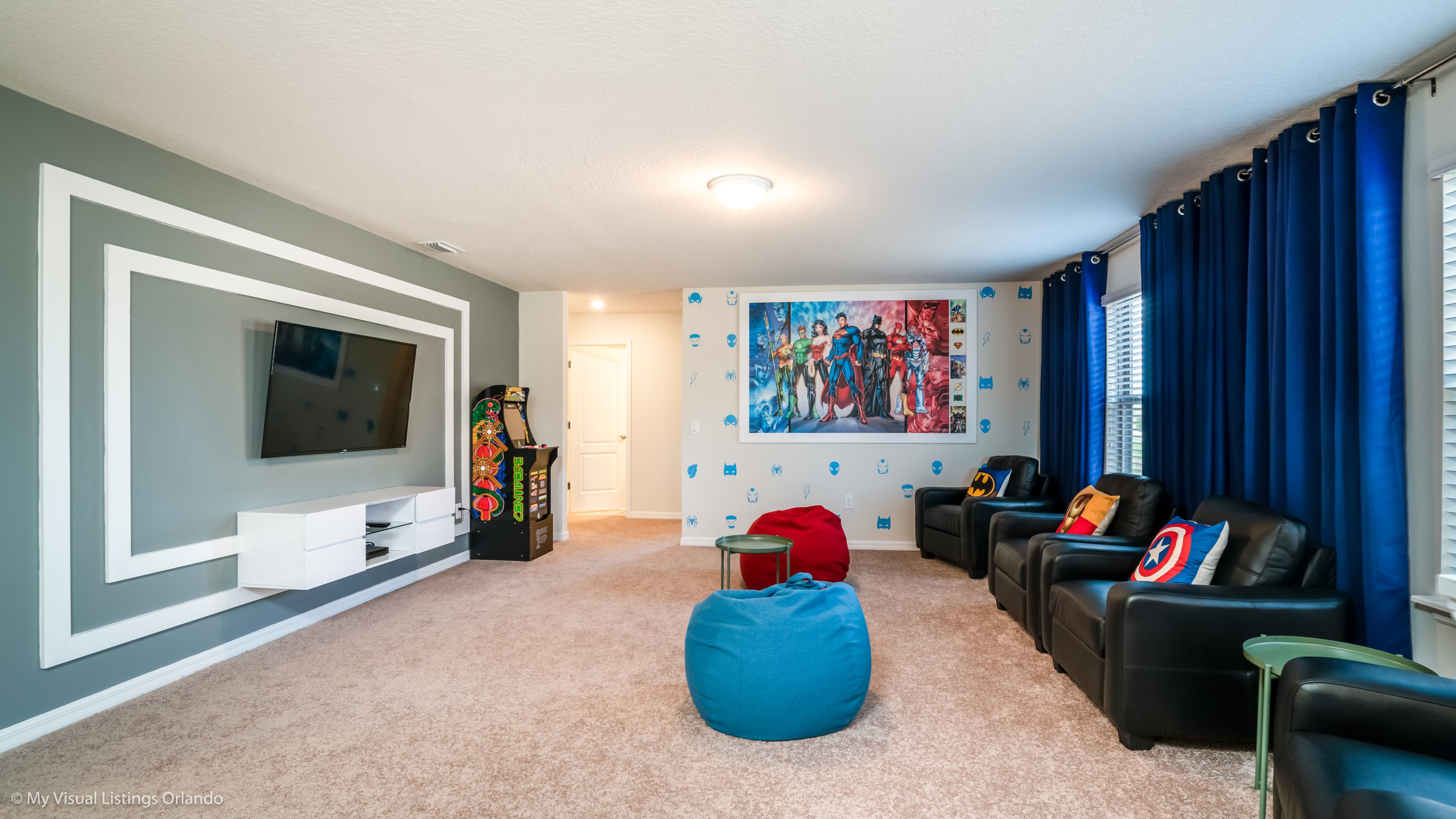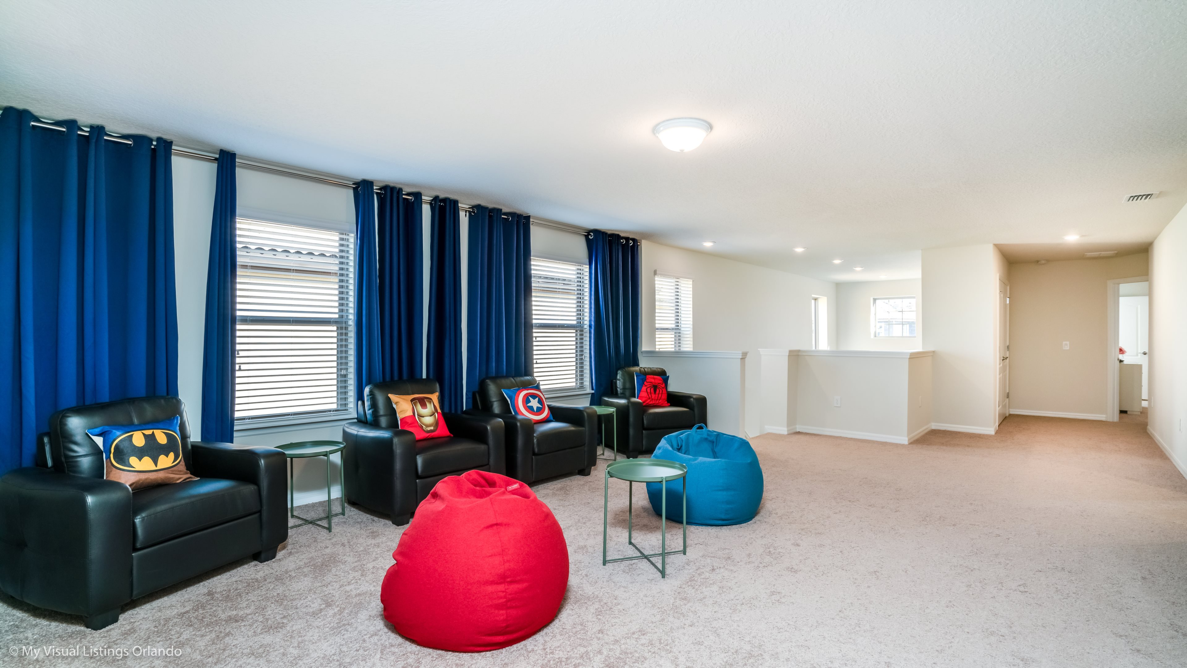 Our luxury villa offers a full living area downstairs and a separate loft area upstairs both with large flat panel tvs to enjoy a movie night and gaming on a relaxing day in from the parks. No detail has been spared as the owners have ensured that your every need is addressed from a fully stocked kitchen to the choice of refreshing paint colors. You can have a Disney area villa rental for less and get a lot less. But here in our villa rental you will have upgraded, plush mattresses for a perfect nights sleep with quality bed linens and so much more. This Solterra Resort villa rental is luxury, fun for the family, and relaxing for the adults!