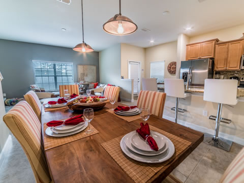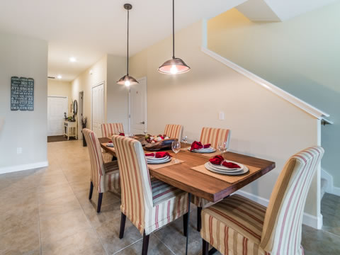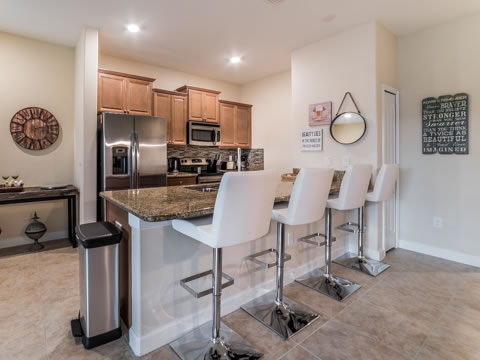 As you enter this townhome, you are greeted with signs of relaxation. The warm and inviting feel of the living room makes it the perfect place to gather for a fun movie night. The magnificent kitchen is the perfect place to cook a family dinner with its upgraded appliances. The granite countertops, backsplash and view of the pool add a nice touch of elegance. The breakfast bar and dining room table are also great to hang out or enjoy a meal all together.