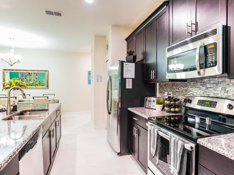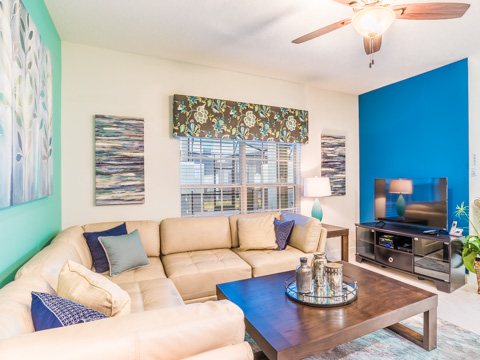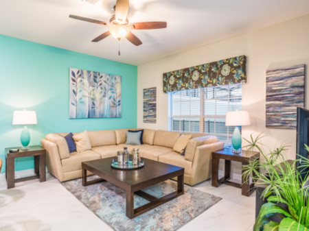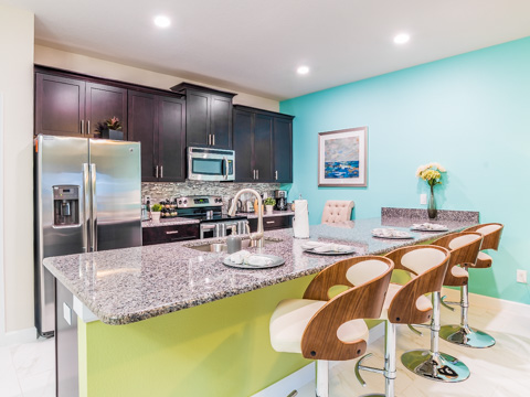 As you plan your next trip to the sunshine state, this gorgeous 4 bedroom, 3 bathroom vacation rental, located in Storey Lake Resort, will ensure you have an amazing vacation. The bedrooms consist of 2-king bedrooms and 2 bedrooms with a twin and double bed sleeping a total of 8. Besides being professionally decorated throughout, this home includes a 50-inch flat screen and a Blu ray DVD player. There is plenty of seating, both at the dining room and the kitchen bar – perfect for sharing meals together. Speaking of meals, the kitchen is stunning, with upgraded cabinetry and tile along with stainless steel appliances and granite counter tops. There is also FREE WIFI and a washer and dryer for your convenience.