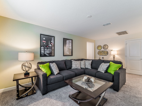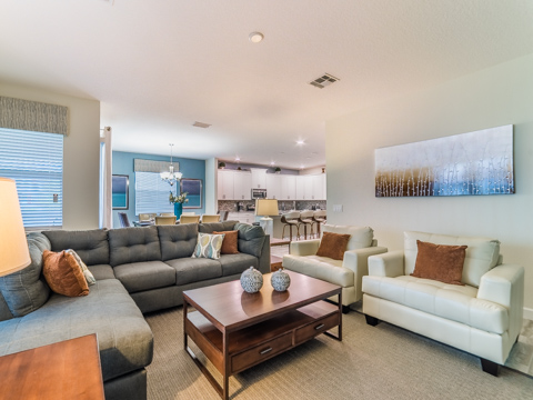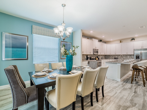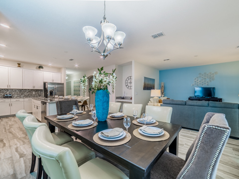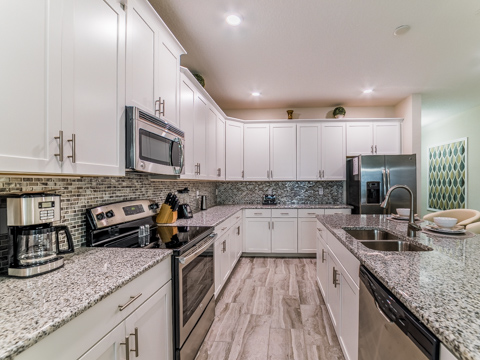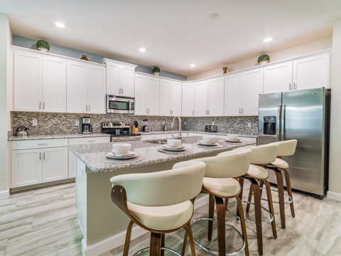 This 6 bedroom and 5 bathroom home provides everyone in your party with plenty of space to call their own for your vacation to the Orlando area. With 2 king bedrooms, 1 queen bedroom, 1 bedroom with a full and twin and then 2 bedrooms with 2 twin beds, everyone will have their own space. The kitchen in this home presents itself to any aspiring chef. With beautiful cabinetry, upgraded appliances and much more, anyone will be happy to cook here. The kitchen overlooks the 8 person dining room table as well as the breakfast bar which provides ample seating for all family dinners.
