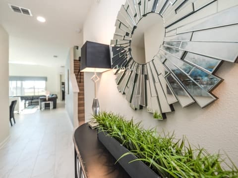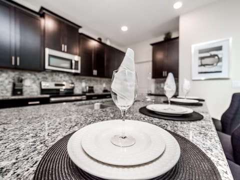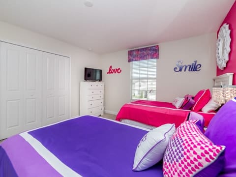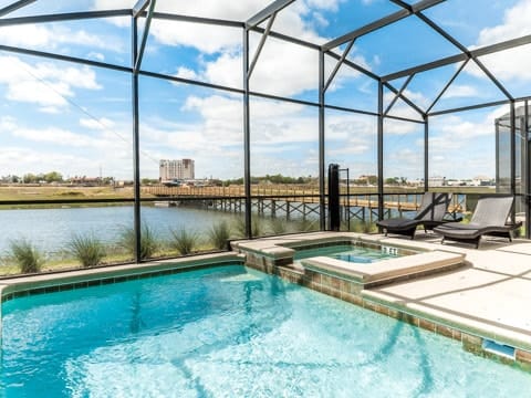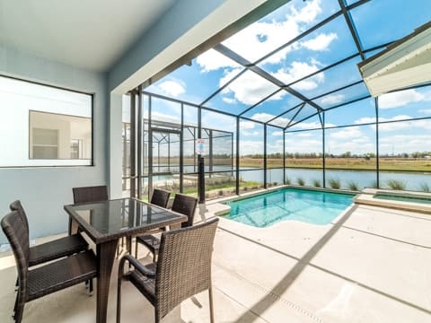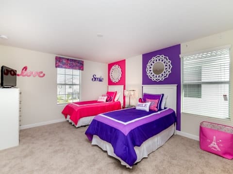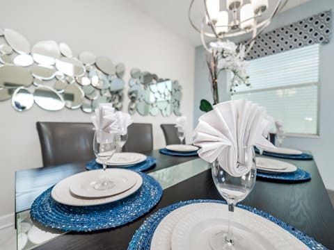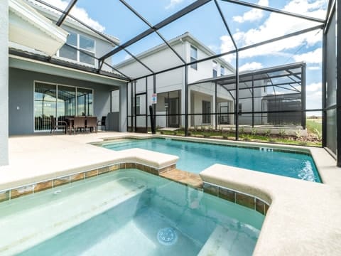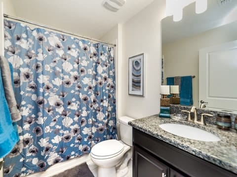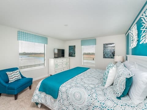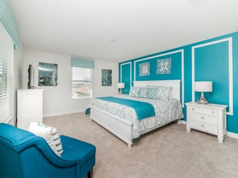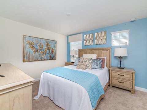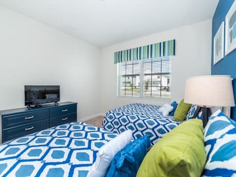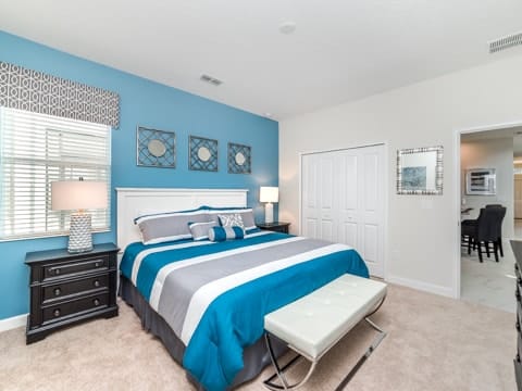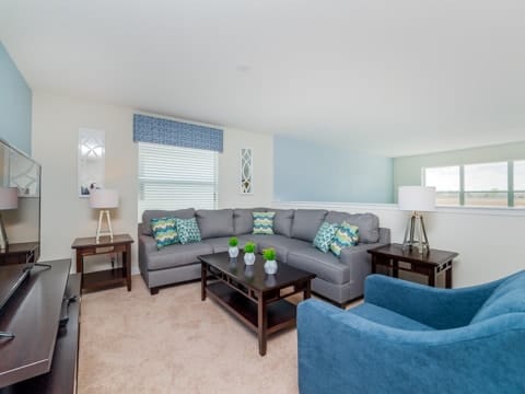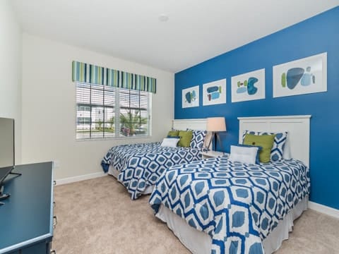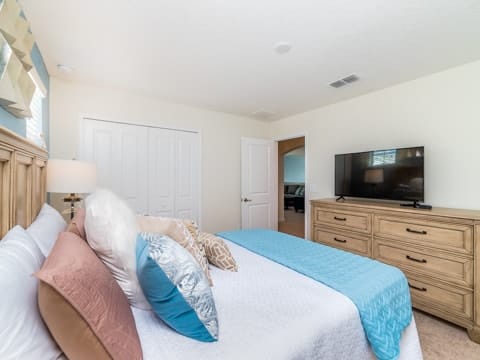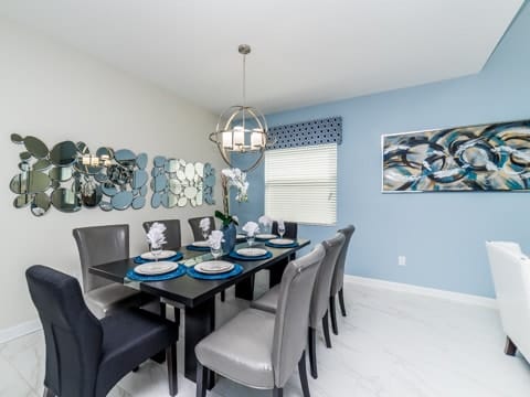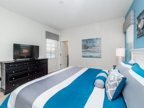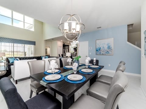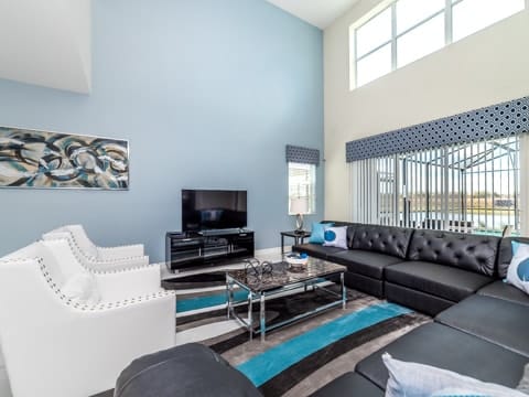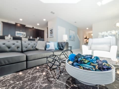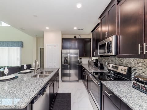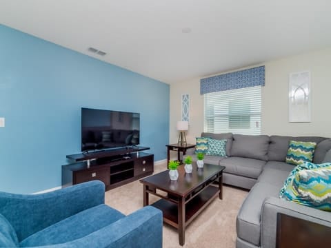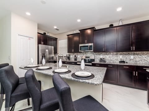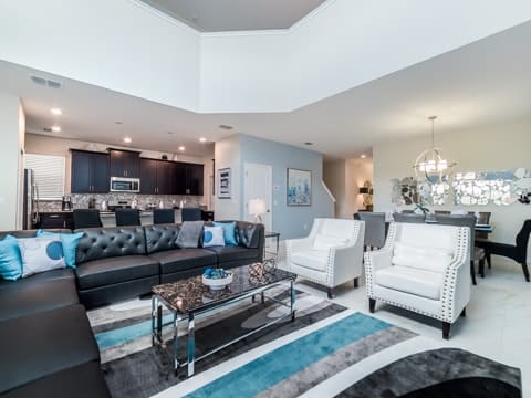 Begin your perfect Orlando getaway by staying in this luxurious Storey Lake home. As you enter, this home brings together notes of comfort and Florida style. The downstairs living room features a large, leather wraparound couch centered around a 55" flat screen TV. The blues and grays of the decor provide a cozy atmosphere for you and your guests. The living room flows into the dining room which seats 8. The breakfast bar, seating 4 more, overlooks the gourmet kitchen. Breakfast, lunch and dinner can be made fresh and served in this large kitchen. Upgraded appliances, granite countertops and new upgraded cabinetry add to the opulence of this home. If you need even more room in this home, you can head upstairs to the huge loft area which also features seating and a flat screen TV. With 5 bedrooms and 5 bathrooms, this home easily sleeps up to 10 guests. The 2 king bedrooms, 1 queen bedroom, 1 bedroom with a full and twin and 1 bedroom with 2 twins will allow you and your guests to find their perfect place to call home on your vacation. This home has free wifi as well as a washer and dryer available for you to use for your convenience. Do not forget the best part of this home which is the pool and spa. In the back of the house, you have all that you need for a day of entertainment. Lay out by the pool and enjoy the warm weather while in sunny Florida. Storey lake also provides the perfect access to all that Orlando has to offer. Minutes from shopping, the Disney theme parks and more, this gated community is the perfect place for you and your guests. We can’t wait to see you here!