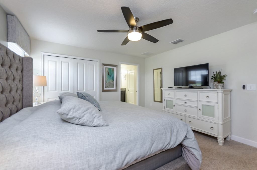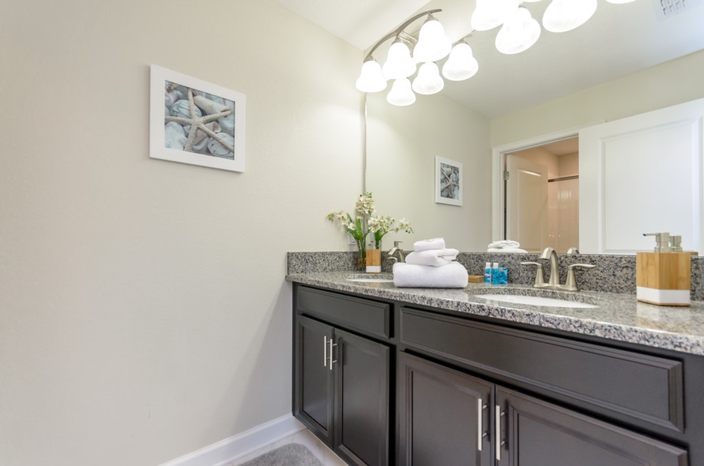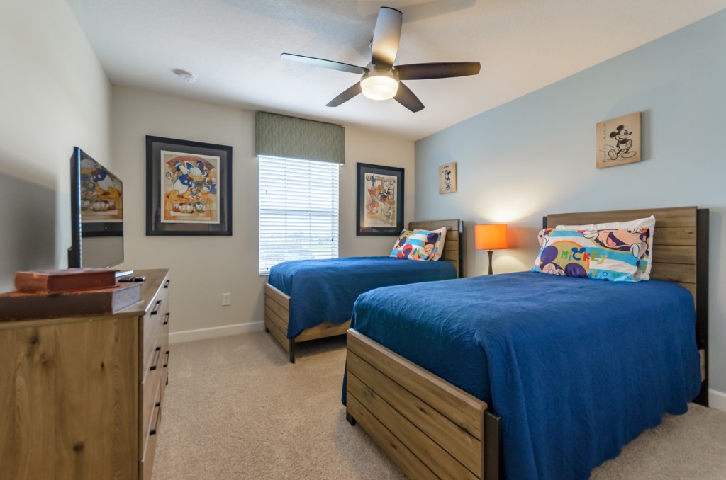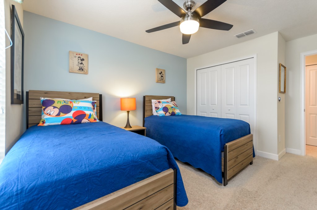 Head upstairs to find 3 Bedrooms. The Master bedroom en-suite features a King size bed and flat screen TV with it's own private shower. The kids will love the sports themed room with 2 Twin beds and the Mickey themed with 2 Twin beds. The 2 twin bedrooms share a bathroom upstairs and the laundry room is also located upstairs for your convenience.