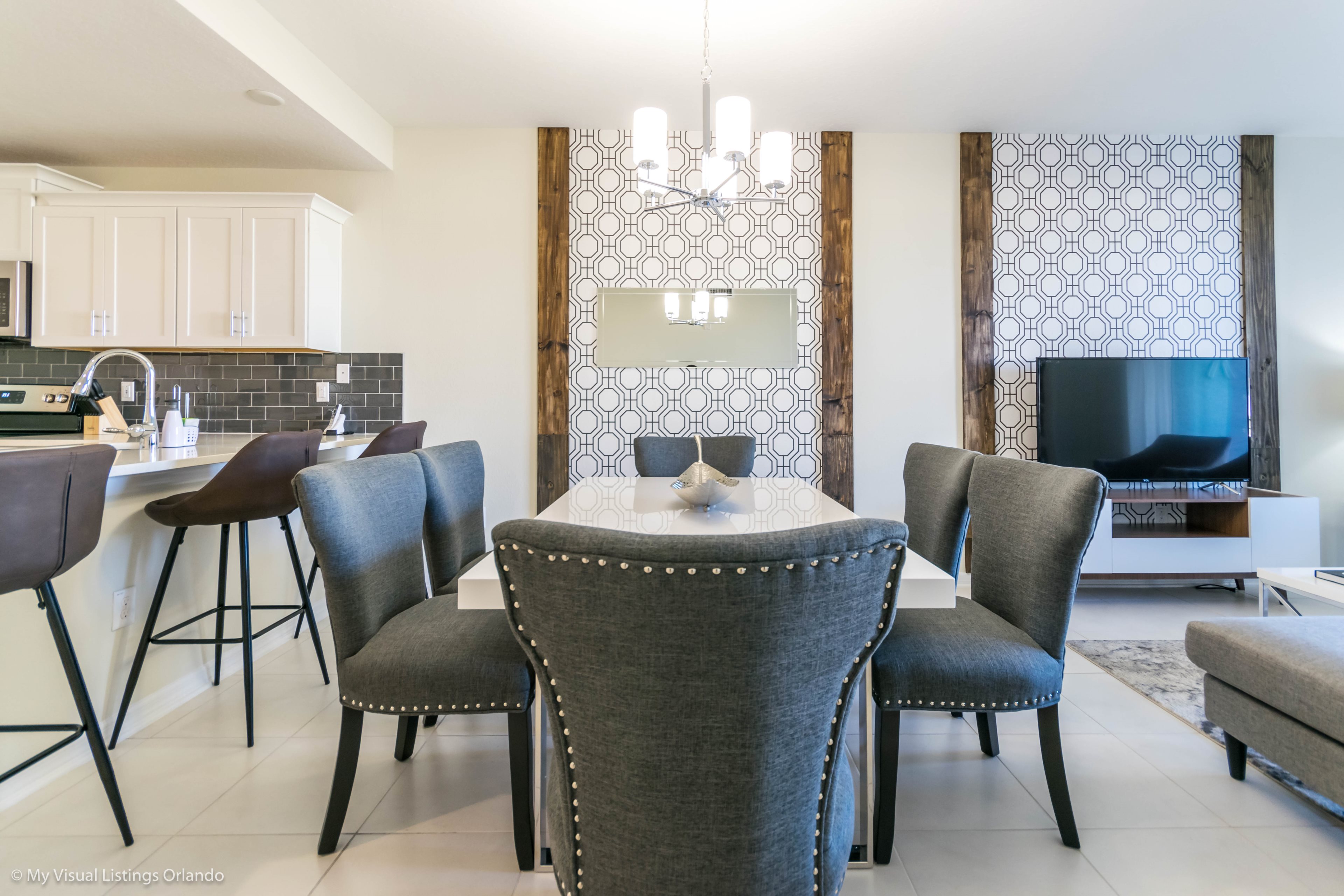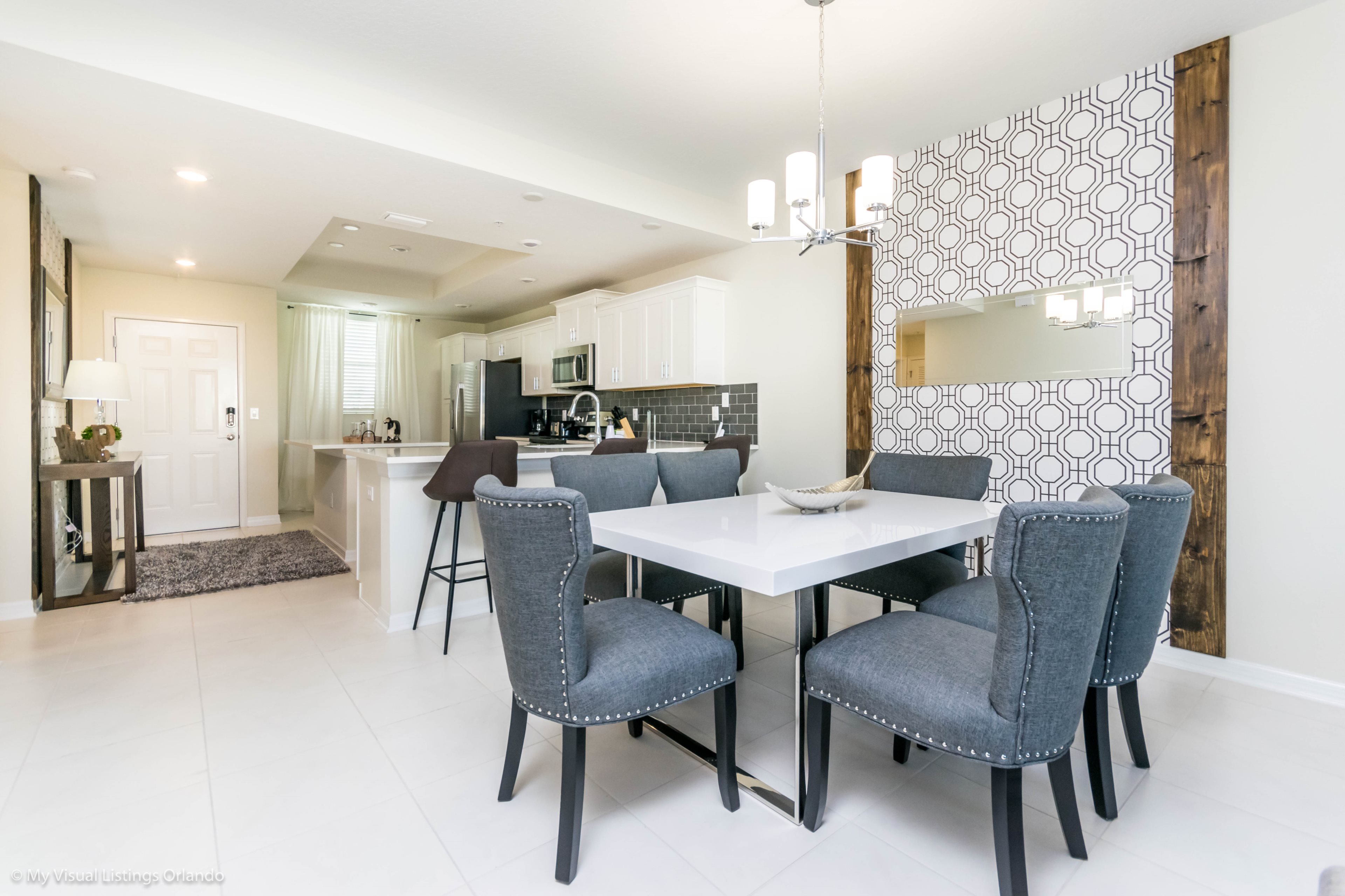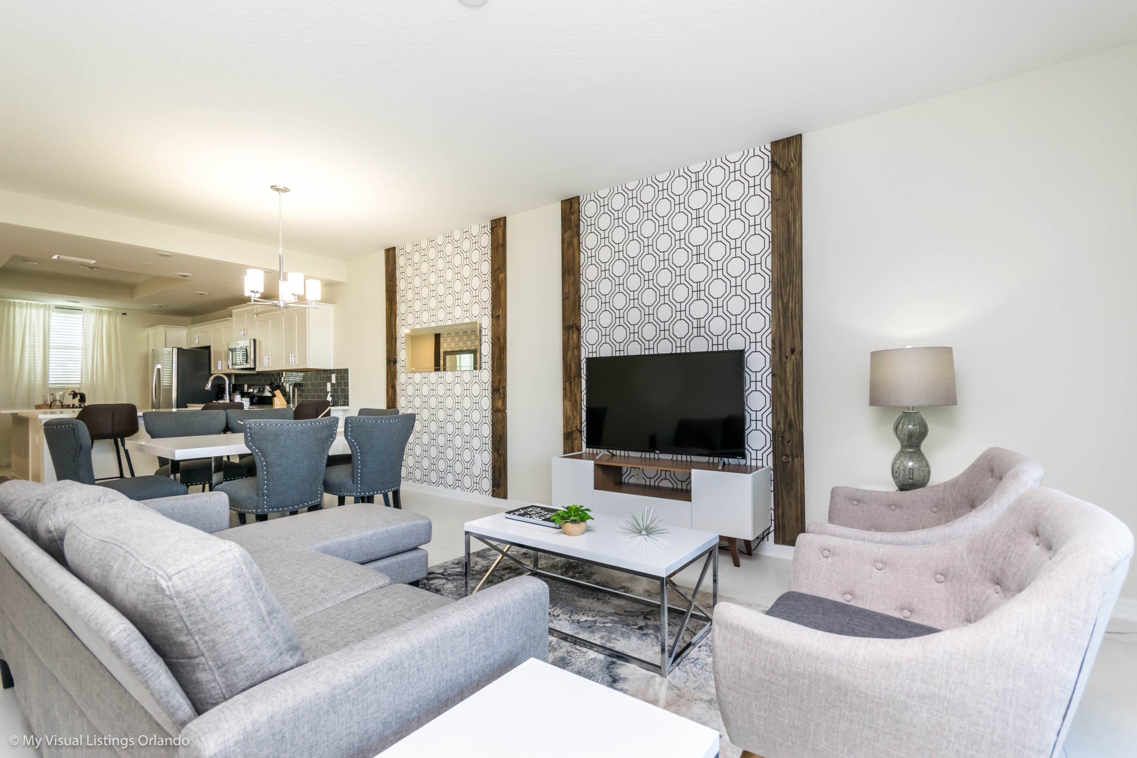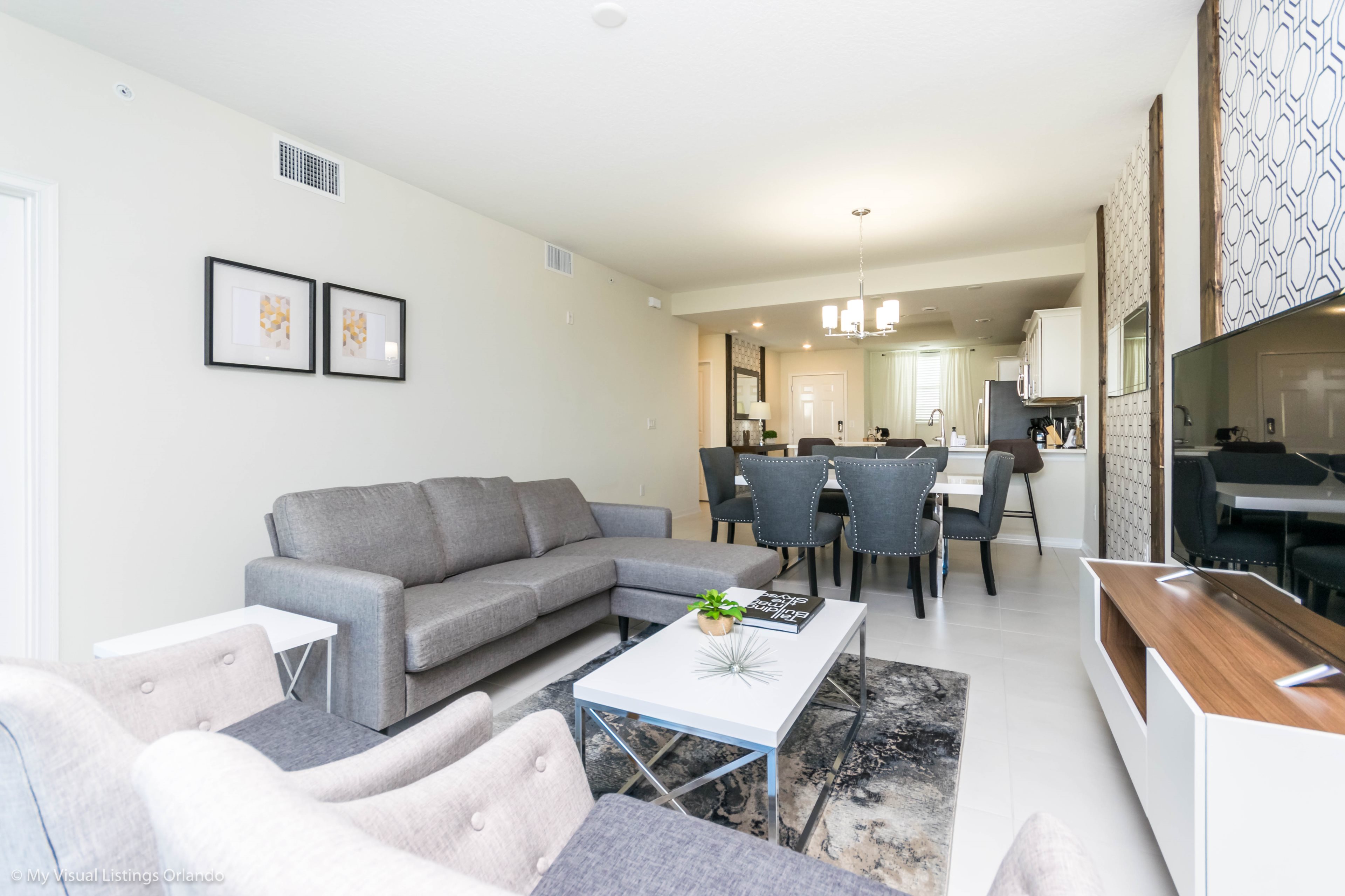 The beautiful modern kitchen features new stainless steel appliances, granite counter tops, pendant lighting and seating for 4 at the breakfast bar. All the cookware and utensils are provided for your convenience. In this open floor plan, step into the great room where you will find a lovely formal dinning area with seating up to 6 guests. Enjoy lounging around after a long day at the Parks in the contemporary living room featuring a sofa, love seat and large wall mounted flat screen TV. Keep the whole family happy with the Free Wi-Fi.
