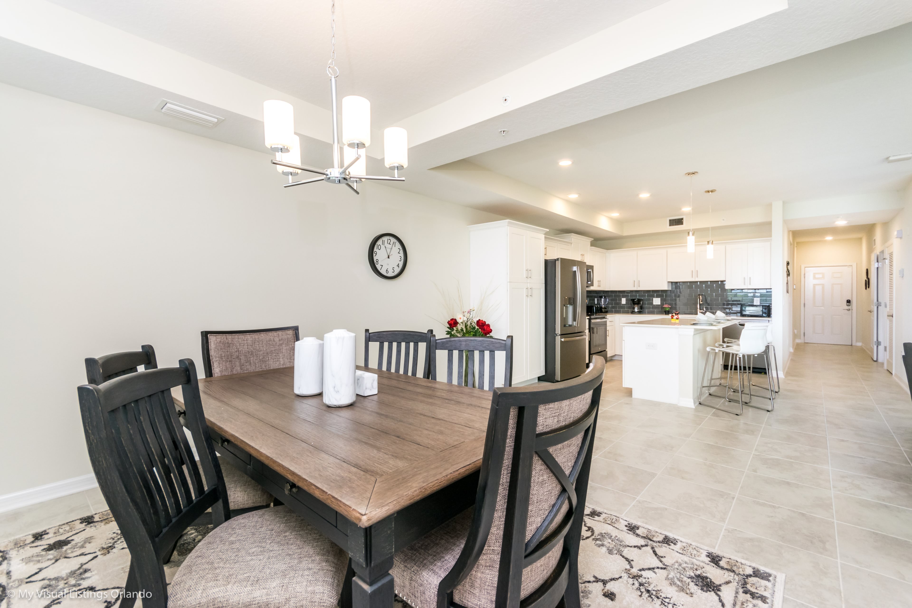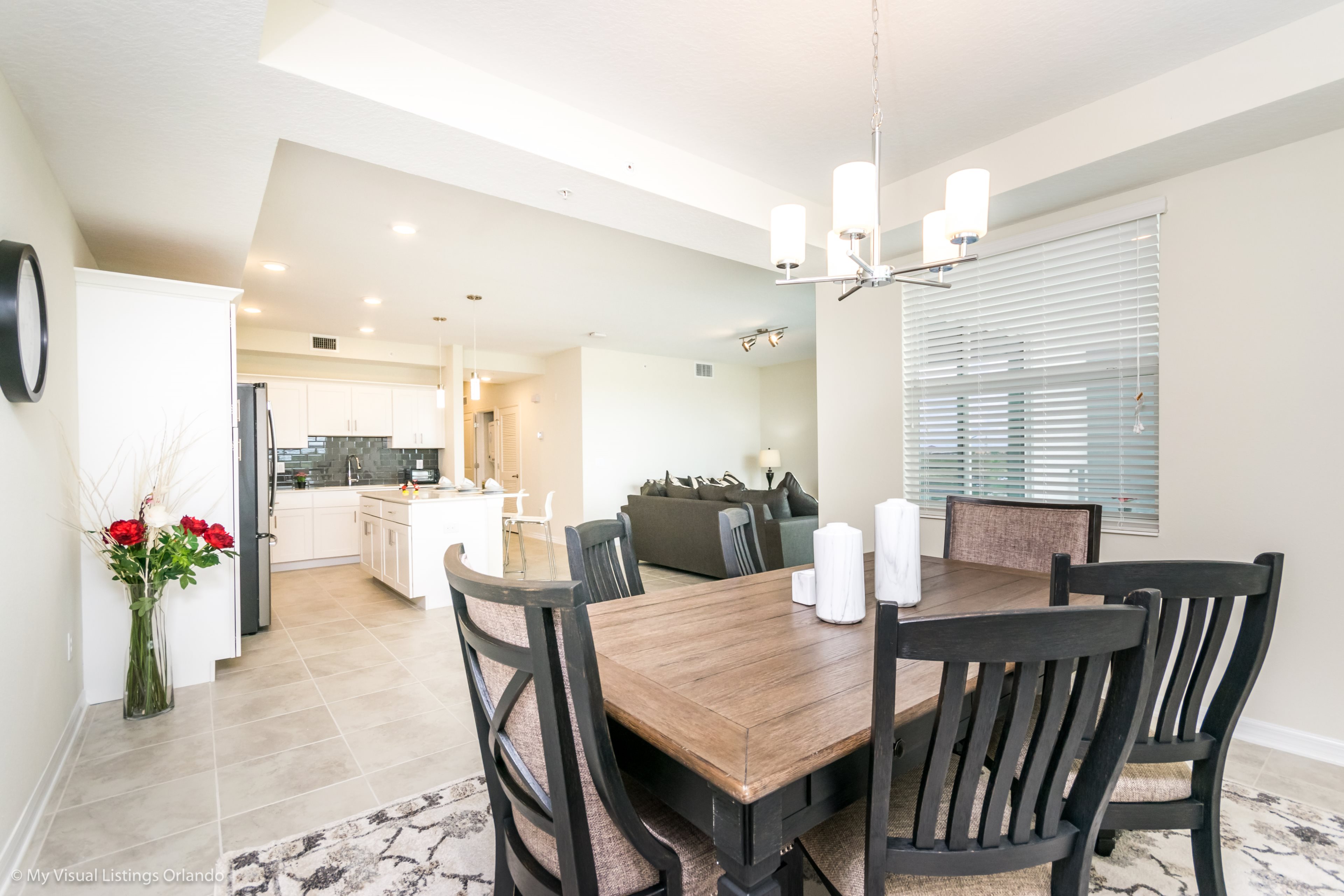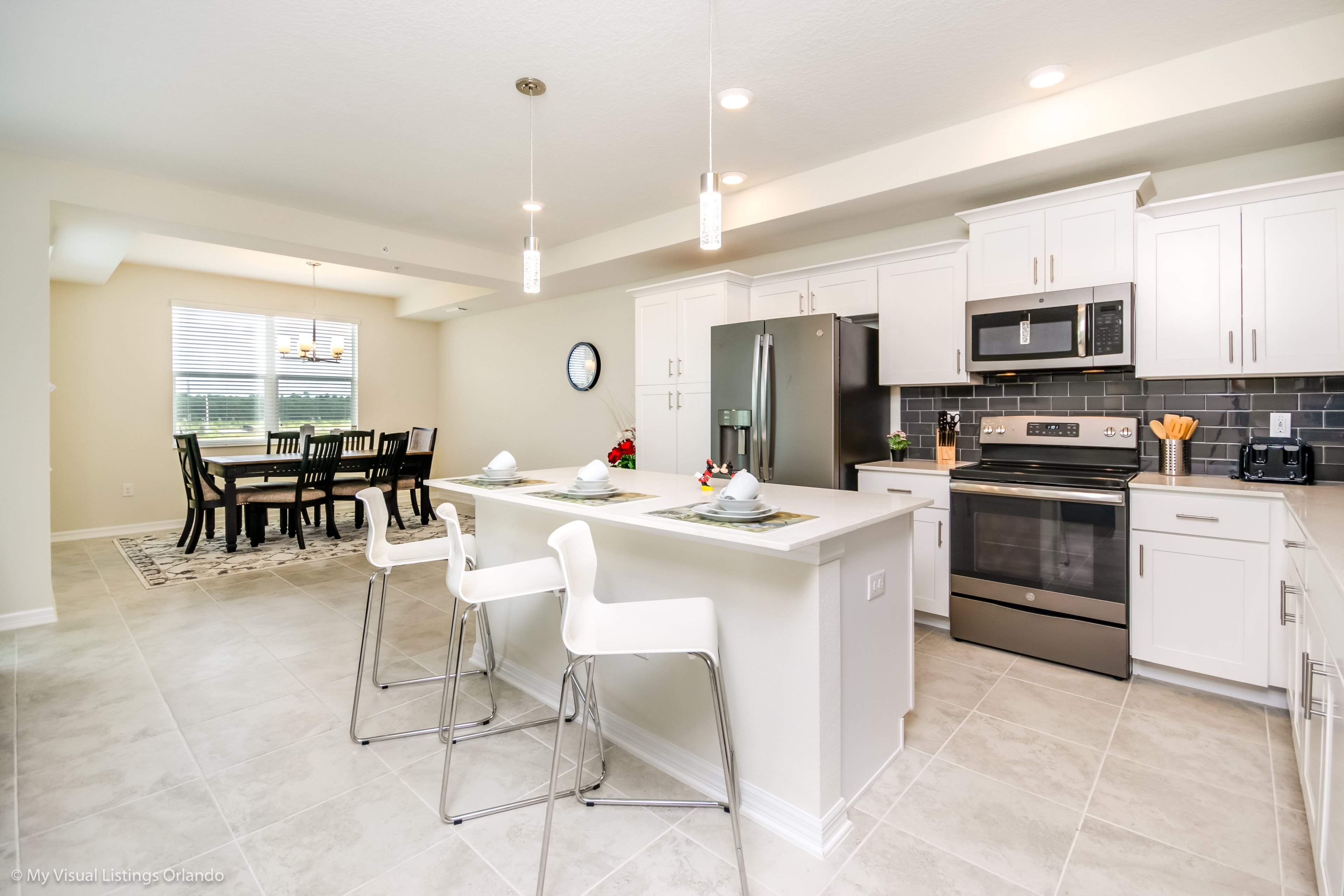 The beautiful modern kitchen features new stainless steel appliances, granite counter tops, pendant lighting and seating for 4 at the breakfast bar. All the cookware and utensils are provided for your convenience. In this open floor plan, step into the great room where you will find a lovely formal dinning area with seating up to 6 guests. Enjoy lounging around after a long day at the Parks in the contemporary living room featuring a sofa, love seat and large wall mounted flat screen TV. Keep the whole family happy with the Free Wi-Fi.
