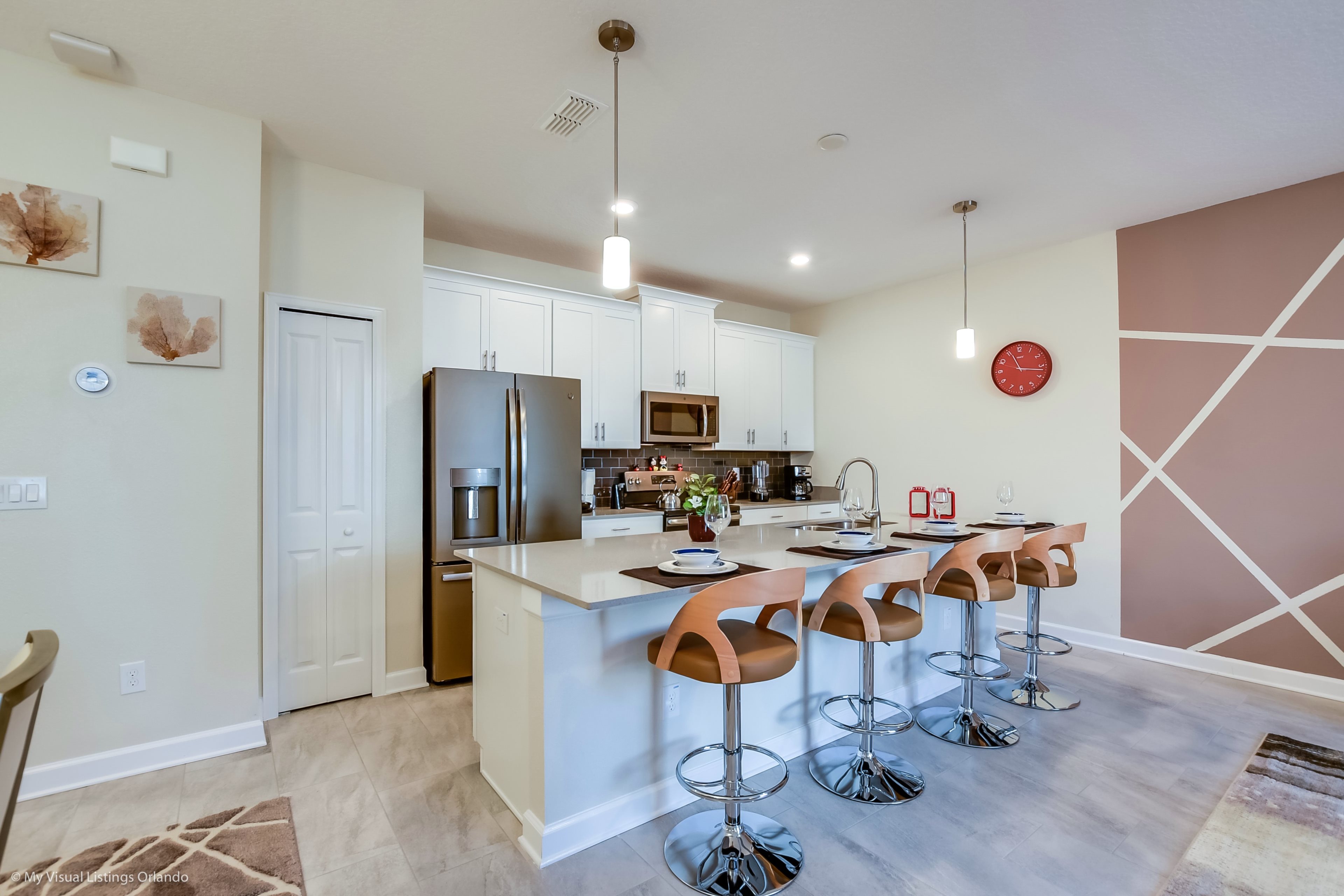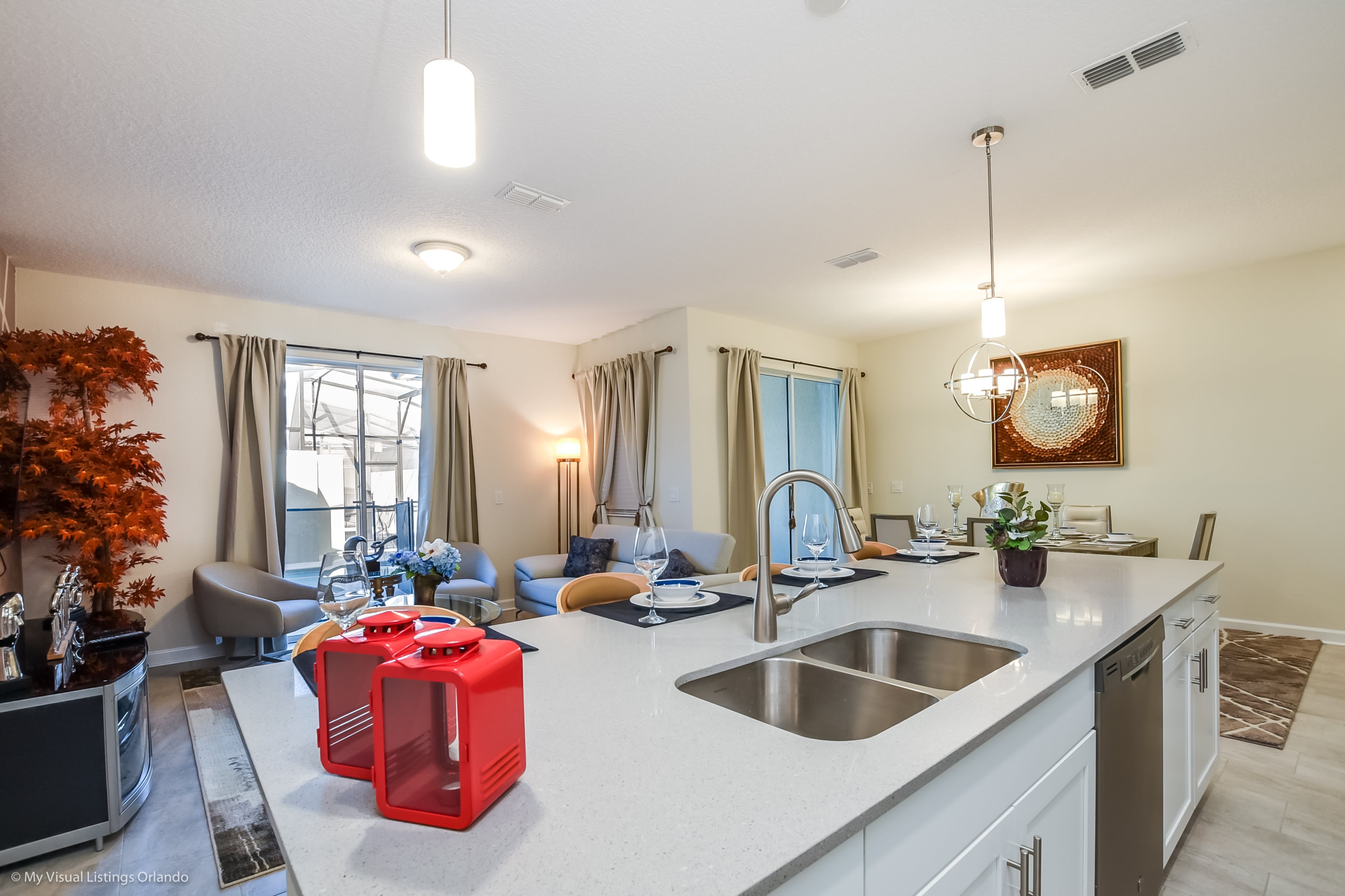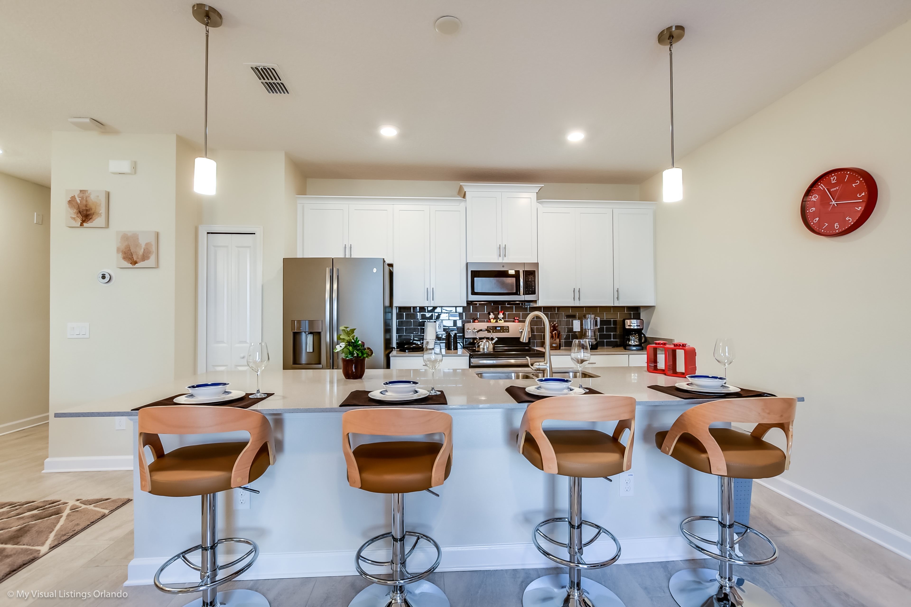 The beautiful modern kitchen features new stainless steel appliances, granite counter tops, pendant lighting and seating for 4 at the breakfast bar. All the cookware and utensils are provided for your convenience. In this open floor plan, step into the great room where you will find a lovely formal dinning area with seating up to 6 guests. Enjoy lounging around after a long day at the Parks in the contemporary living room featuring a sofa, love seat and large wall mounted flat screen TV. Keep the whole family happy with the Free Wi-Fi.