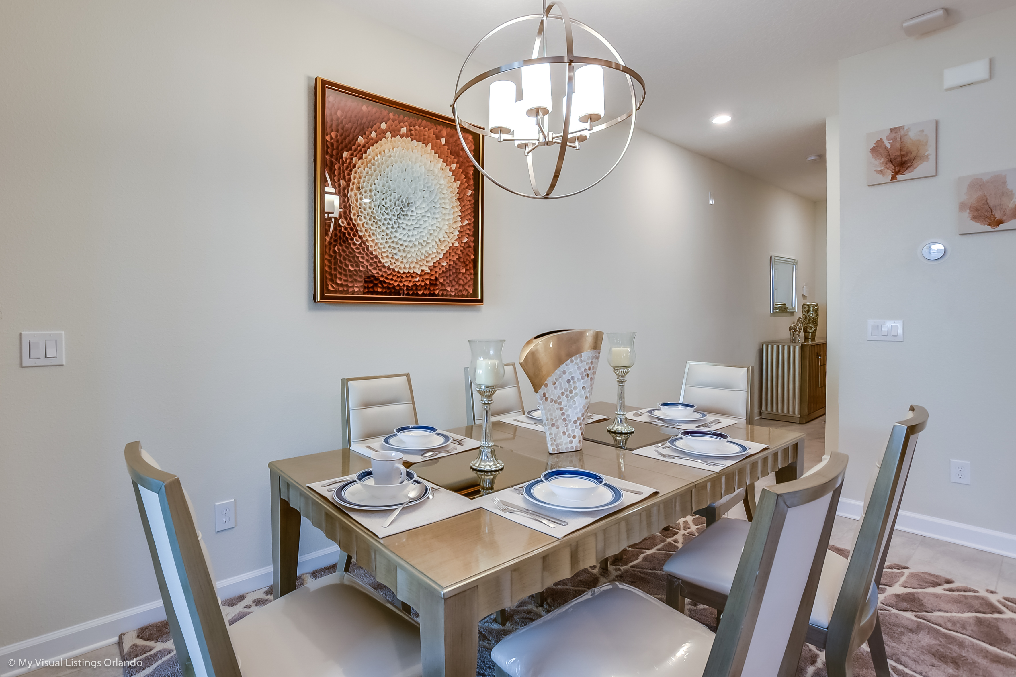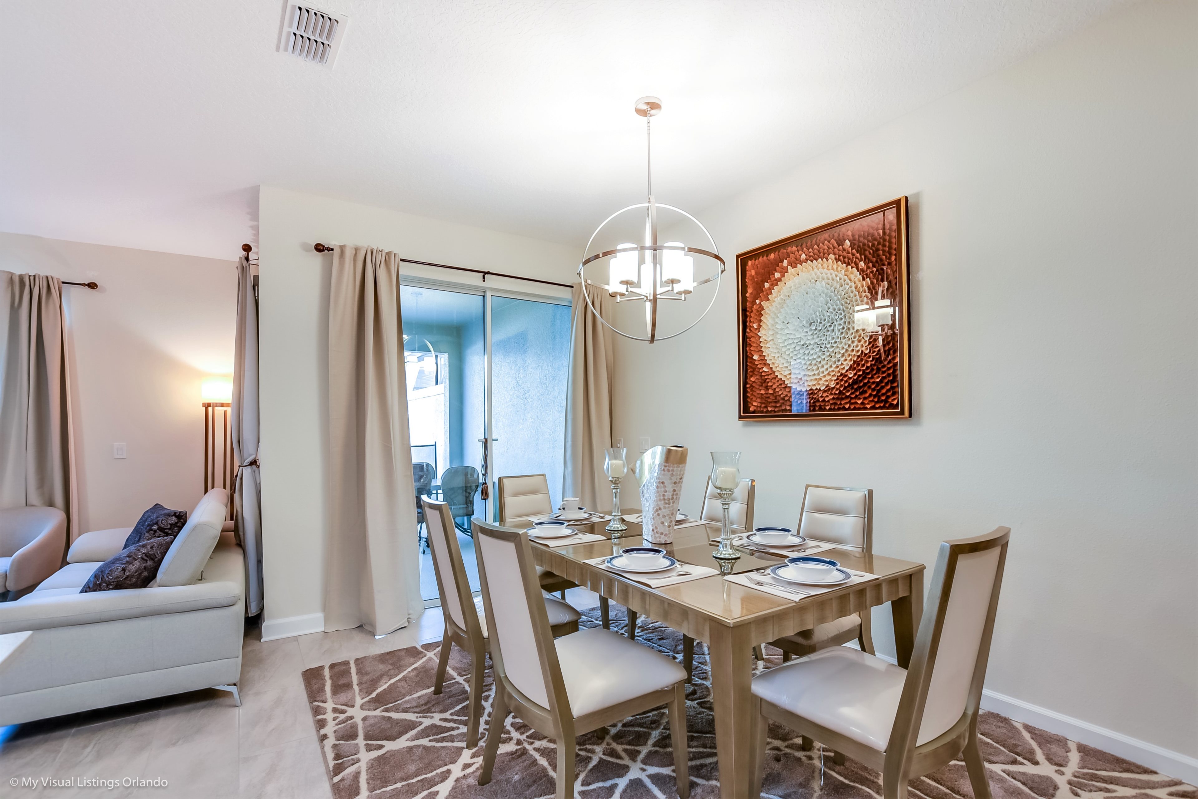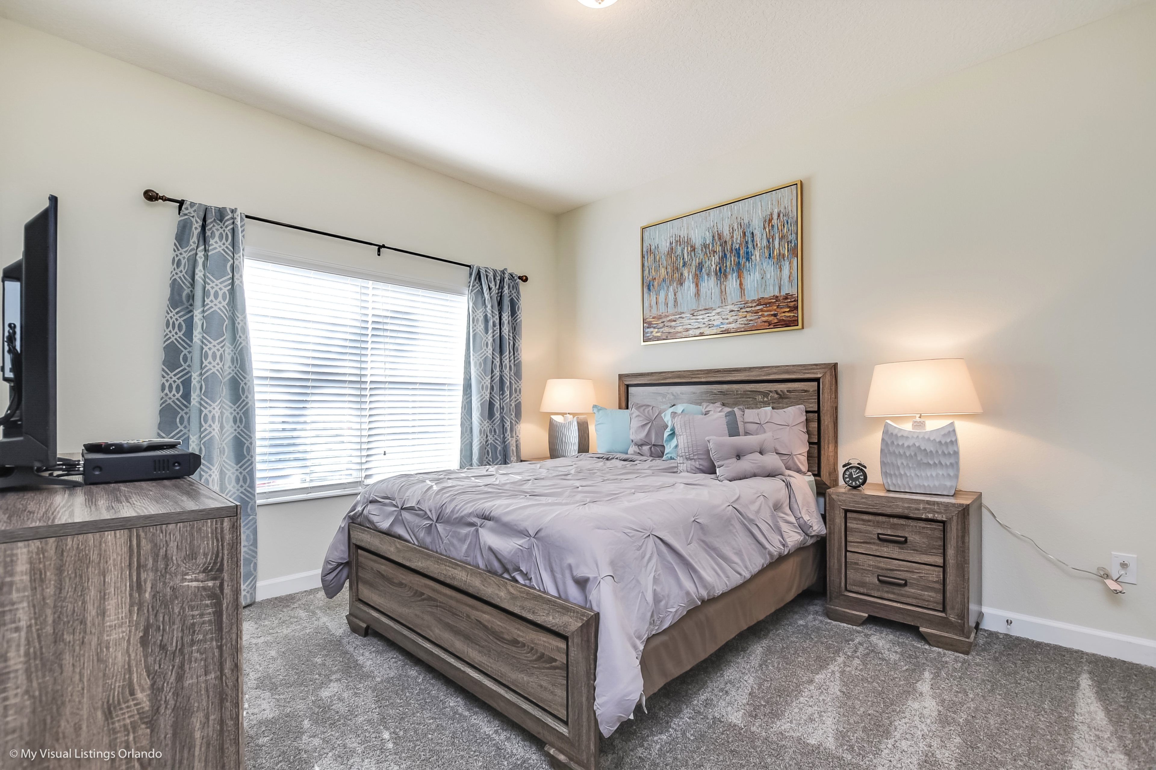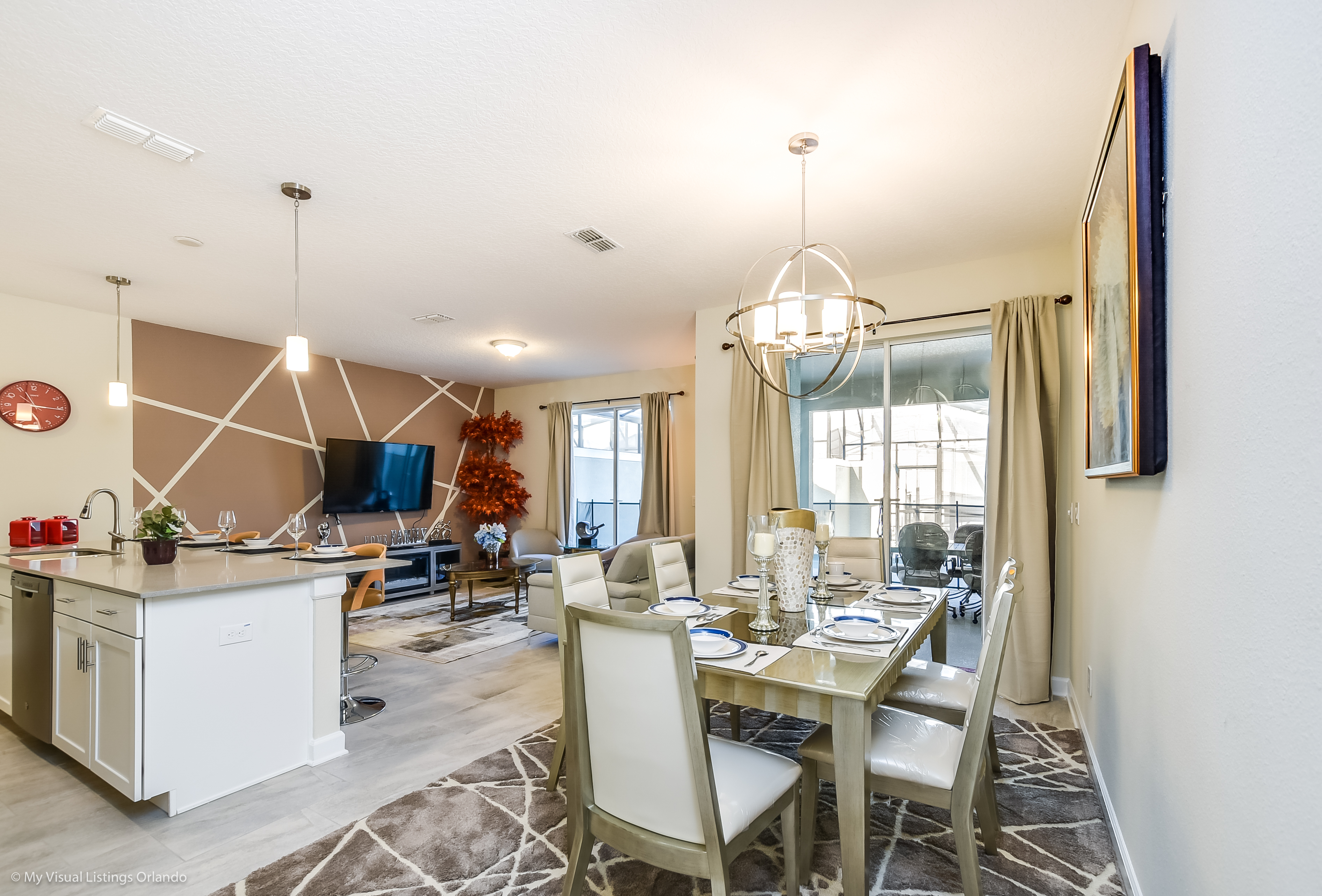 The beautiful modern kitchen features new stainless steel appliances, granite counter tops, pendant lighting and seating for 4 at the breakfast bar. All the cookware and utensils are provided for your convenience. In this open floor plan, step into the great room where you will find a lovely formal dinning area with seating up to 6 guests. Enjoy lounging around after a long day at the Parks in the contemporary living room featuring a sofa, love seat and large wall mounted flat screen TV. Keep the whole family happy with the Free Wi-Fi.
