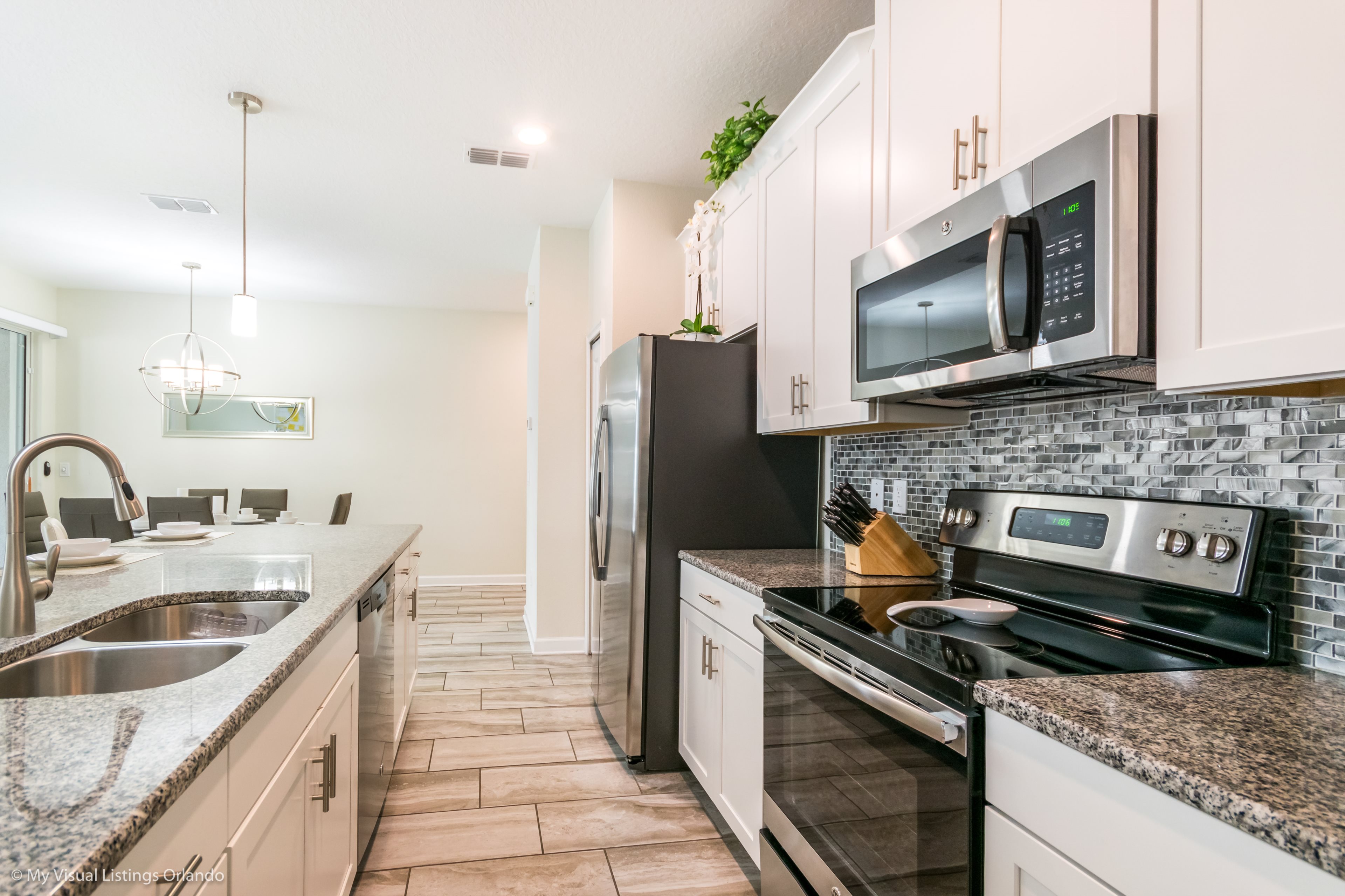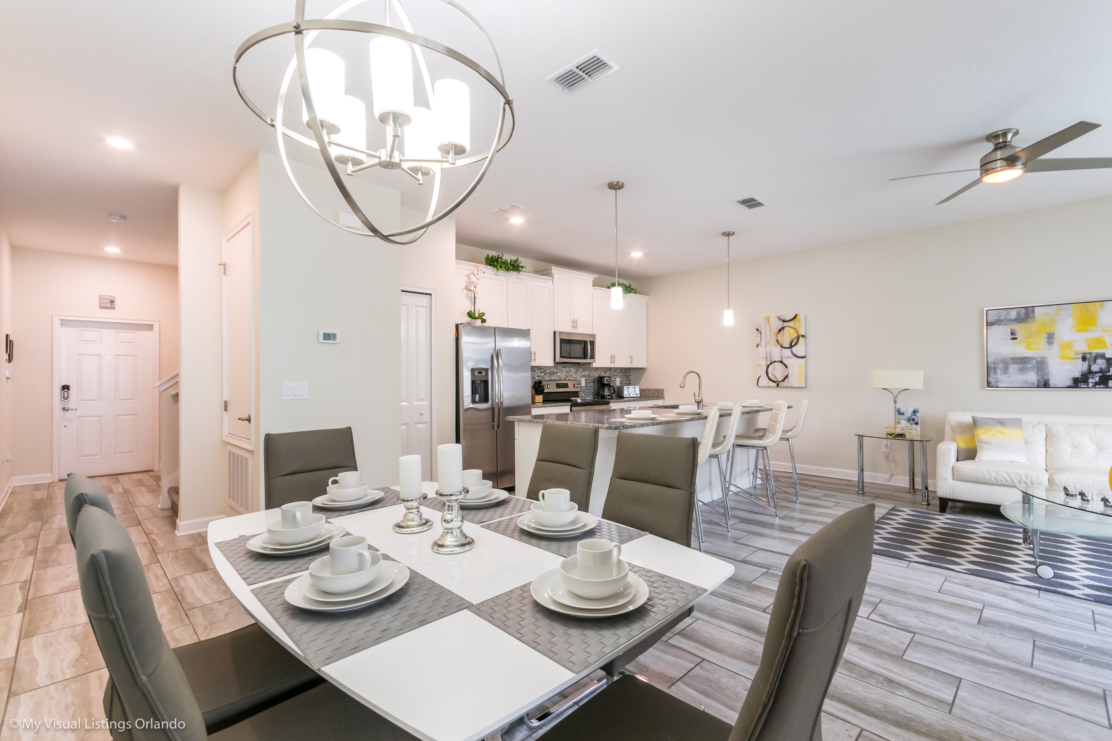 The beautiful modern kitchen features new stainless steel appliances, granite counter tops, pendant lighting and seating for 4 at the breakfast bar. All the cookware and utensils are provided for your convenience. In this open floor plan, step into the great room where you will find a lovely formal dinning area with seating up to 6 guests. Enjoy lounging around after a long day at the Parks in the contemporary living room featuring a sofa, love seat and large wall mounted flat screen TV. Keep the whole family happy with the Free Wi-Fi.