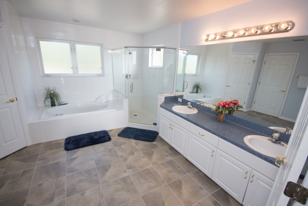 The kitchen is a large sunny space with fridge, oven, dishwasher, stove and microwave; all of these appliances are relatively new and are in good working order. A large breakfast nook has been provided and is attached to the kitchen counter; this area can seat 4 guests easily. The kitchen connects to a small sun-filled dining area that has a rustic-styled table with 4 chairs. The villa also has a second, larger dining room table that can seat up to 6 guests.