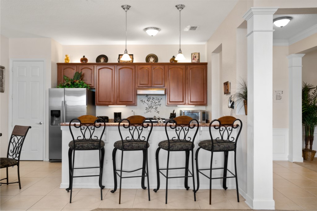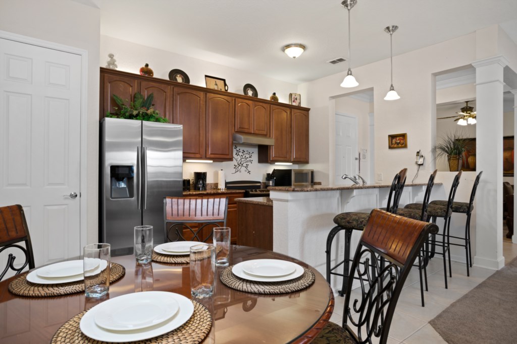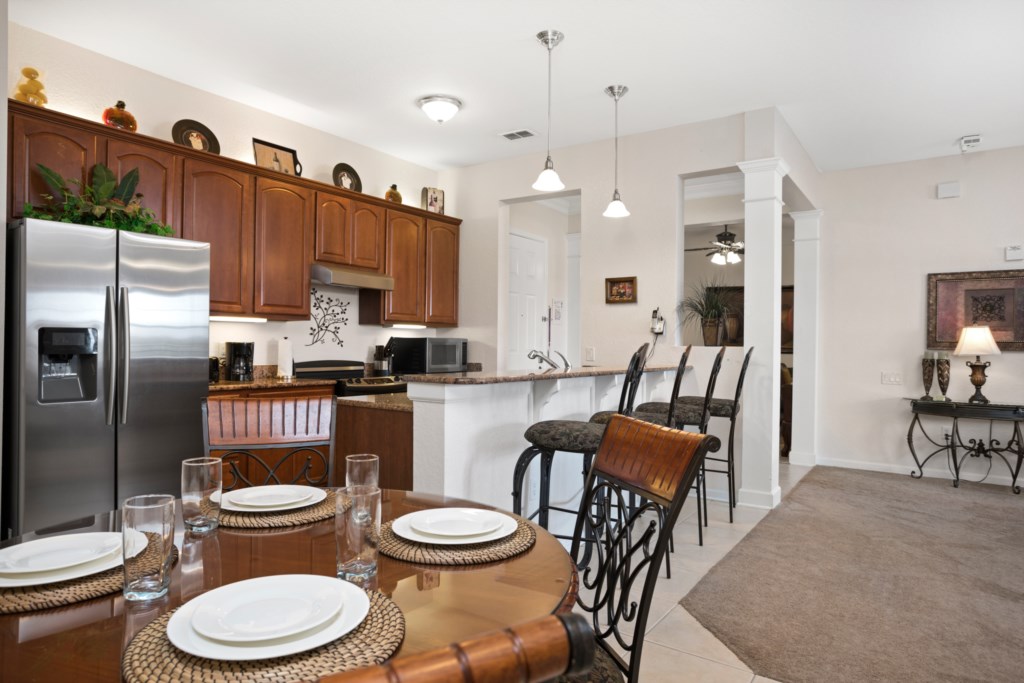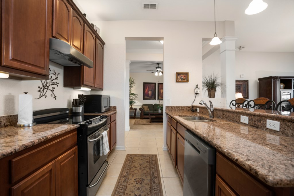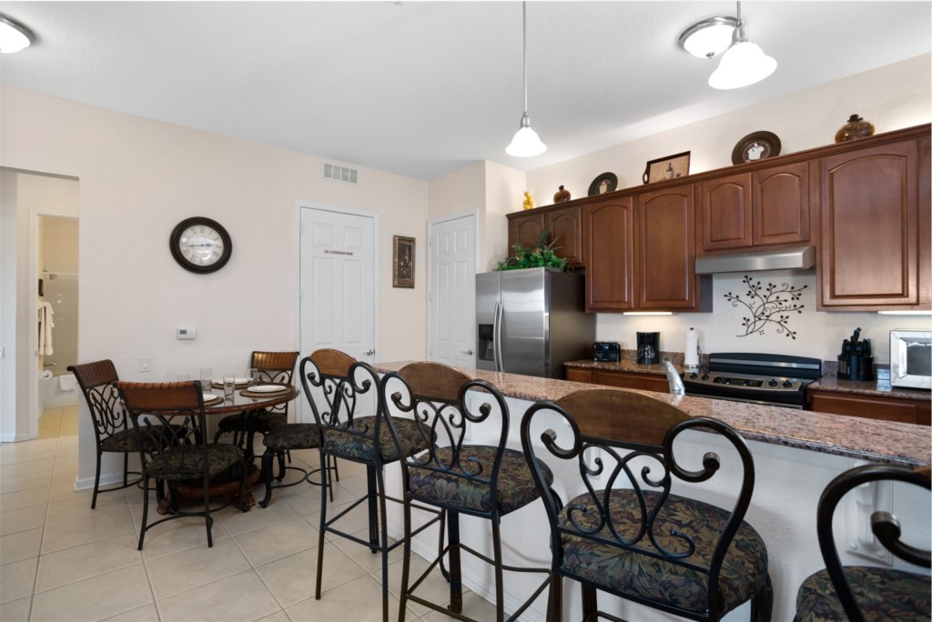 The south pool and lake-facing living area is open plan with a comfortable seating area with a 60" TV, a fully equipped kitchen and dining area for 4 with bar seating for 4.