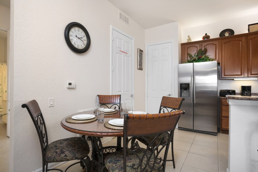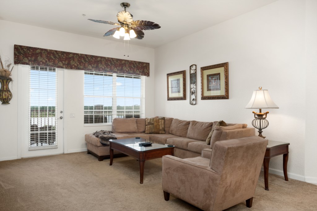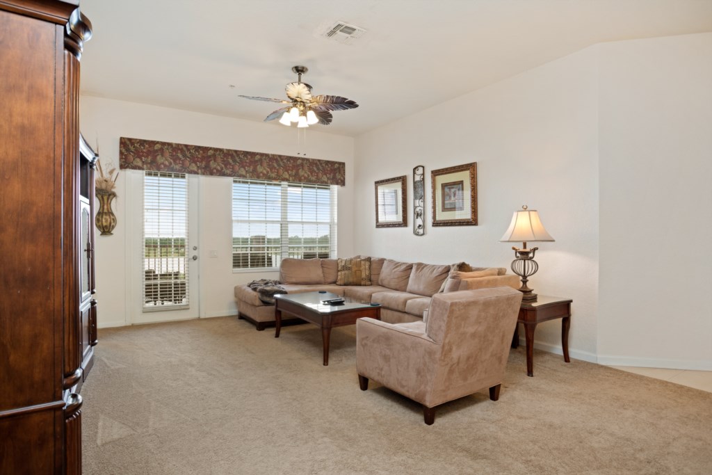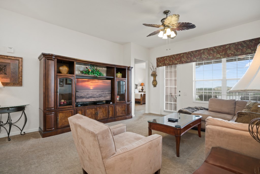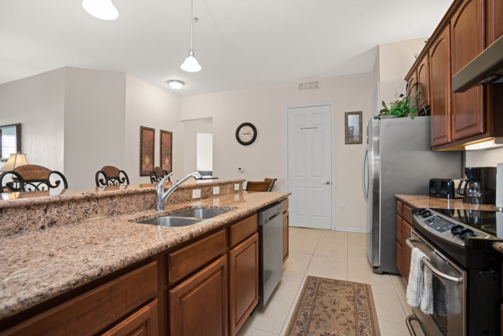 The south pool and lake-facing living area is open plan with a comfortable seating area with a 60" TV, a fully equipped kitchen and dining area for 4 with bar seating for 4.
