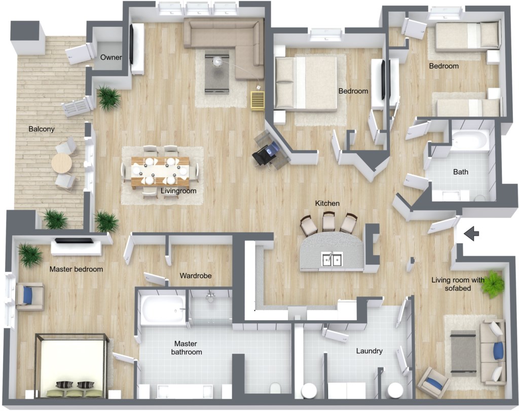 The marble counter topped kitchen is a cook’s dream and you’ll find that it has every modern kitchen appliance and gadget needed. For a quick snack guests can choose to eat at the breakfast bar area. For your convenience, there’s also a fully-equipped laundry room which has a full size washing machine and dryer.