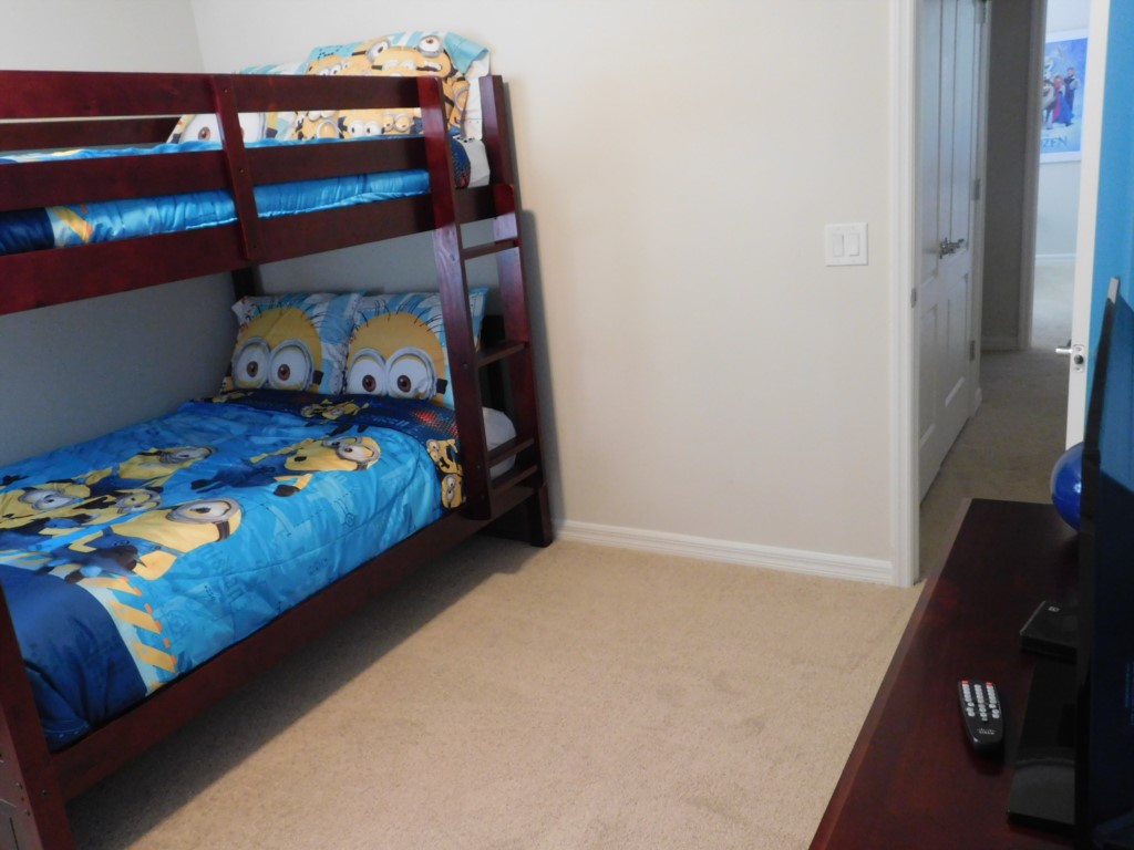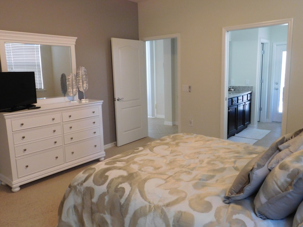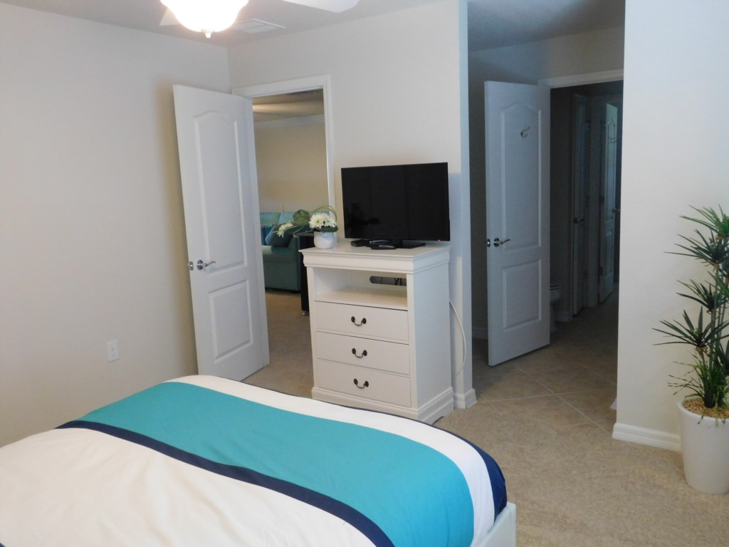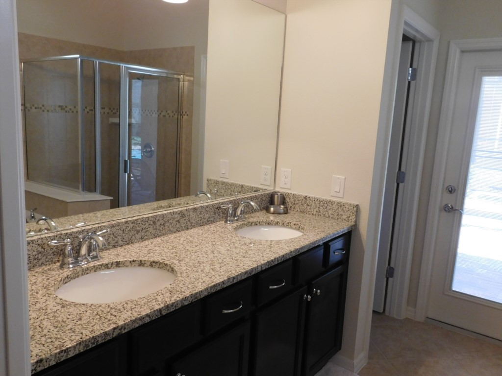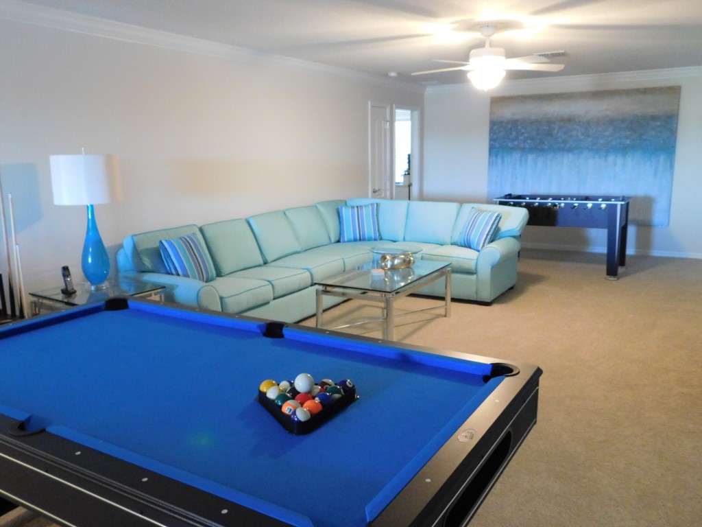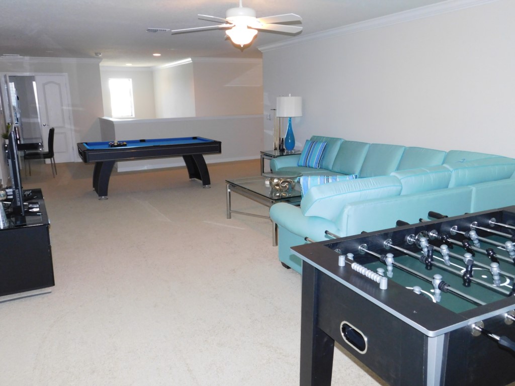 This stunning 2 storey private pool home has two living areas as well a breakfast island bar and dining area, along with a fully equipped kitchen including all necessary appliances and kitchenware to make you feel right at home. There are 8 inviting bedrooms as well as 6 full bathrooms, a game room and 10 TVs, throughout, with standard digital cable that has over 70 channels. While you are lounging comfortably should you wish to watch movies there is also a Blu-ray player in the living room. Your very spacious home sleeps 18 people or up to 20 people when utilizing the sofa bed located in the upper living area. A temperature controlled centralized cooling and heating unit is a splendid amenity for those hot summer days or cool winter nights. As you walk through the home you will find one of the master bedrooms furnished with a queen size bed and ensuite bathroom comprised of a garden tub, a stand up shower, his & her sinks and 2 walk in closets, as well as one guest room with a queen size bed. On the second floor you will find two more master bedrooms, one furnished with a king size bed and ensuite bathroom comprised of a his & her sink and bathtub/shower combo. The other master with a queen size bed and ensuite bathroom comprised of a his & her sink and a stand up shower. There are also four more guest rooms with another queen size bed in one room, 2 twin beds in two rooms and finally one room with a bunk bed of 2 full size beds.