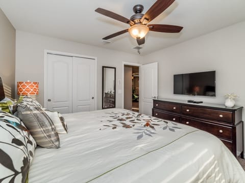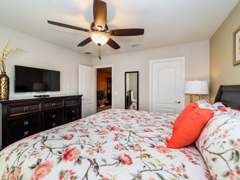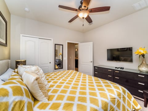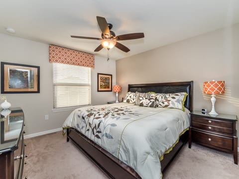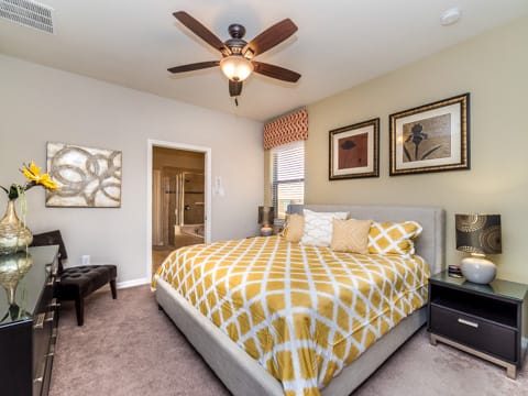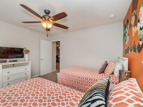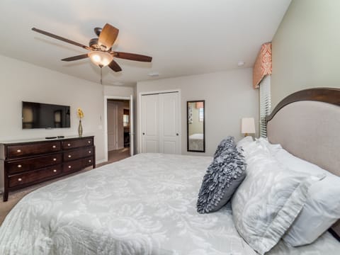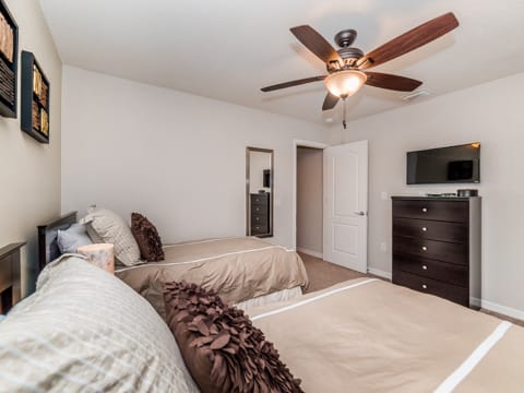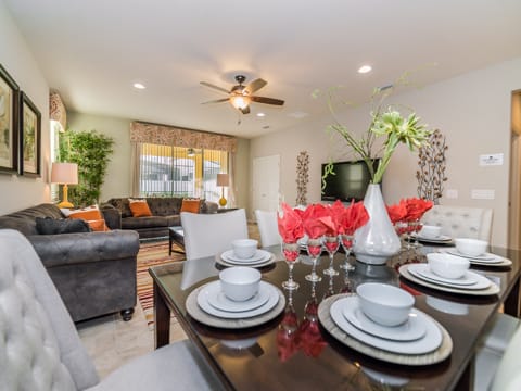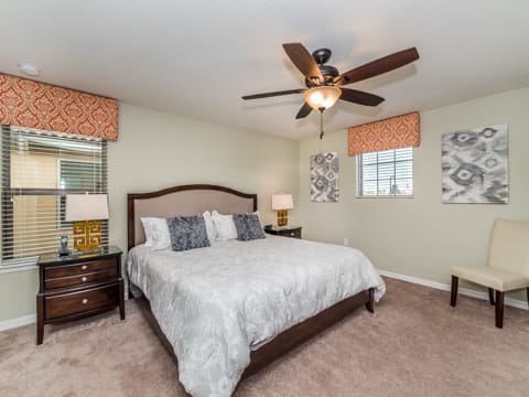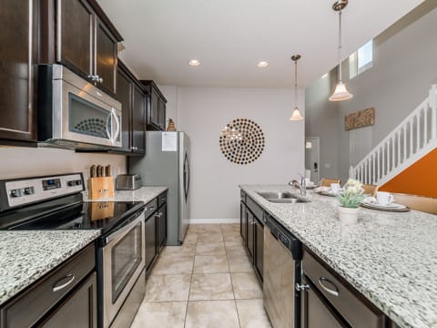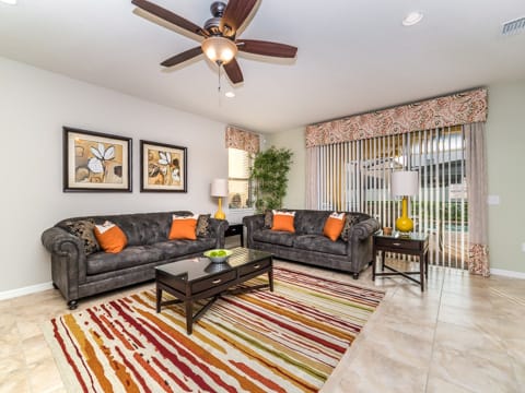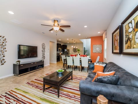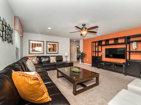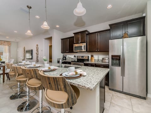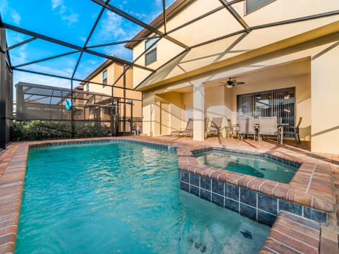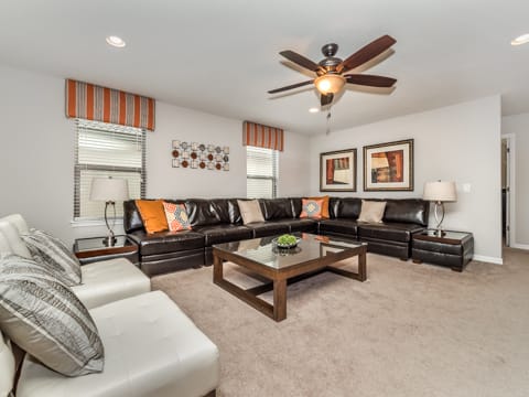 Located in Windsor at Westside, this home is the perfect place for you to begin your dream vacation. This Grand Collection home, which means it is professionally designed and decorated for the luxury of our guests, is the perfect place to call home for your vacation. The Spanish-style home greets you as you pull up to the brick driveway. As you enter, the open atmosphere of the home makes it feel big and luxurious. The main living room is surrounded by cozy couches to relax and rest for the day and includes a huge 55-inch flat screen TV. This then spills over into the dining room which seats 8. The open concept then flows into the gorgeous kitchen. Granite countertops, dark wood cabinetry and all the necessities of home await you in this kitchen. This Grand Collection home sleeps 14 guests with a total of 6 bedrooms located both on the first and second floor. This home has 4 king bedrooms and 2 bedrooms with 2 twin beds. Everyone will have their own space when it comes to this home. Speaking of space, the second living room located upstairs is outfitted with a massive wraparound couch all situated around a 50-inch flat screen TV. If you need to get on the internet, FREE WIFI comes with this home not to mention 2 Bluray players and an X-box. A washer and dryer are also included so you can enjoy all the necessities of home on vacation. Once you're done picking out your bedroom, head on down to the gameroom. Perfect for entertaining, this home has billiards, air hockey and more! After game night is over, take a dip in the pool and forget about your worries. This home has a full pool and spa along with lounge chairs and an outdoor dining set and BBQ grill. Windsor at Westside is the perfect location too, located next to all the parks! Book your stay at this incredible home today!