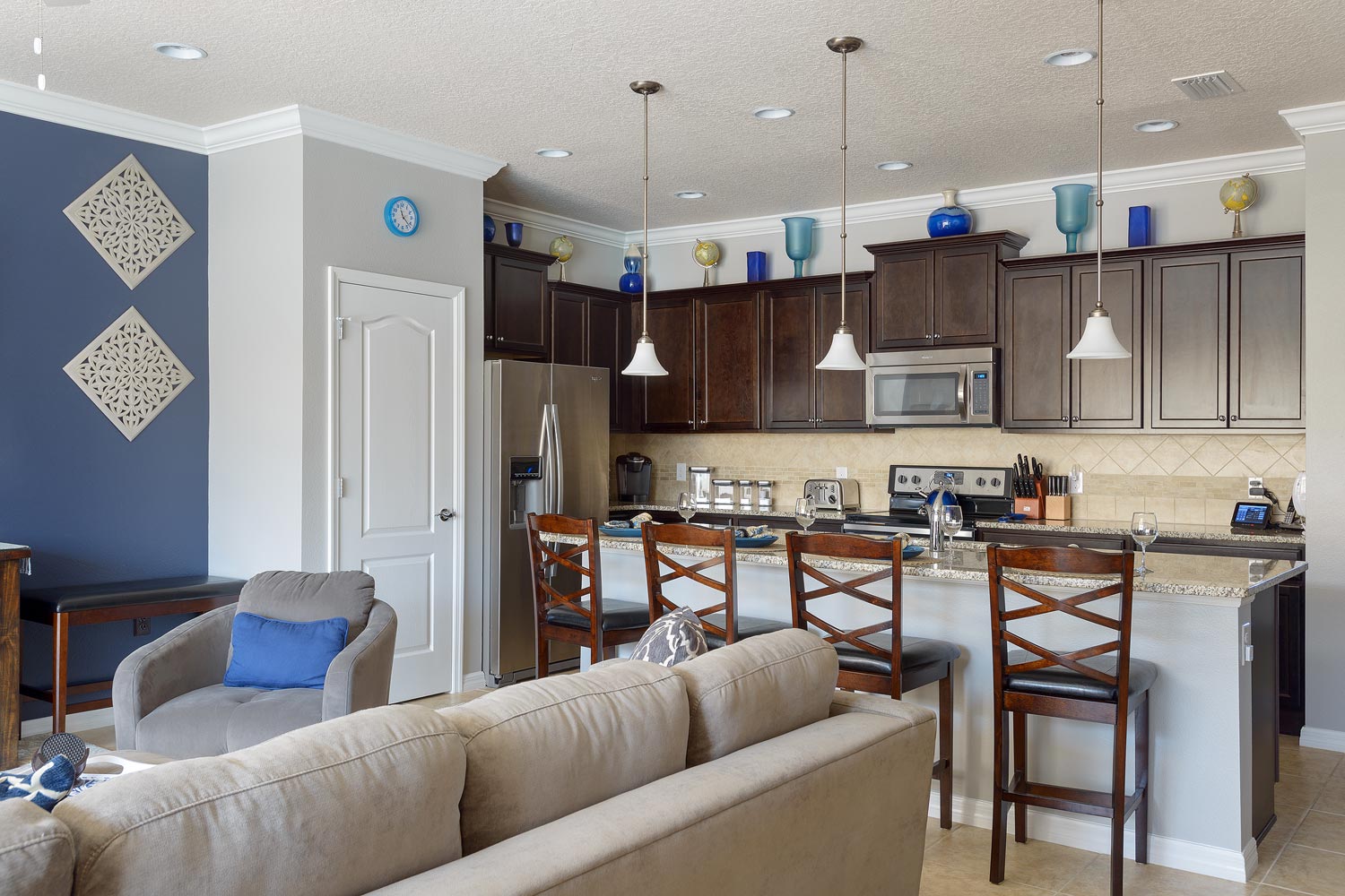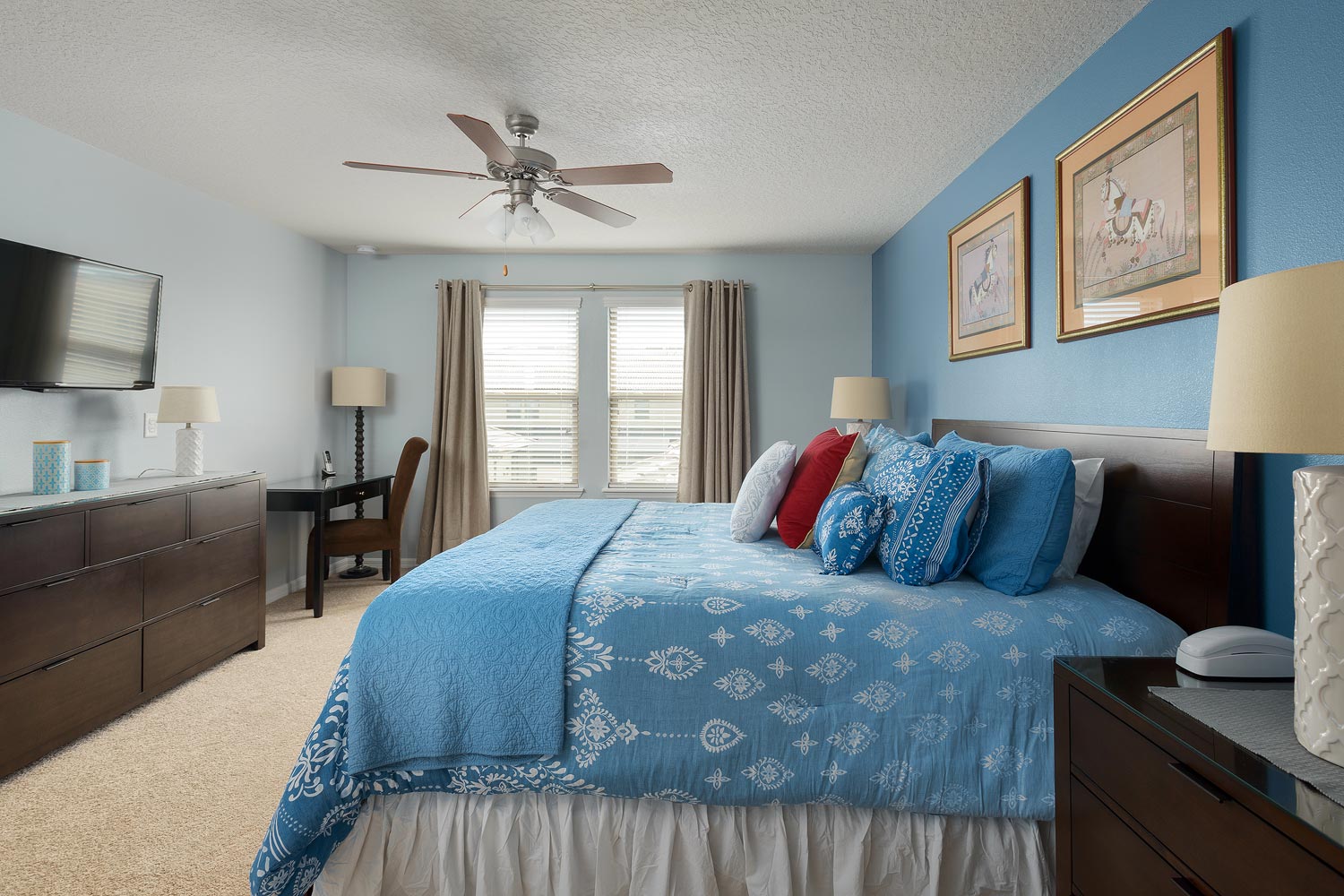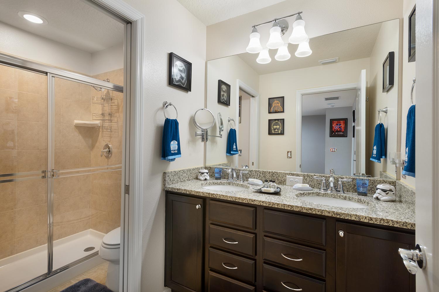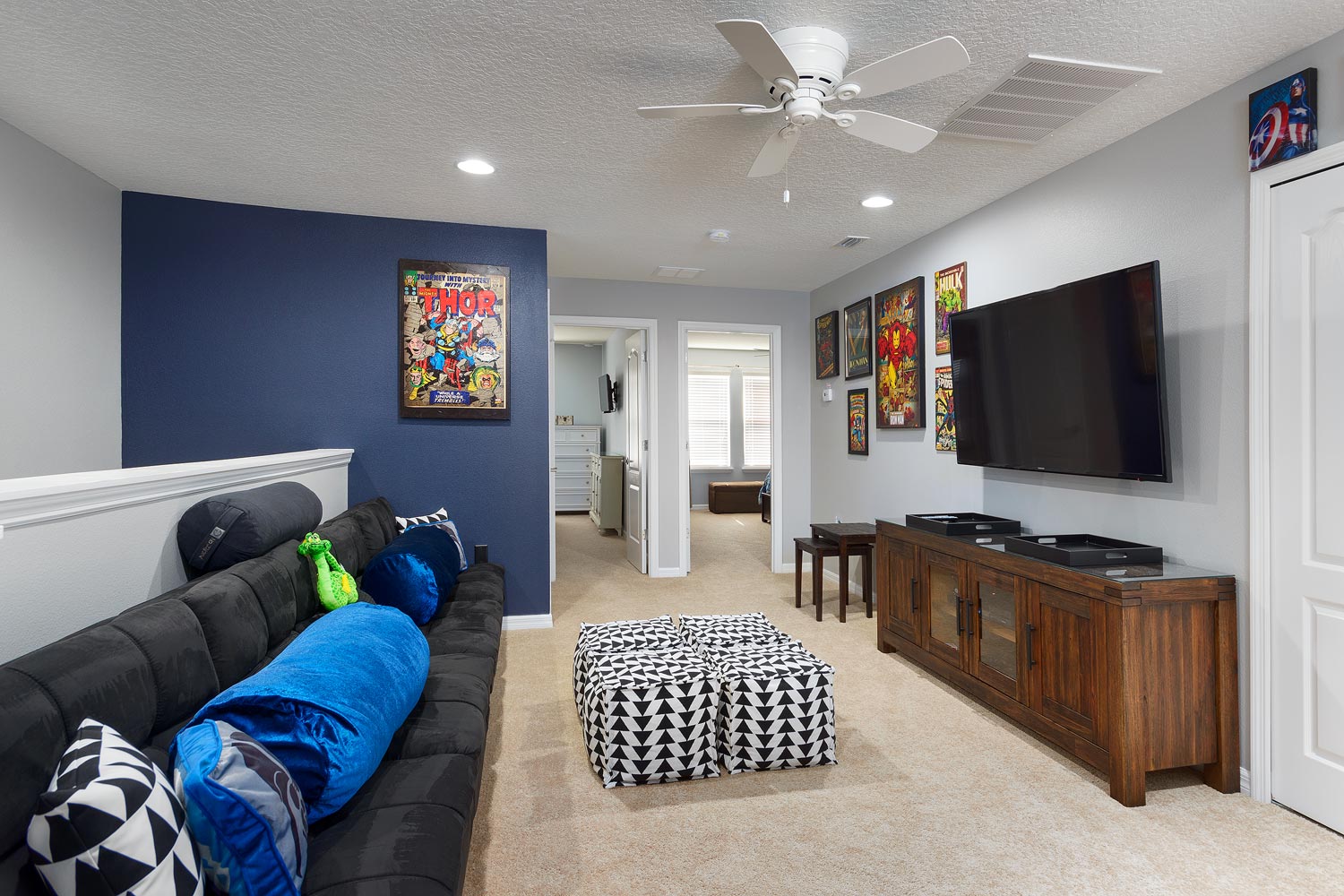 5-bedroom town home rental in Windsor at Westside with private pool, themed bedroom & entertainment area. Explore all the value-packed features of this brand-new town home. The two-story town home is located just minutes from Disney in the brand-new Windsor at Westside community. Enjoy 5 bedrooms, 4 bathrooms and 1 half bathroom. The bedrooms include 2 suites, 2 queen bedrooms and a Star Wars-themed twin bedroom. Every bedroom has a smart LED TV and an alarm clock with a USB charge port. Swim and splash in the very private screened-in pool. For additional fun, the town home offers an entertainment area with a 60” smart LED TV, Xbox One and two futons that can be converted into two full beds. The town home also features a living area with a 60” smart LED TV and Blu-ray player, a fully equipped kitchen, laundry area, one-car garage and complimentary Wi-Fi.