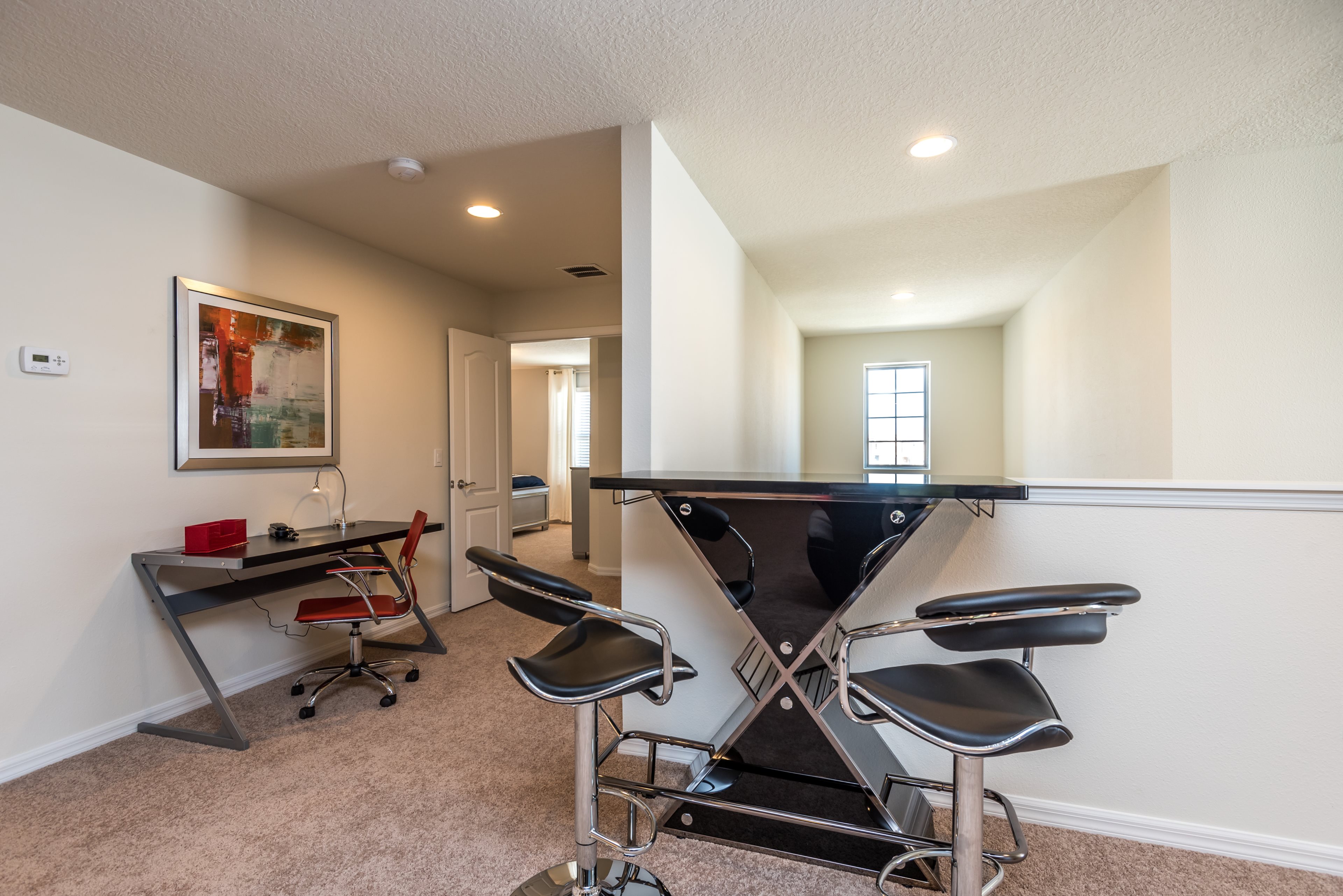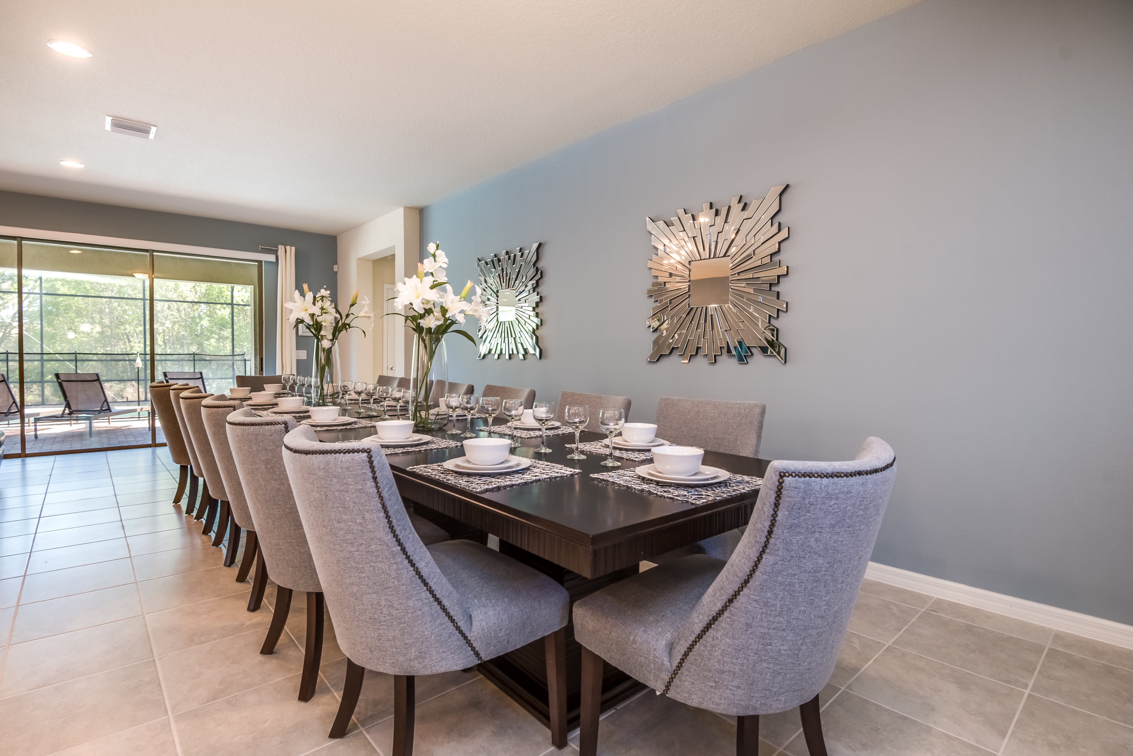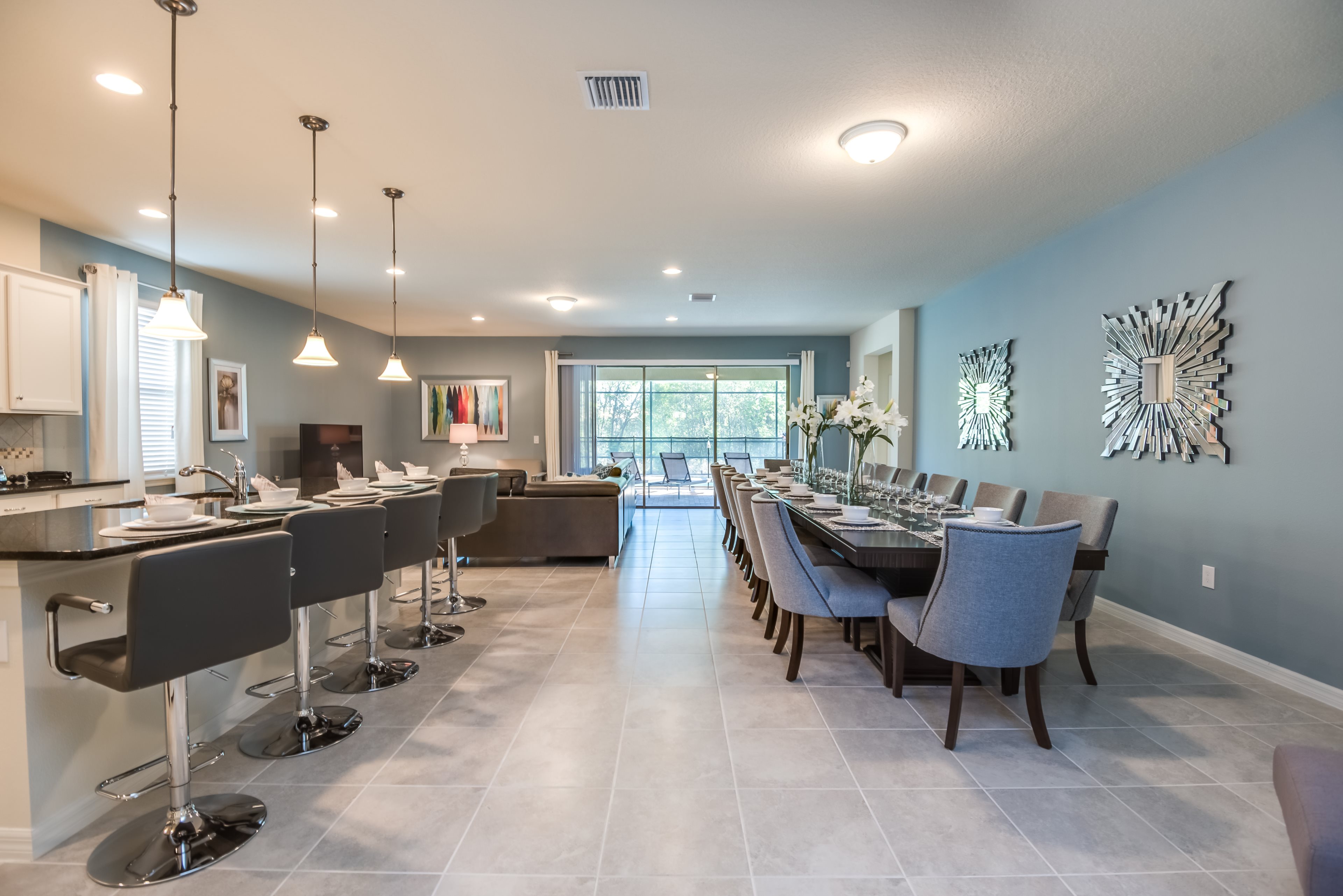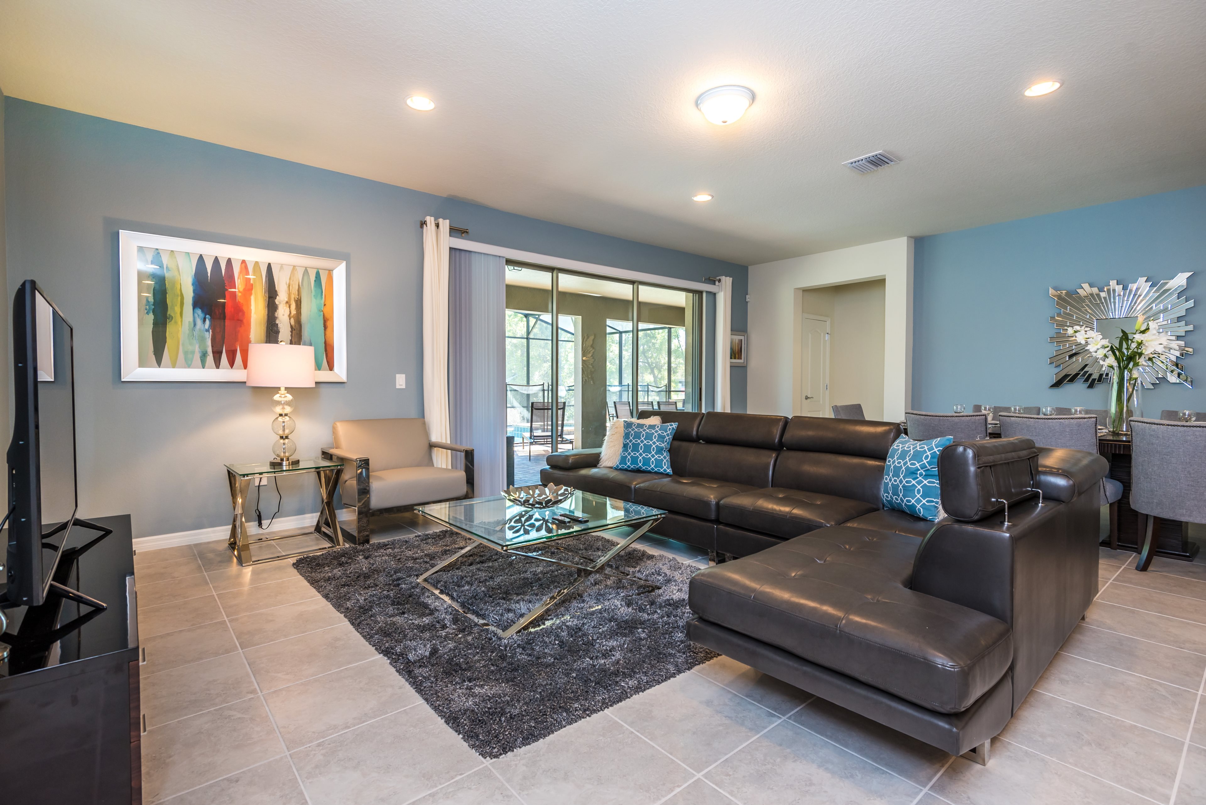 The Family Room is vast, with soft seating, side tables & lamps, beautiful wall decorations and a wall mounted 60” flat screen HDTV. Three huge glass patio windows offer an unparalleled view of the outdoor swimming pool and: