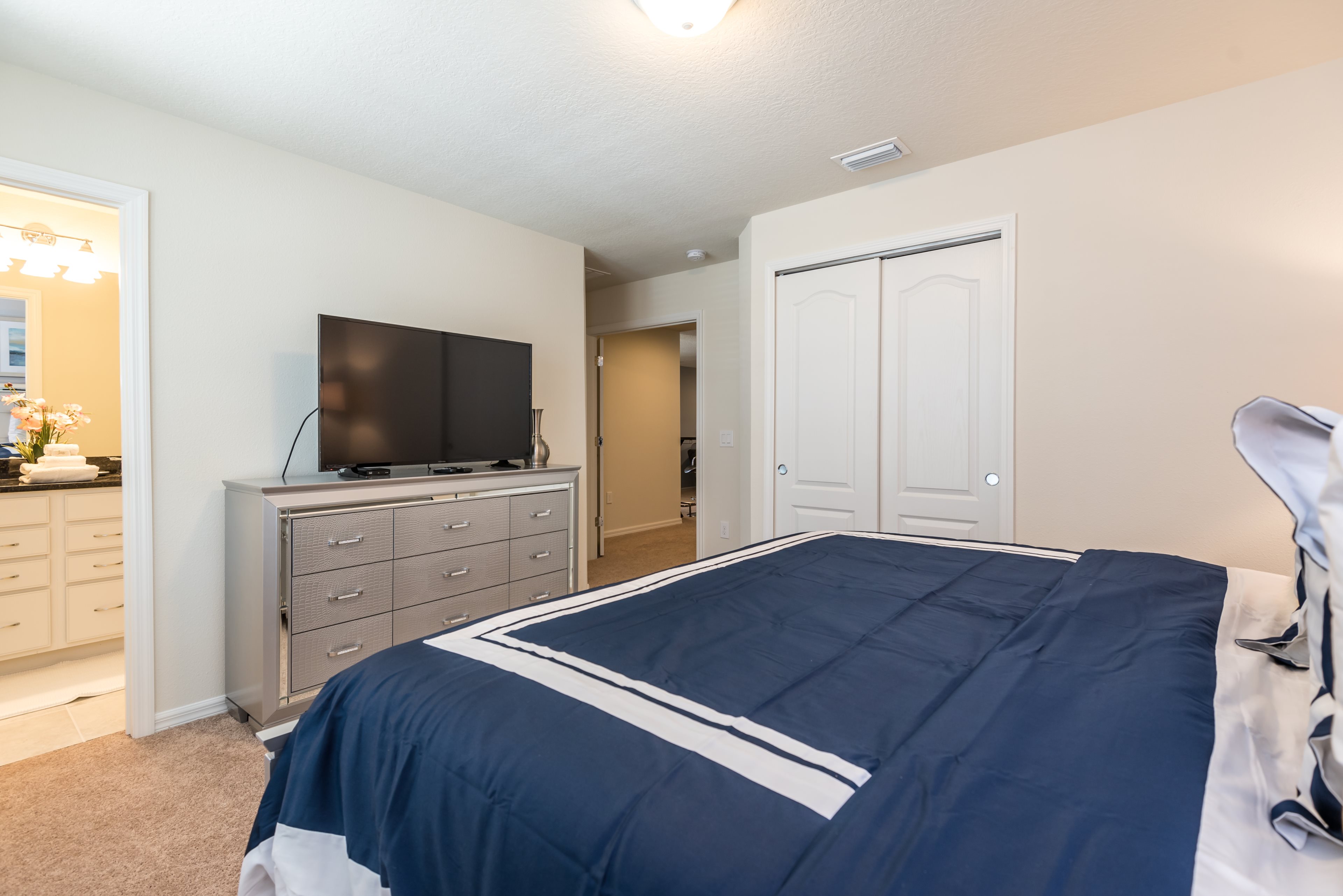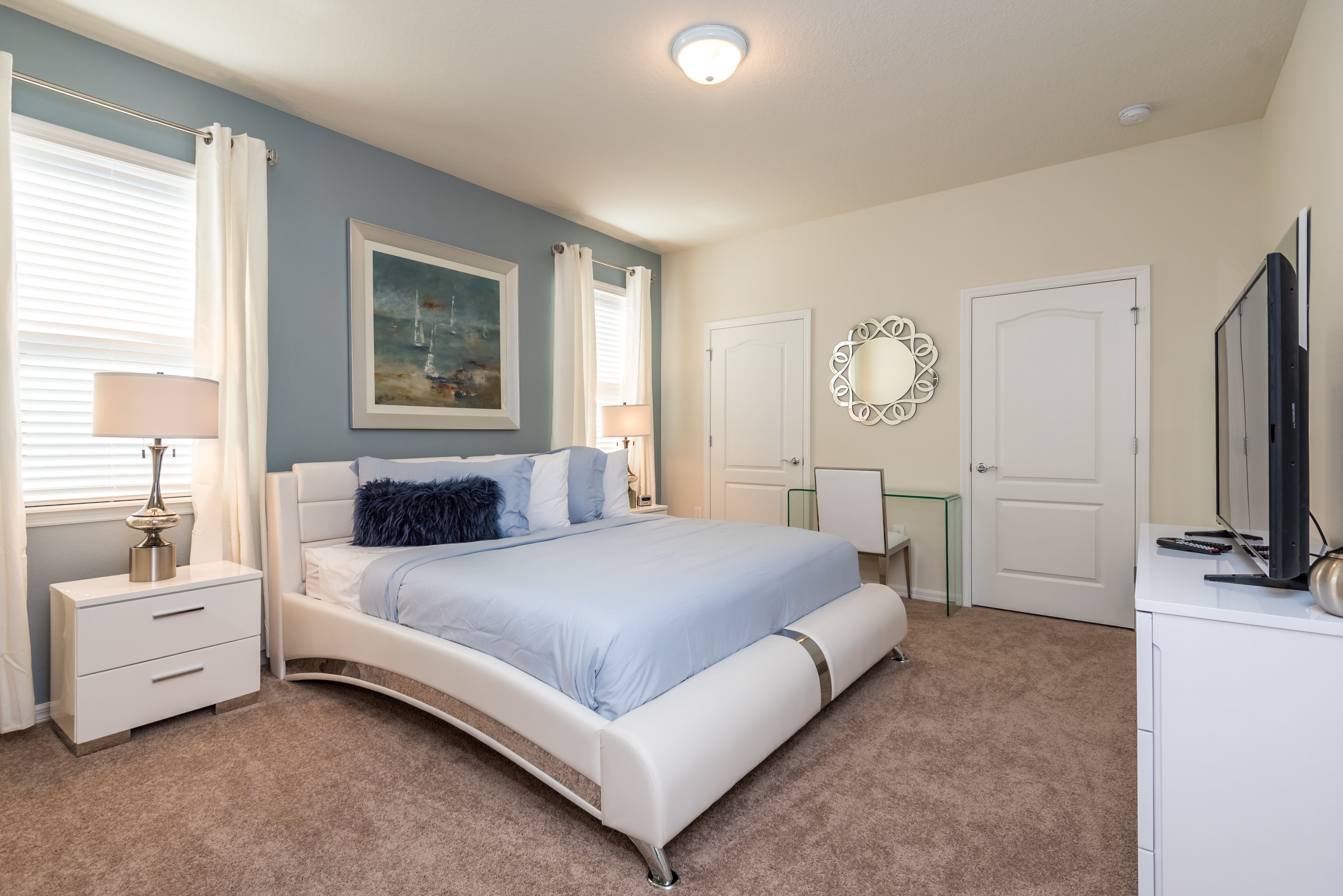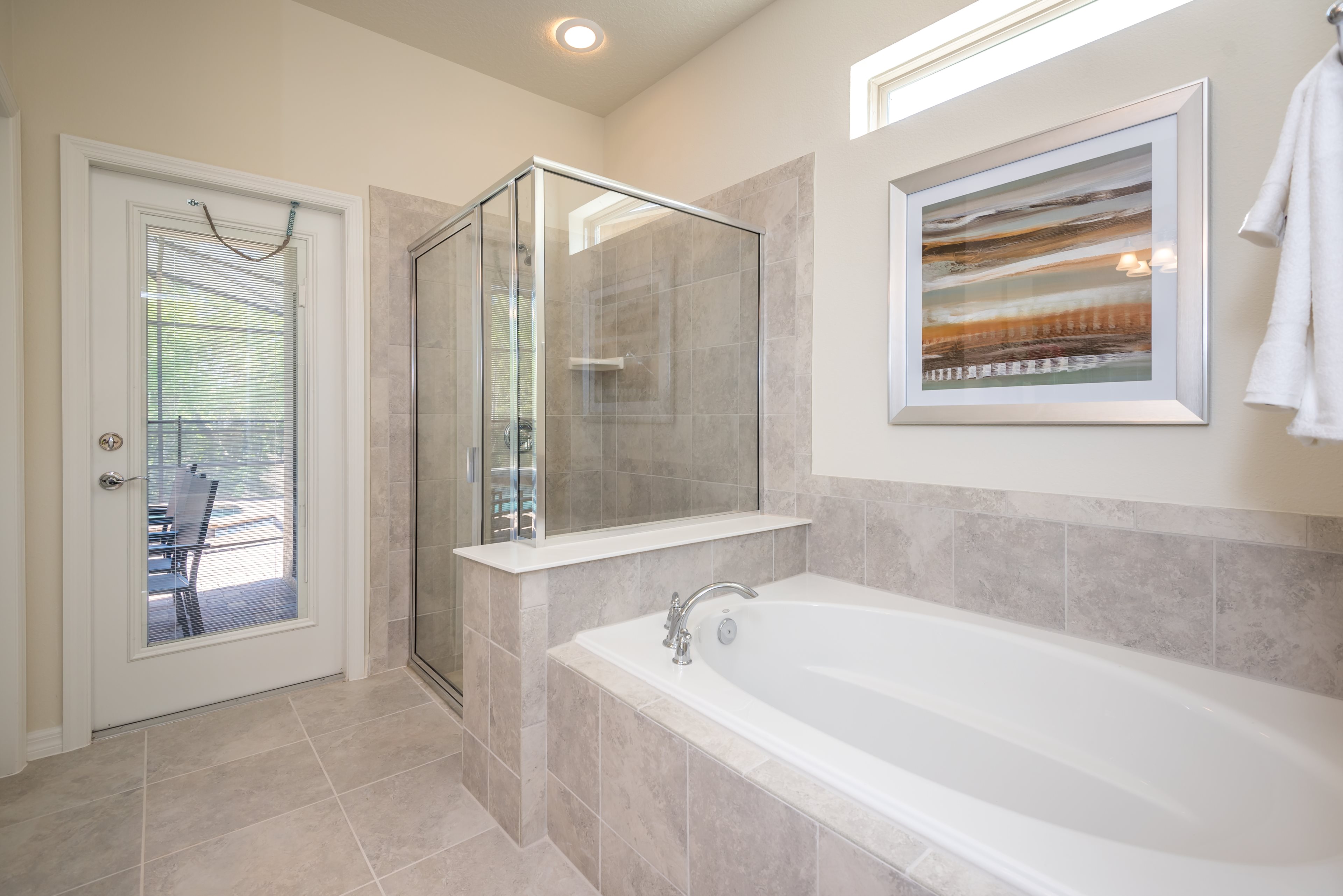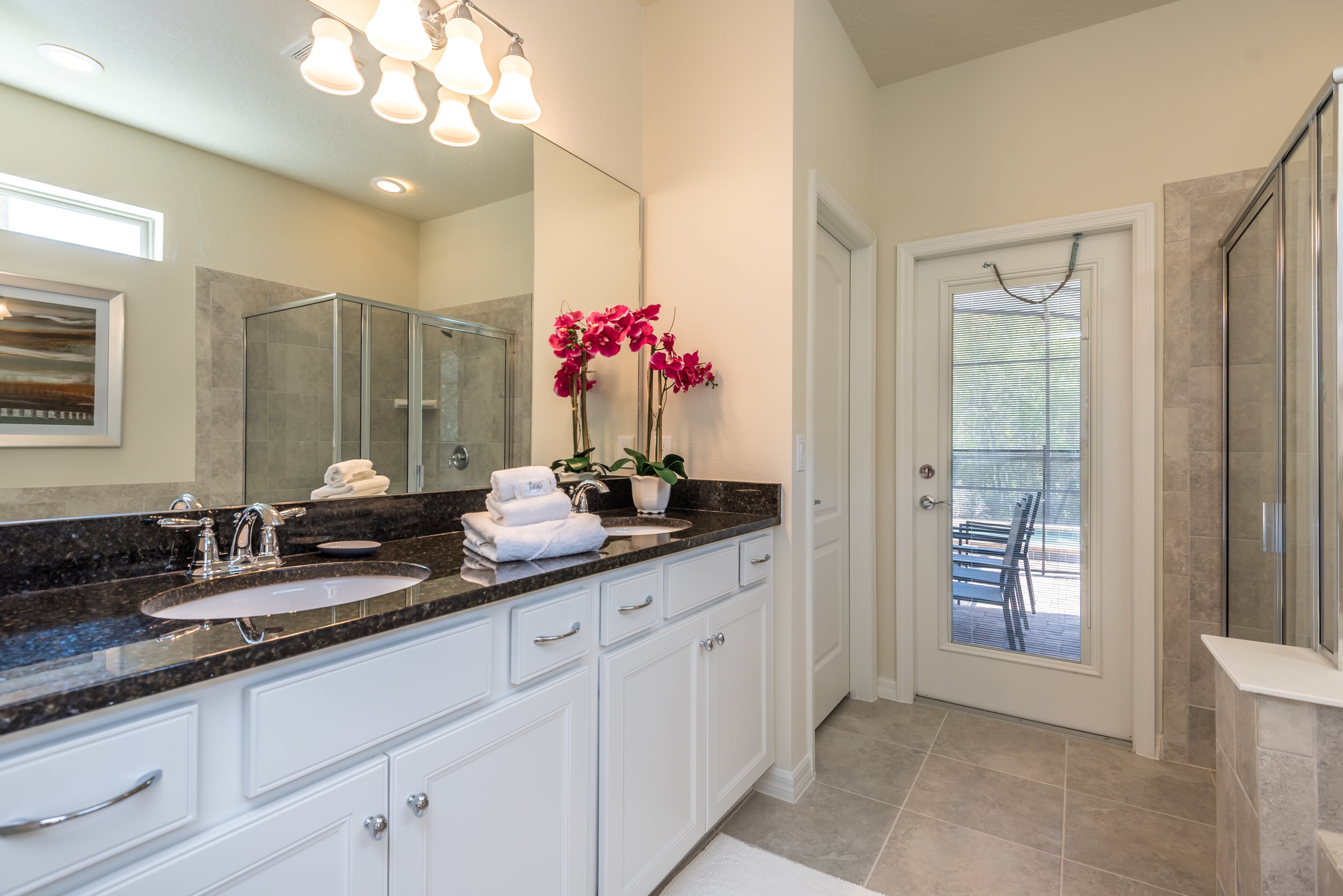 The Master King Suite (Bedroom 1) complete with flat screen HDTV, walk-in closets, toilet, shower, bath tub, double vanity bathroom with tiled floor, granite tops and door to pool area.