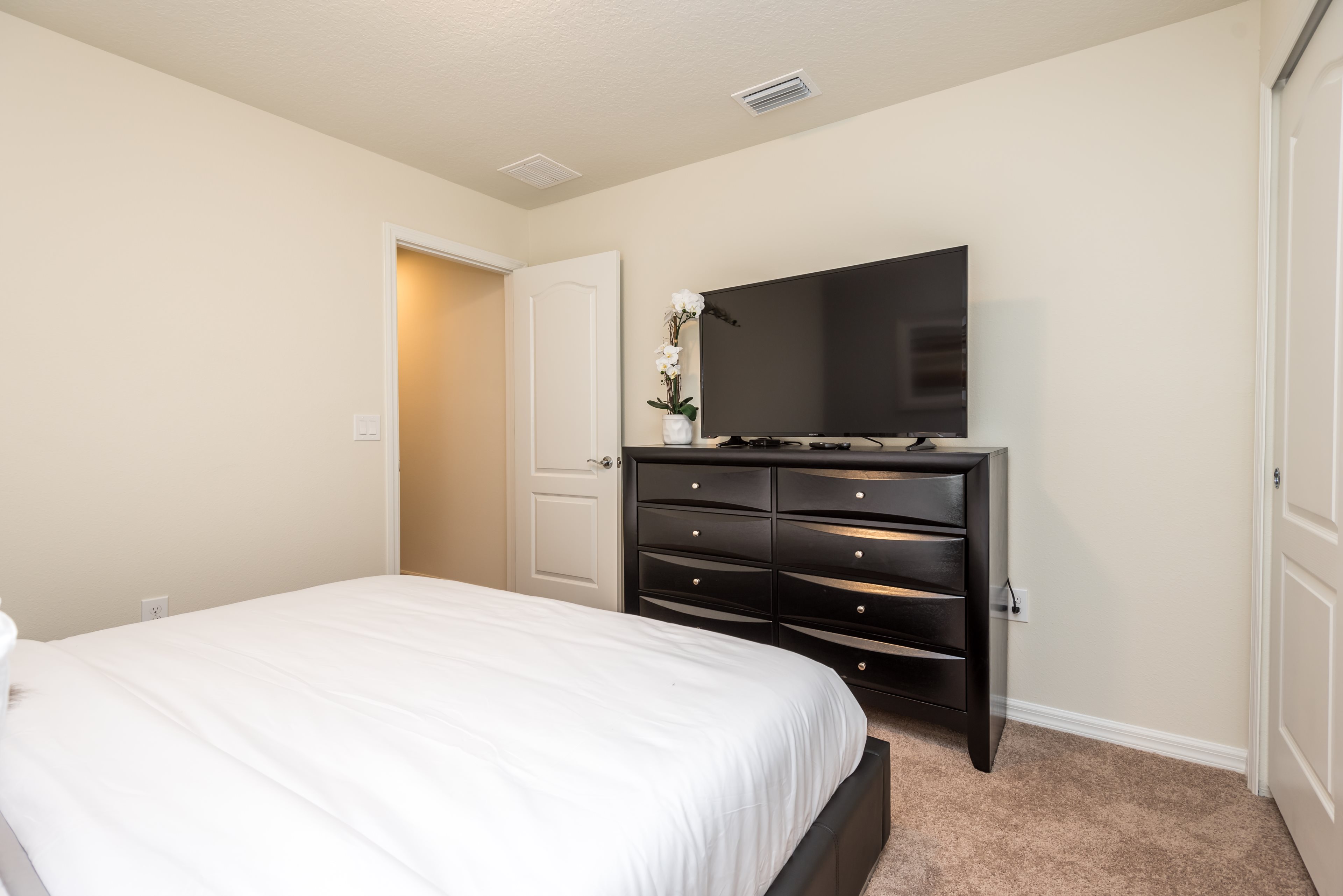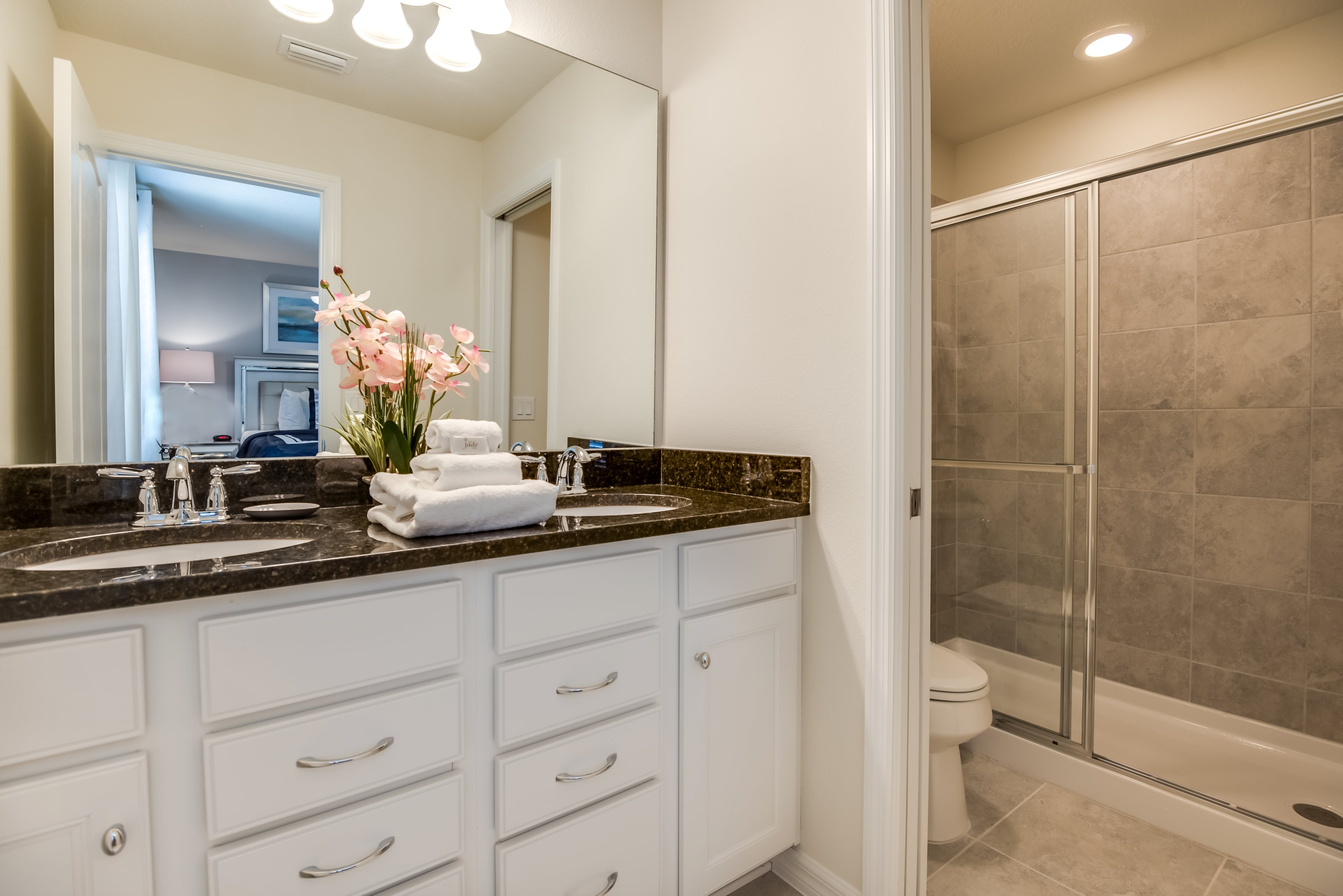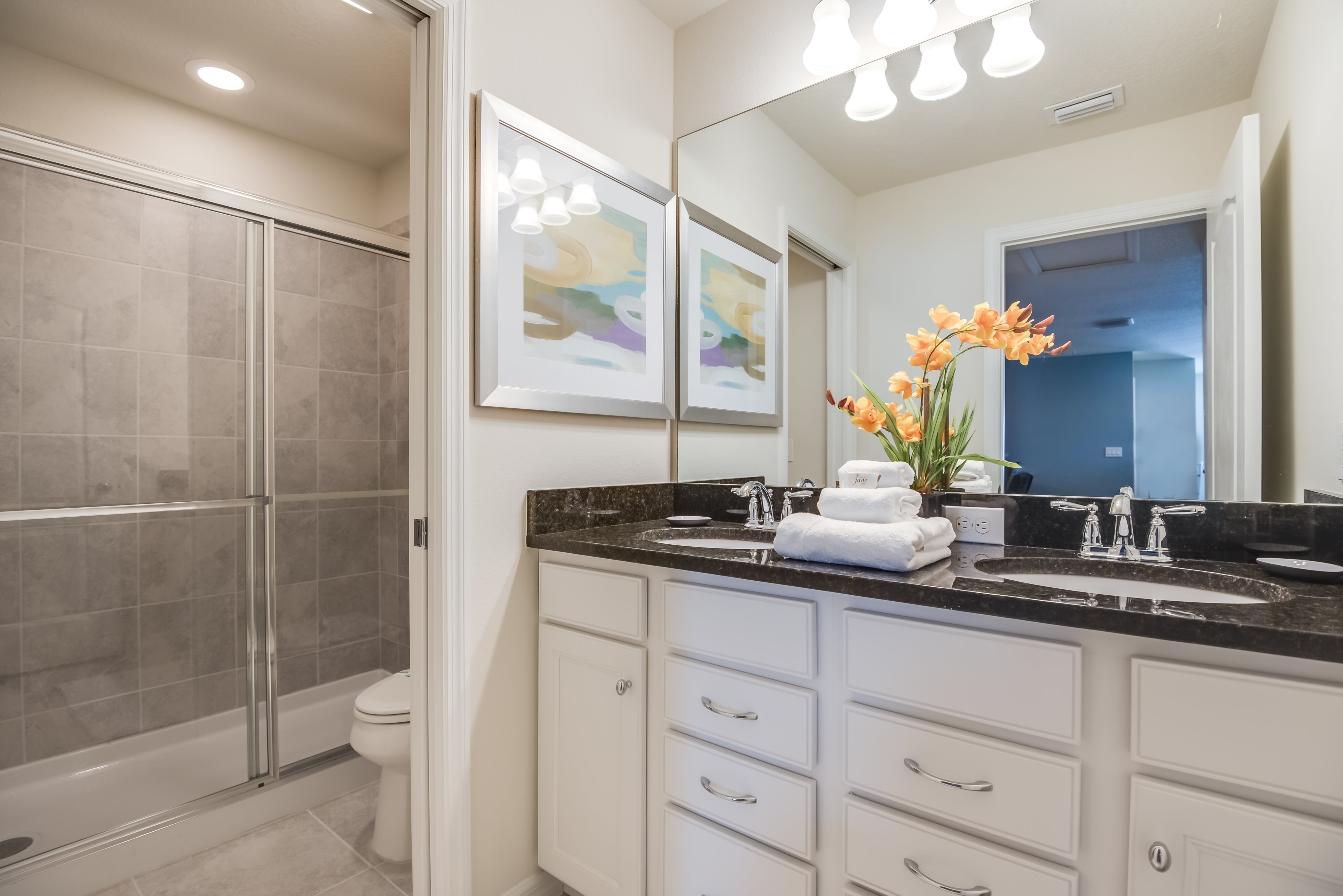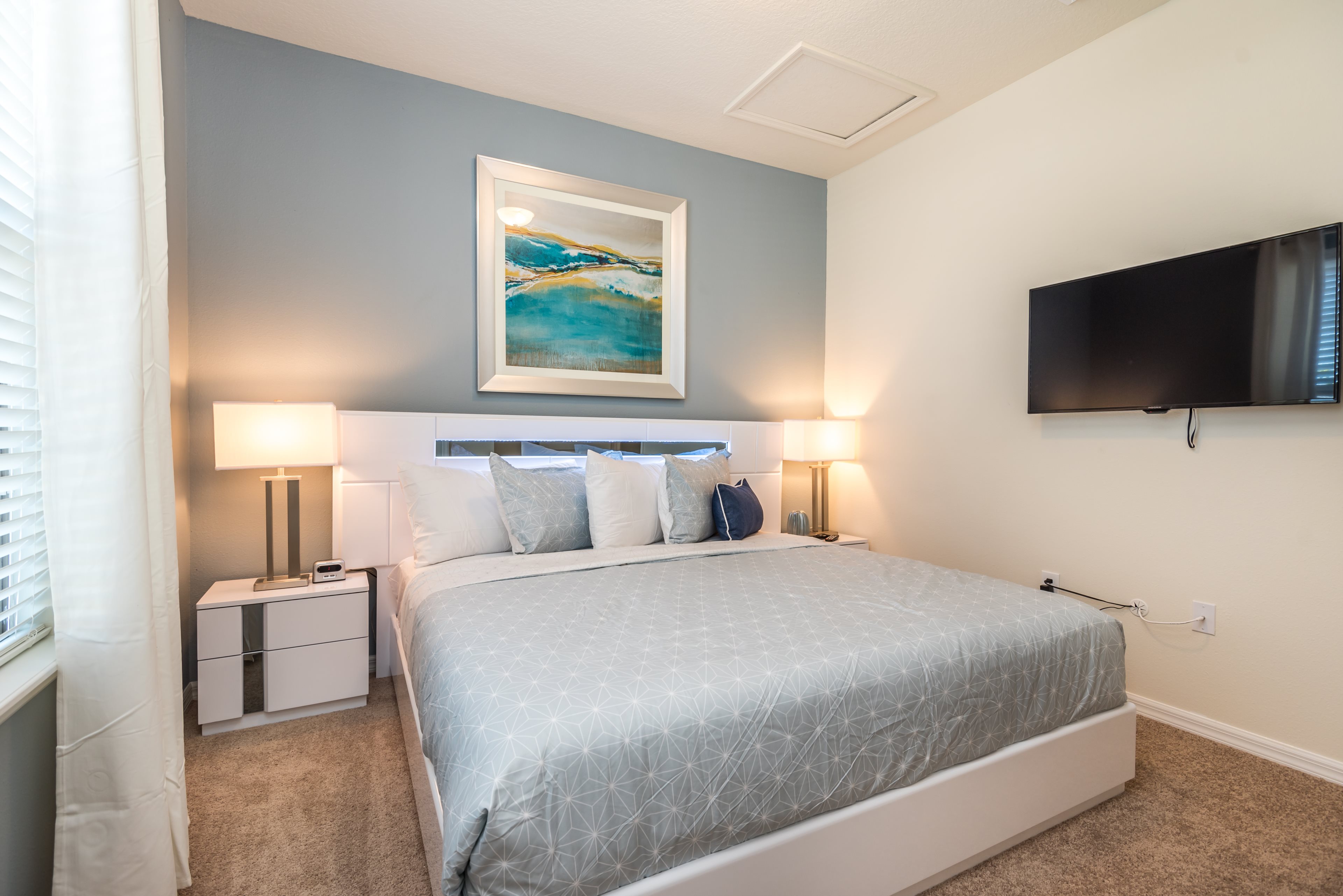 The Master King Suite (Bedroom 1) complete with flat screen HDTV, walk-in closets, toilet, shower, bath tub, double vanity bathroom with tiled floor, granite tops and door to pool area.