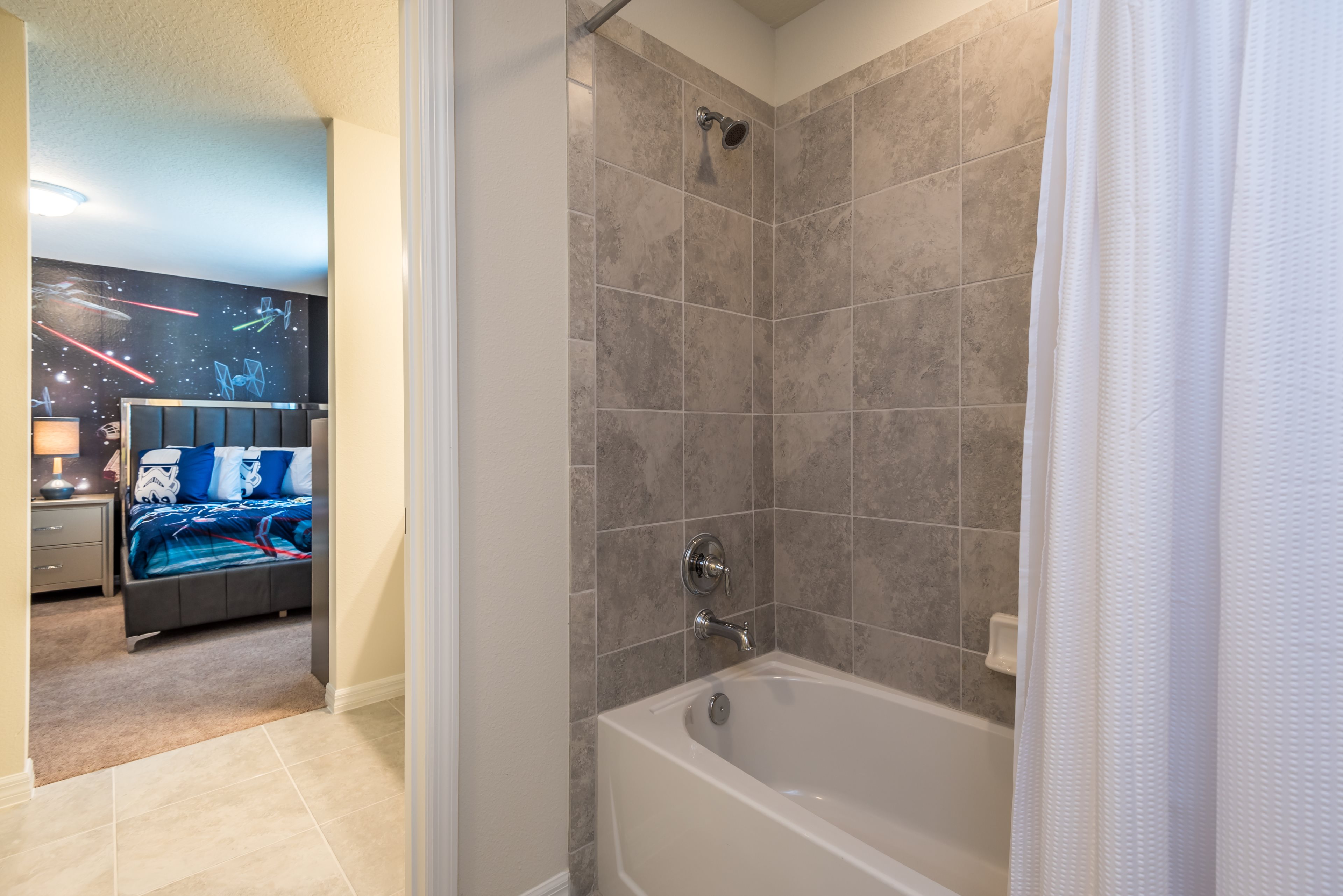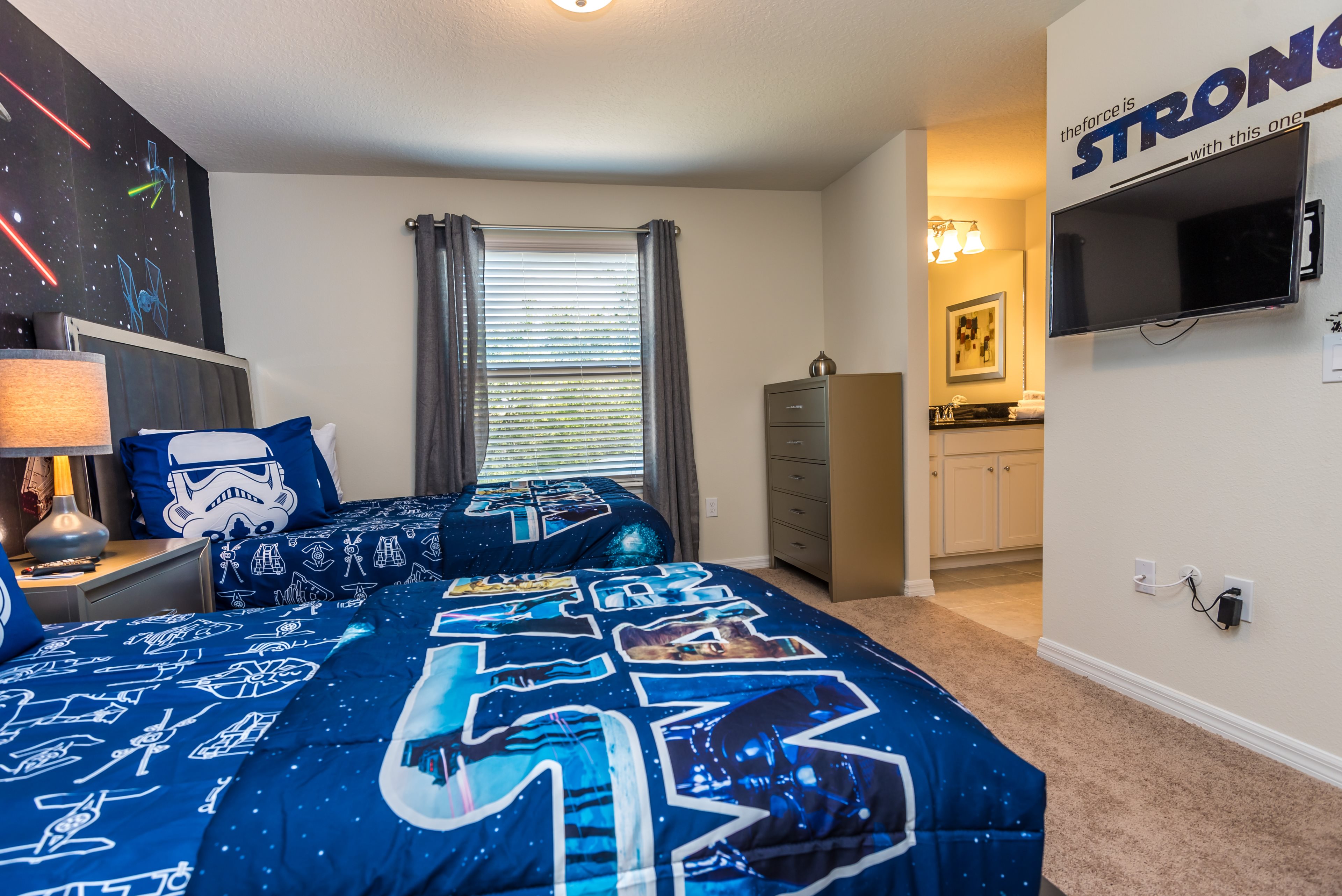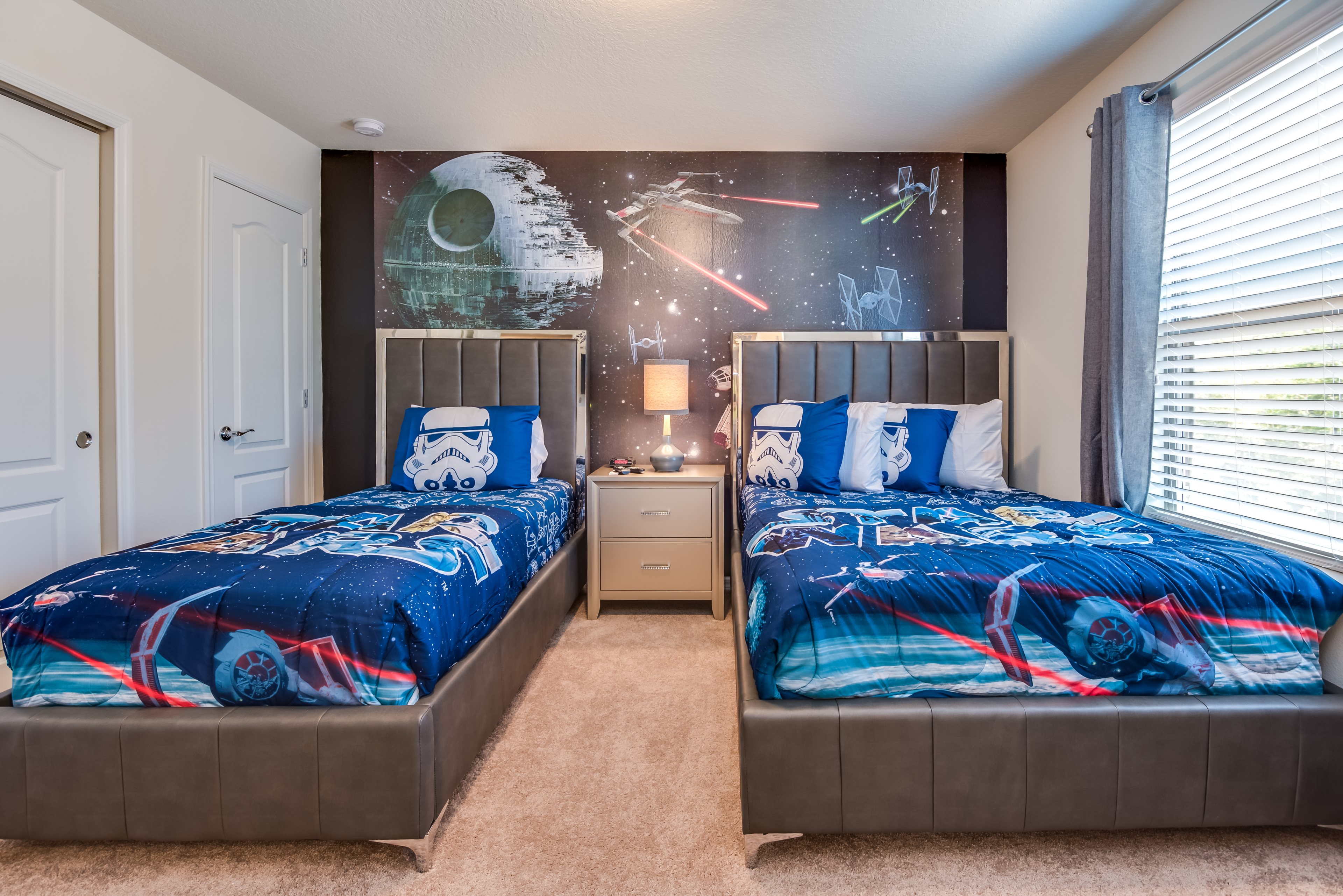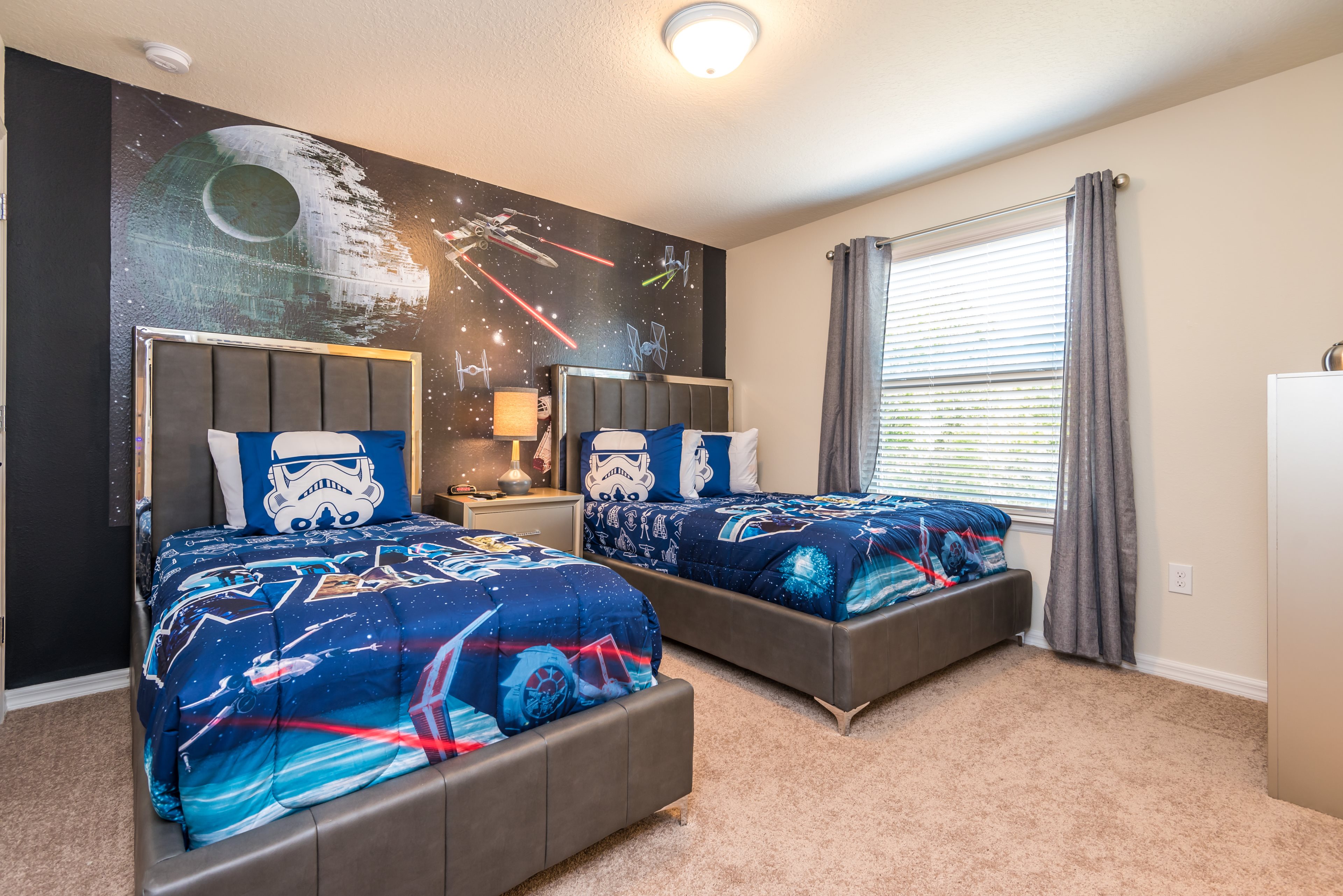 Twin Bedroom (Bedroom 7) with a ‘Secret Passage’ to ‘Frozen’ Bedroom and Jack ‘n’ Jill bathroom comprising of a toilet, shower, double vanity units and sinks.