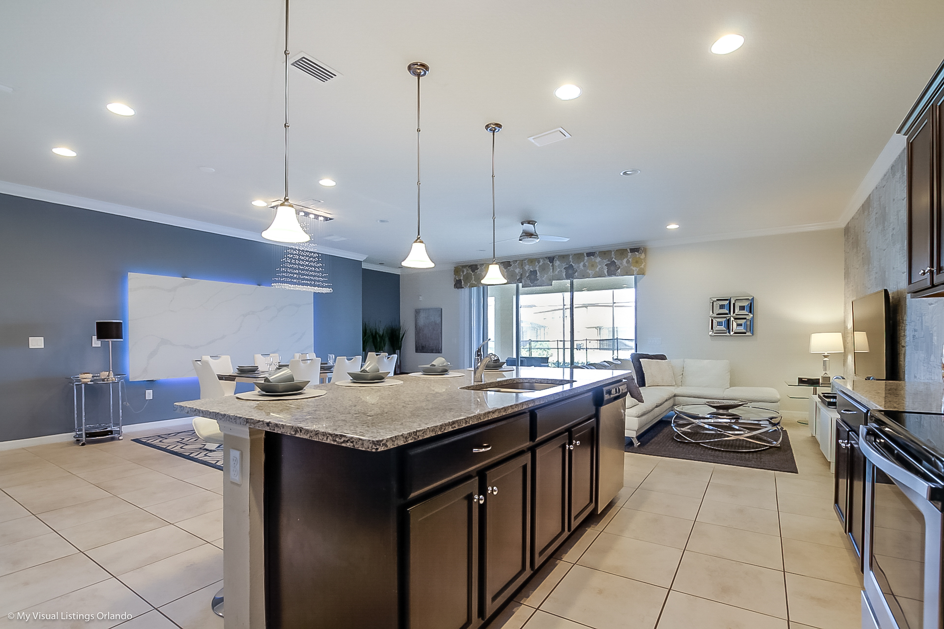 This home has been professionally designed and furnished with luxury, style and comfort. The first floor living areas comprise a Family Room with a spacious sitting area open to the kitchen and dining area.