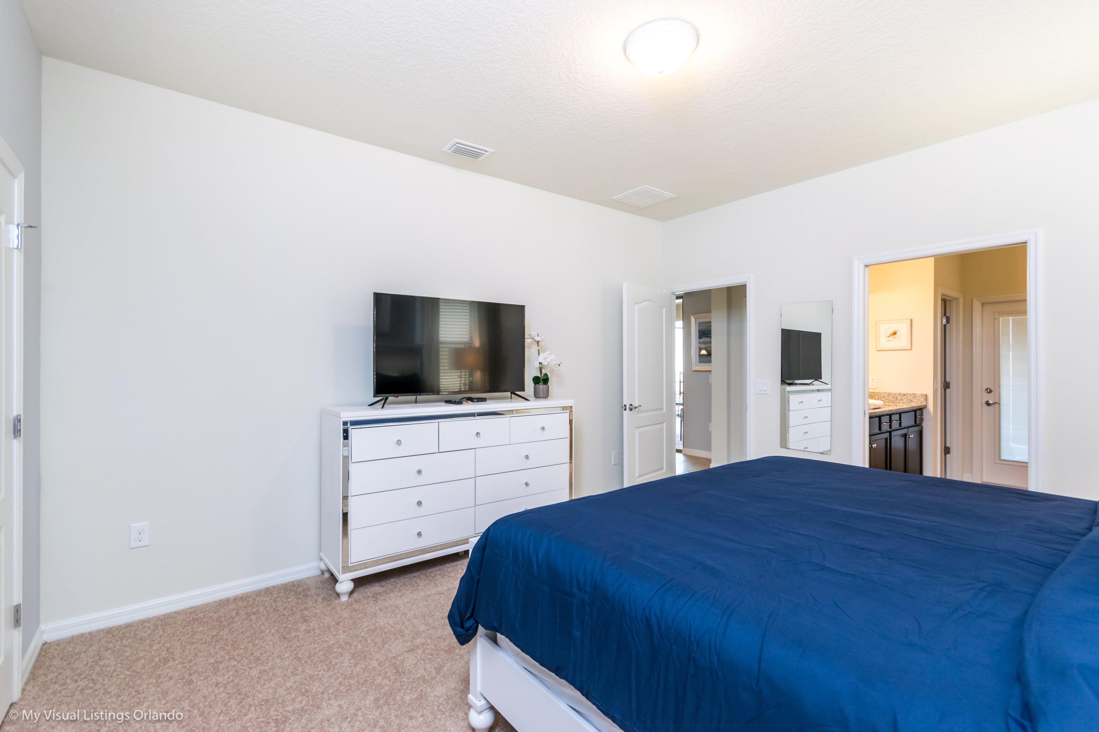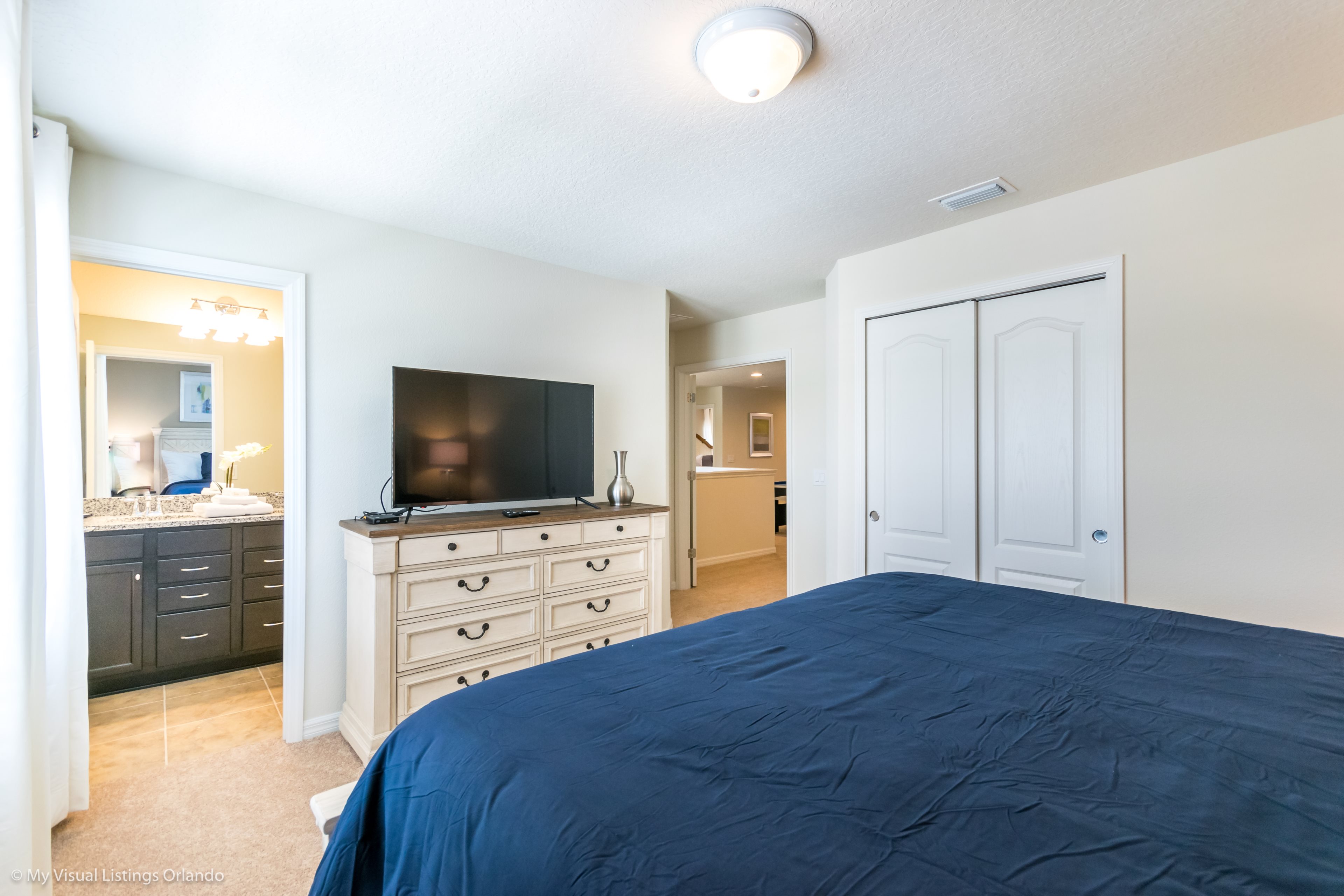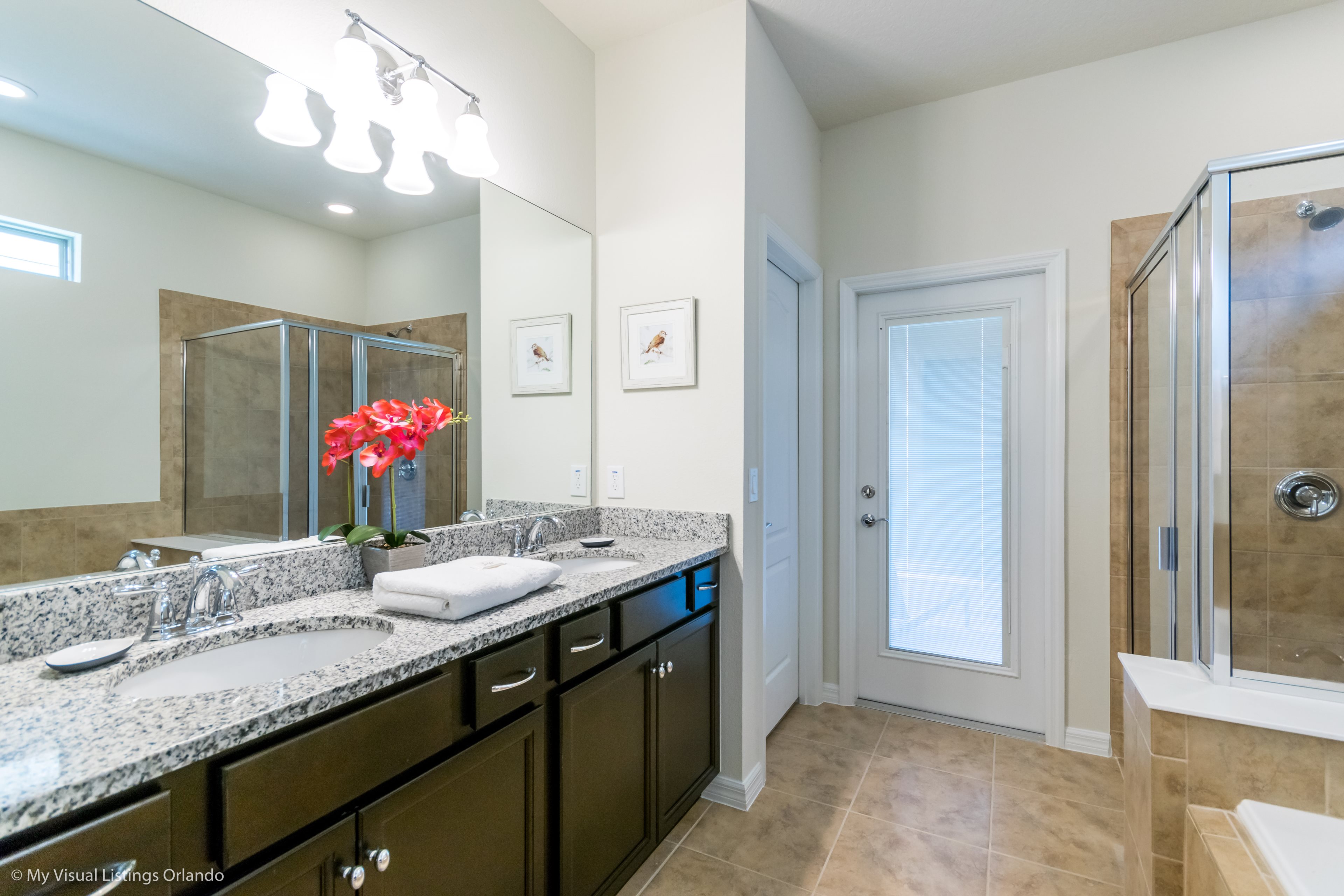 The Master King Suite (Bedroom 1) complete with flat screen HDTV, walk-in closets, toilet, shower, bath tub, double vanity bathroom with tiled floor, granite tops and door to pool area.