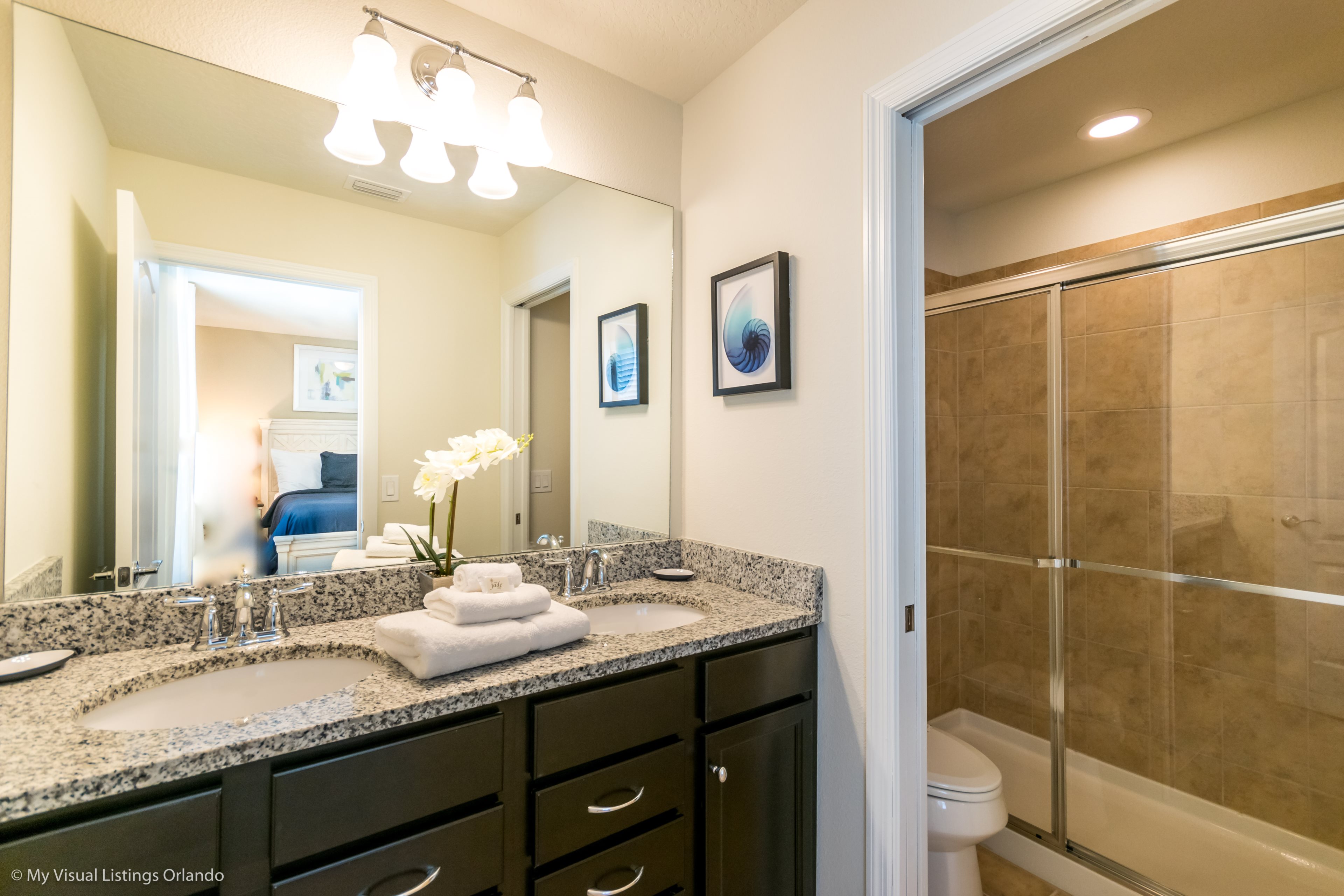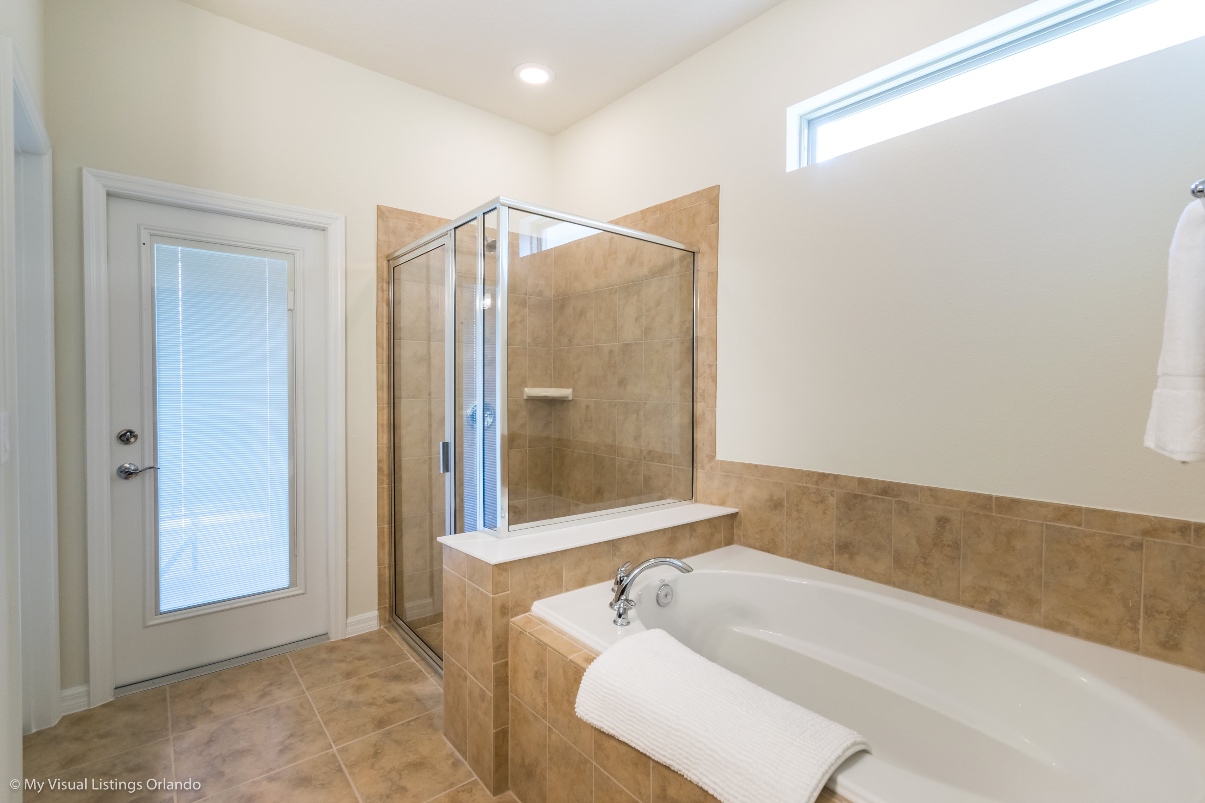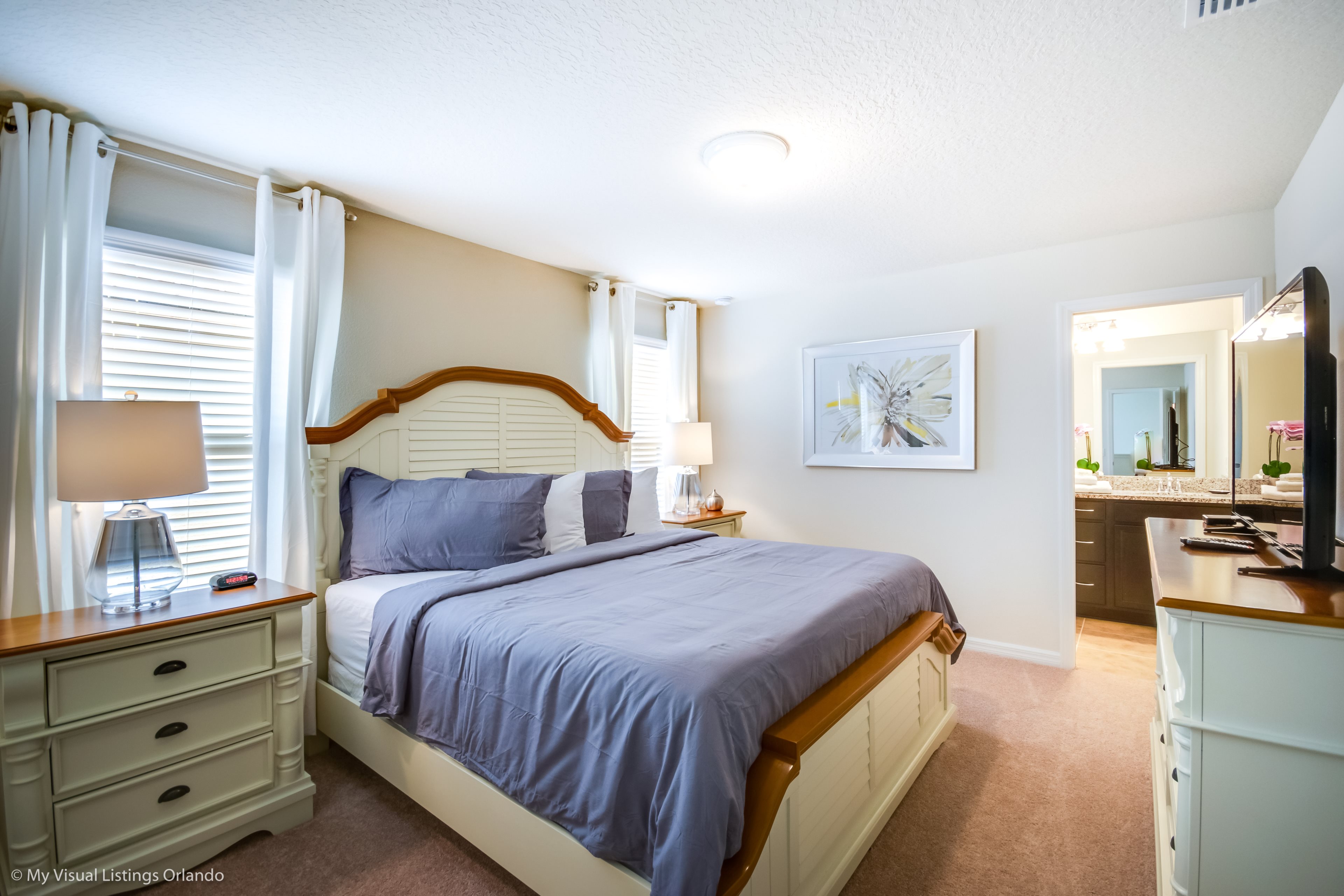 The Master King Suite (Bedroom 1) complete with flat screen HDTV, walk-in closets, toilet, shower, bath tub, double vanity bathroom with tiled floor, granite tops and door to pool area.