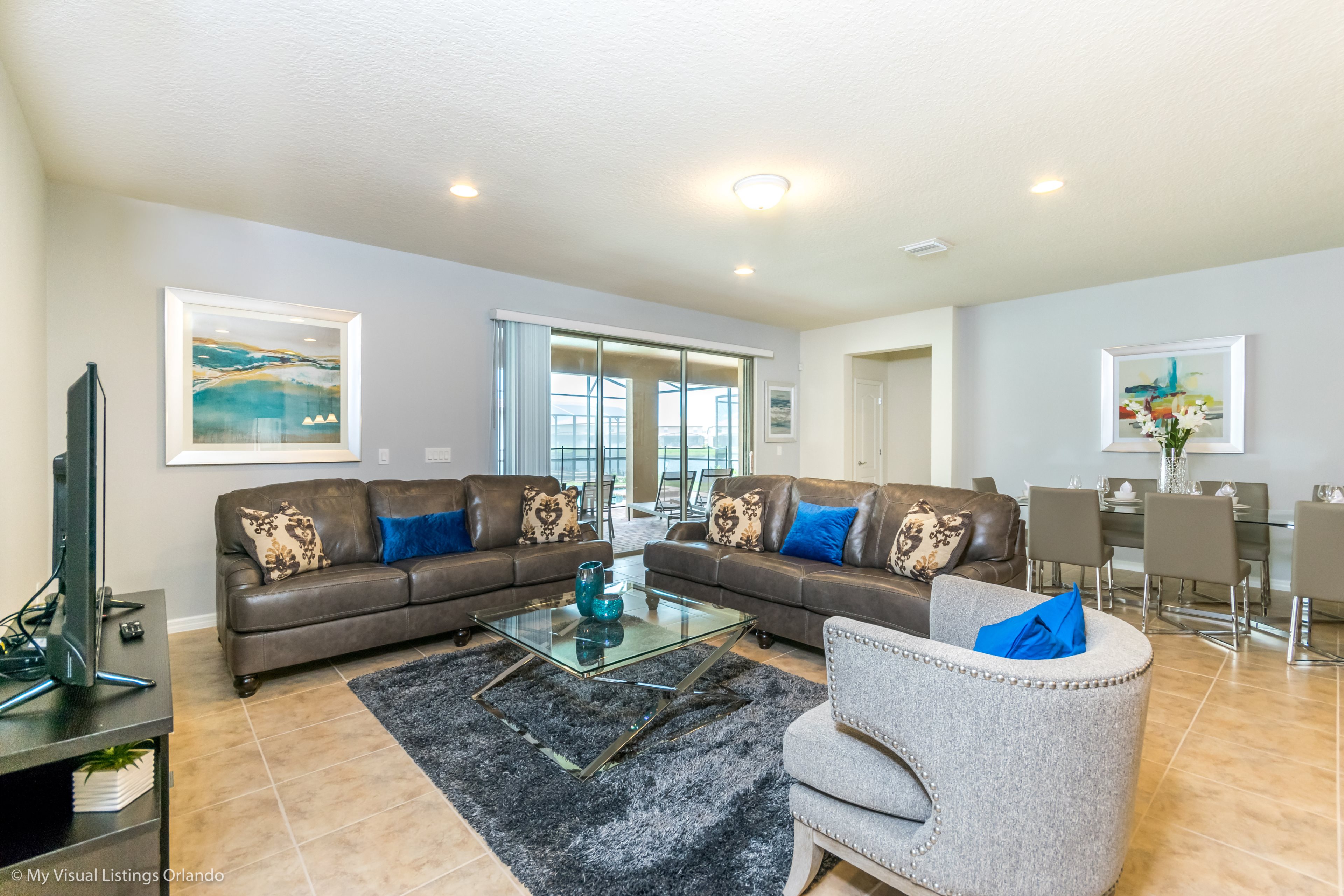 The Family Room is vast, with soft seating, side tables & lamps, beautiful wall decorations and a wall mounted 60” flat screen HDTV. Three huge glass patio windows offer an unparalleled view of the outdoor swimming pool and:
