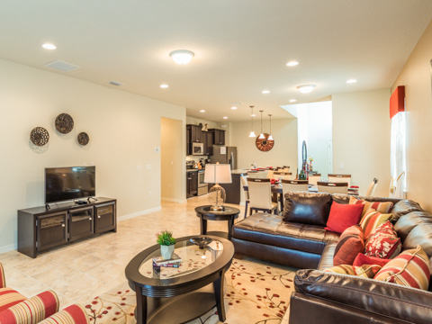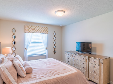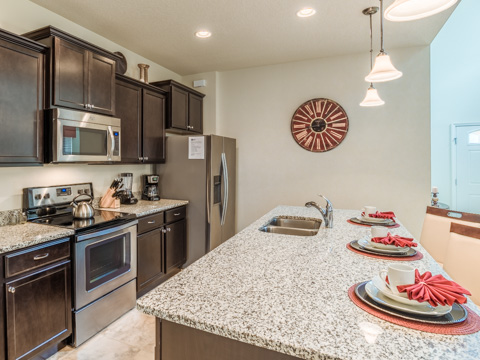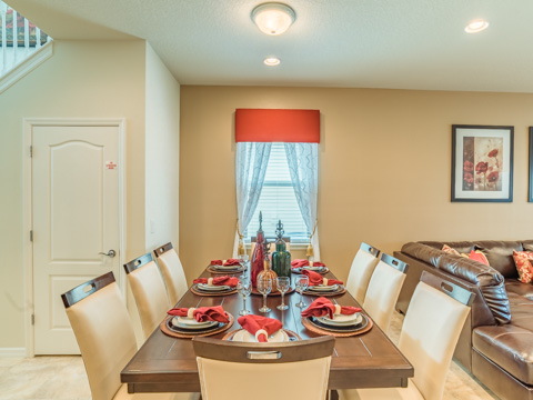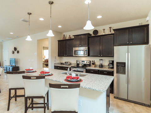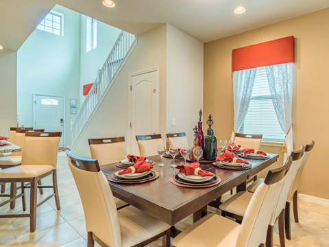 With a total of 6 bedrooms and 4.5-baths, this large home sleeps 12 comfortably. Step into each professionally designed room, and relaxation awaits. The front door opens up to tall ceilings, which lead into a large kitchen and dining room. The kitchen boasts all upgrades any chef would be proud of including granite countertops and updated cabinetry. The dining room table is the perfect place for the family to share their stories of the day at the theme parks.